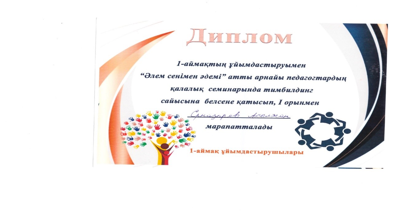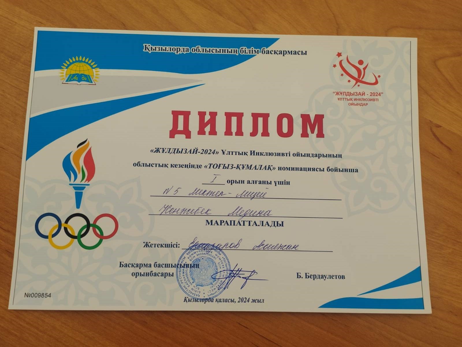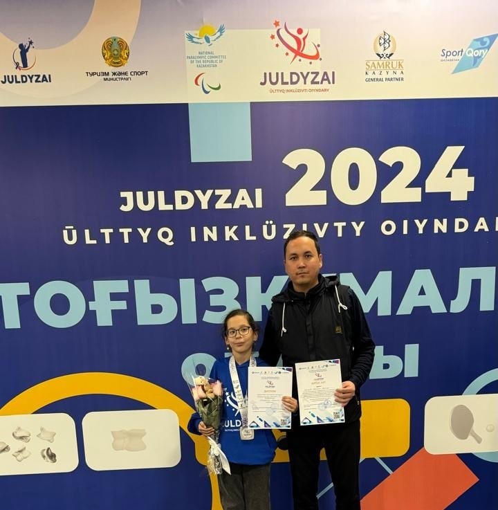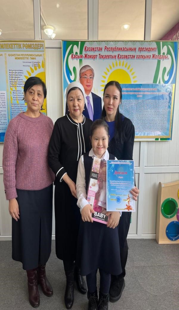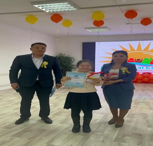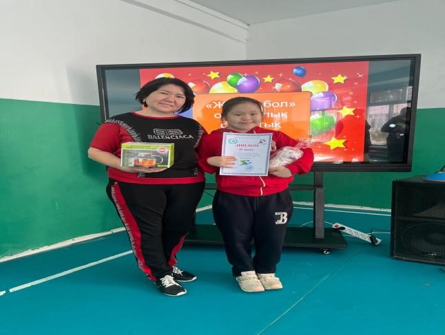 Мектебімізде ерекше оқушыларды ортаға тарту, оңашаламау мақсатында спорттық, қозғалыстық эстафеталық шара өткізілді «Жүйрік бол» деген тақырыпта ұйымдастырылған шараға анасымен бірге қызығушылықпен қатысып, II-орын дәрежелі дипломмен марапатталды.