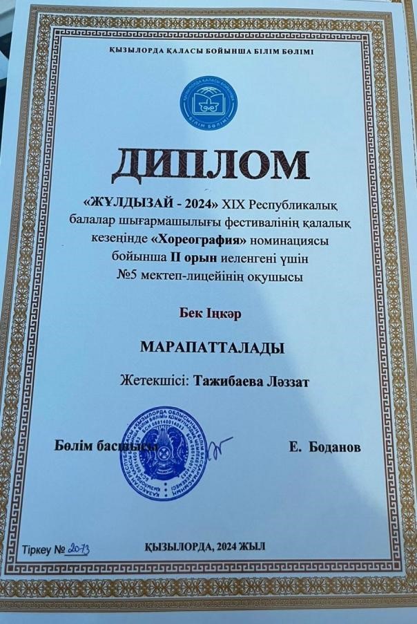Ерекше білім беру қажеттіліктері бар балалардың шығармашылық қабілеттерін дамыту мақсатында ұйымдастырылған «JULDYZAI» XVIII облыстық балалар шығармашылығы фестивалінің қалалық кезеңінде «Би» номинациясы бойынша II орын иеленді.