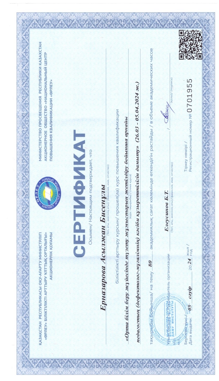 7 Ә сыныбында оқитын Сағымбаева Алина танымдық іс-әрекетін анықтау үшін дефектологтың алғашқы қабылдауы өткізілді. Соған сүйене отырып, даму деңгейі анықталды. Даму деңгейінде өзгеріс бар, себебі бұл баланың қызығушылығы былтырғыдан артты.