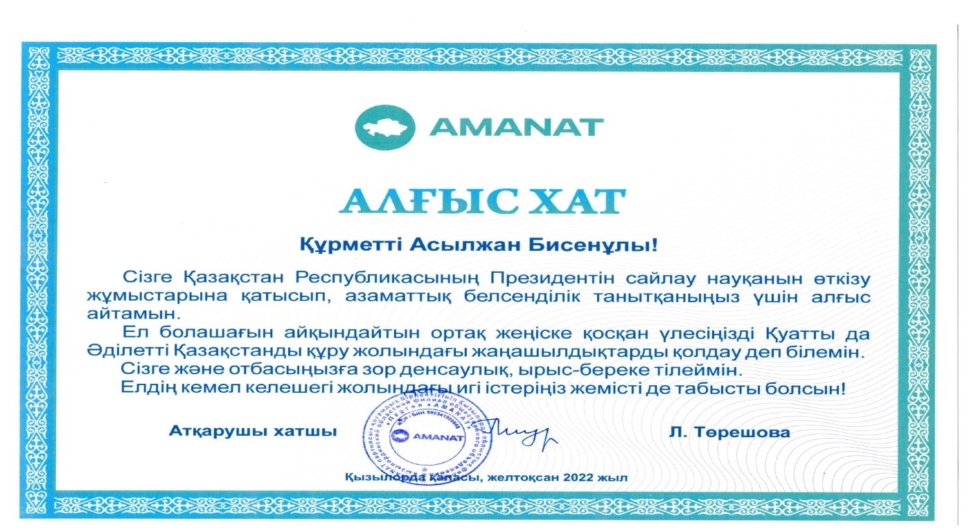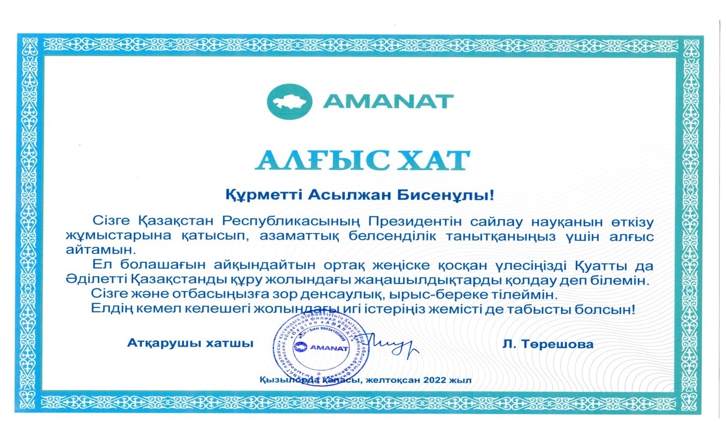 «Қазан - бүкіләлемдік Даун Синдромы туралы ақпараттандыру» айы аясында өткізілетін «Күн сәулелі балалар» тақырыбындағы іс-шараға белсене қатысып, алғыс хатпен марапатталды.