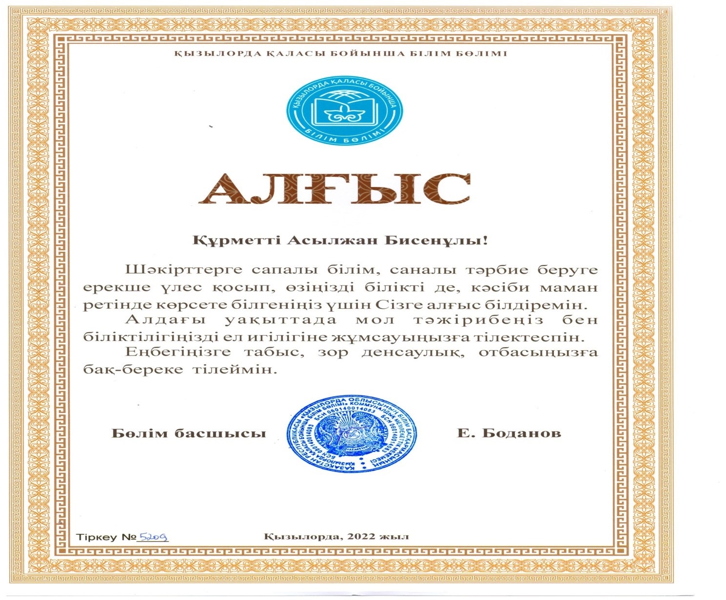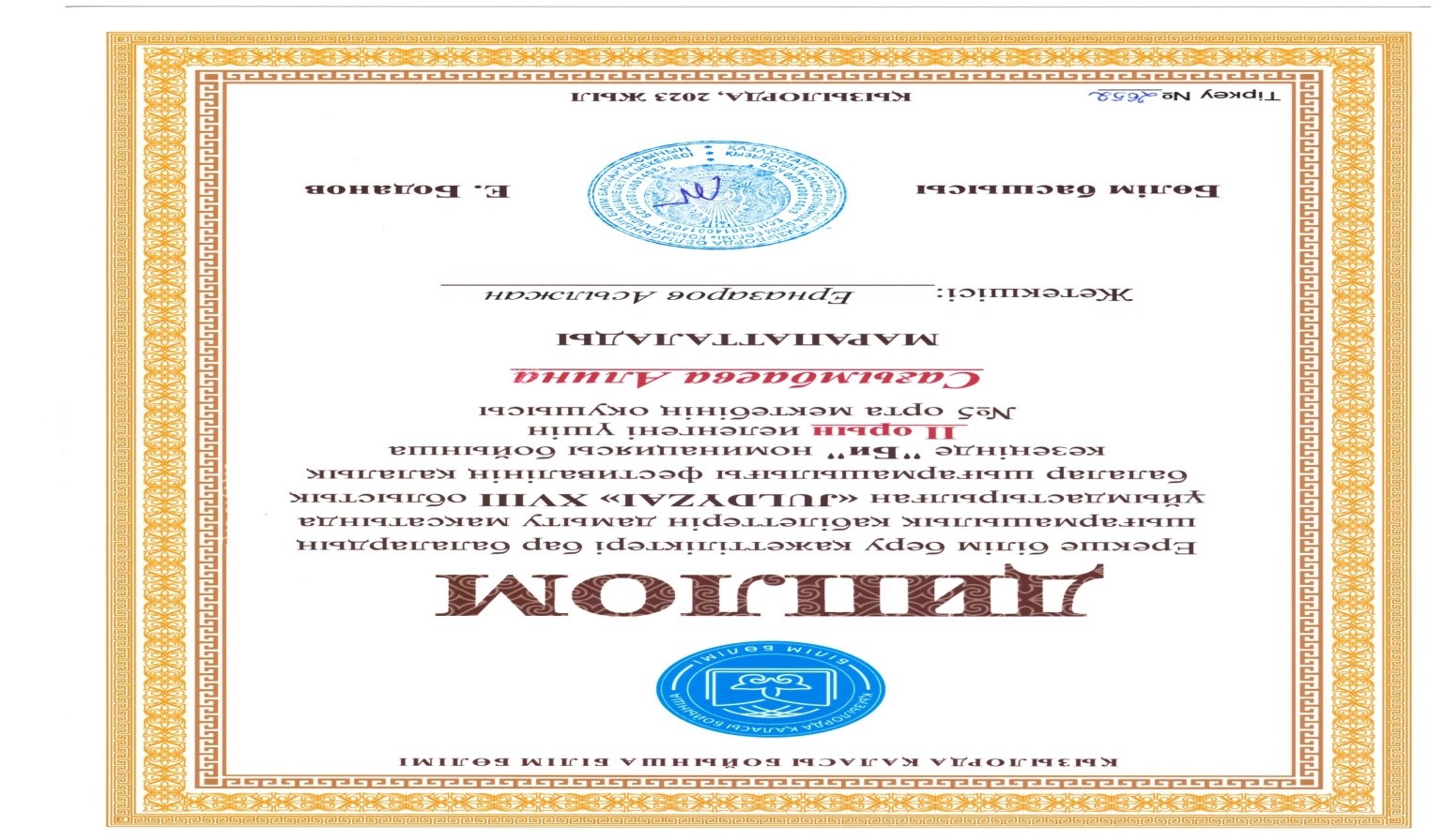 2022-2023 оқу жылында: Сағымбаева Алина - қалалық «Менің қолымнан бәрі келеді» олимпиадасынан, қазақ тілі-математика пәні бойынша ІІ орын иеленді.