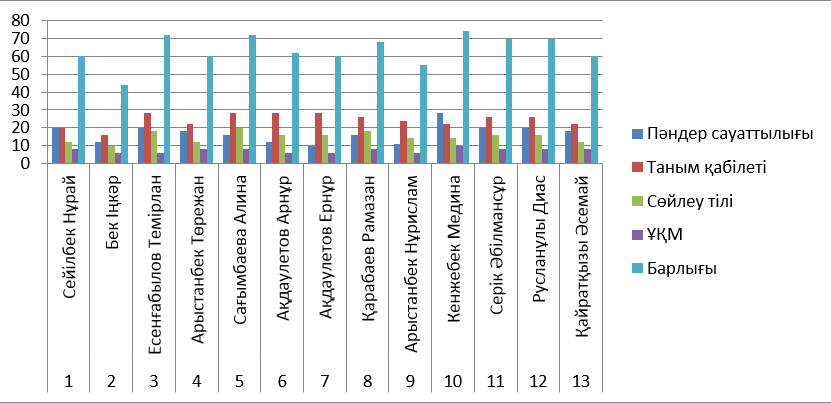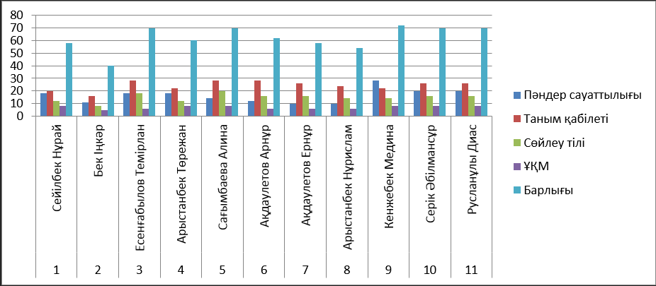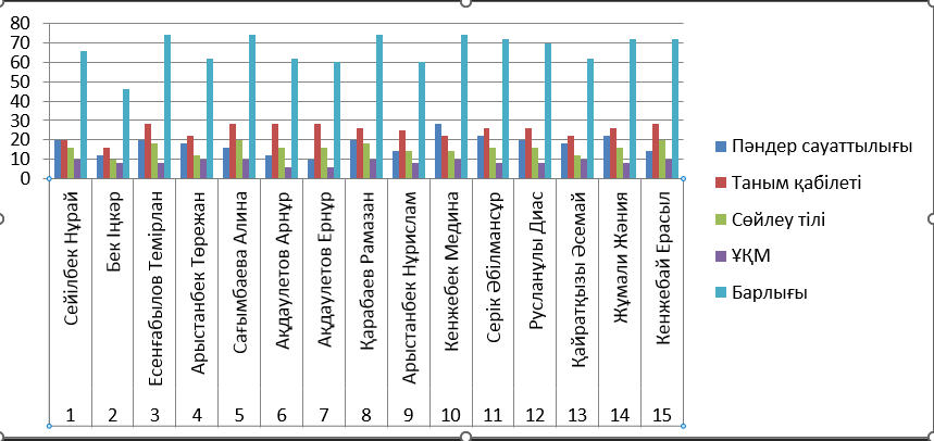 1 В сыныбында оқитын Арыстанбек Нұрислам даму деңгейі жоспарға сәйкес жасалып, анықталды. Бірақ баланың дефектологқа деген қызығушылығы жақсы, сол себепті ағымдағы оқу жылында даму деңгейі жоғарылады. Келер оқу жылы да ата-ананың рұқсатын алып, бұдан да жоғары нәтижеге жетеміз деген үміттеміз.