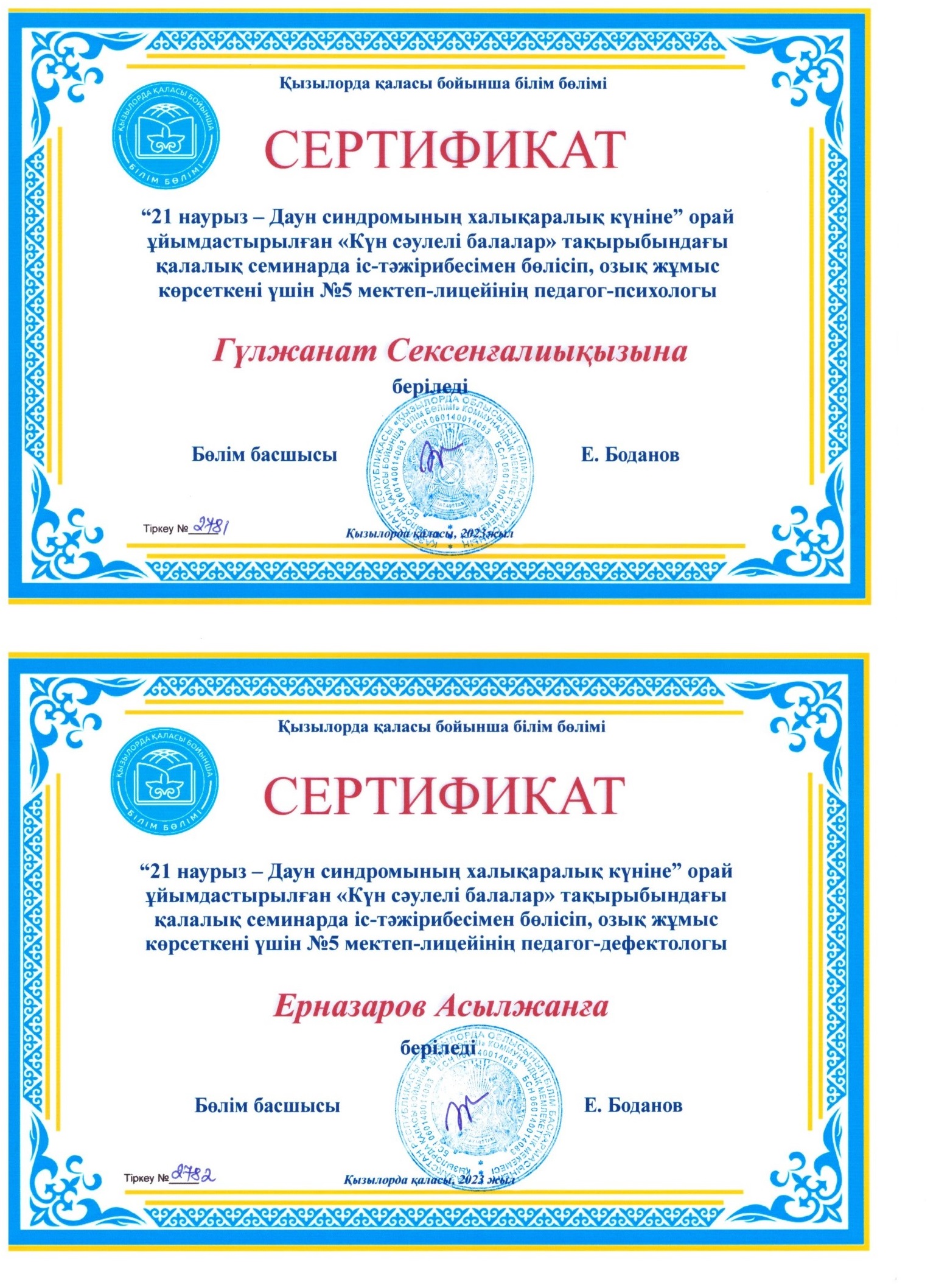 2023 жылдың 15 наурыз күні И.В.Панфилов атындағы №5 мектеп-лицейінде 21 наурыз Халықаралық Даун синдромы бар адамдар күніне орай «Күн сәулелі балалар» тақырыбында қалалық семинар өткізілді.