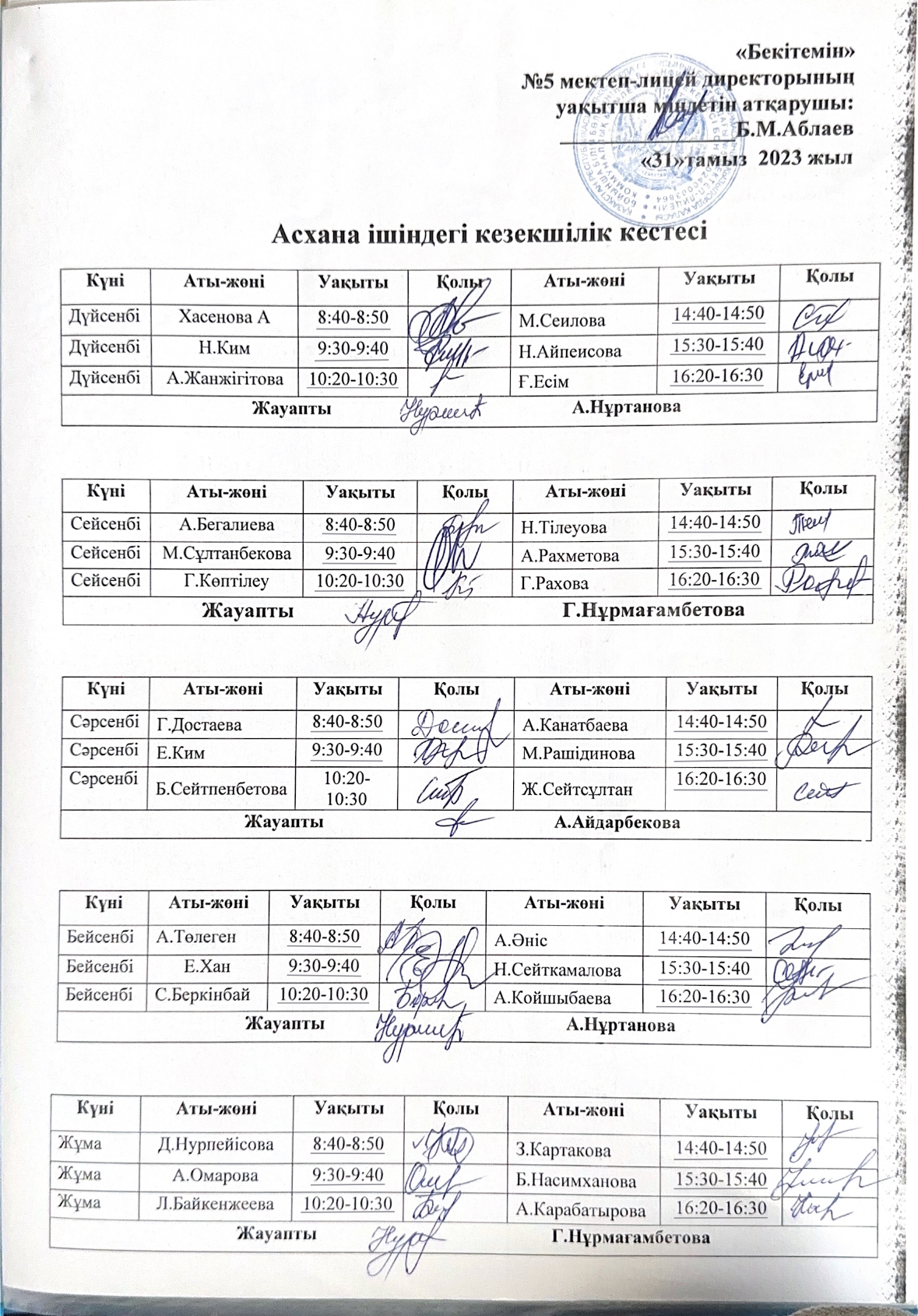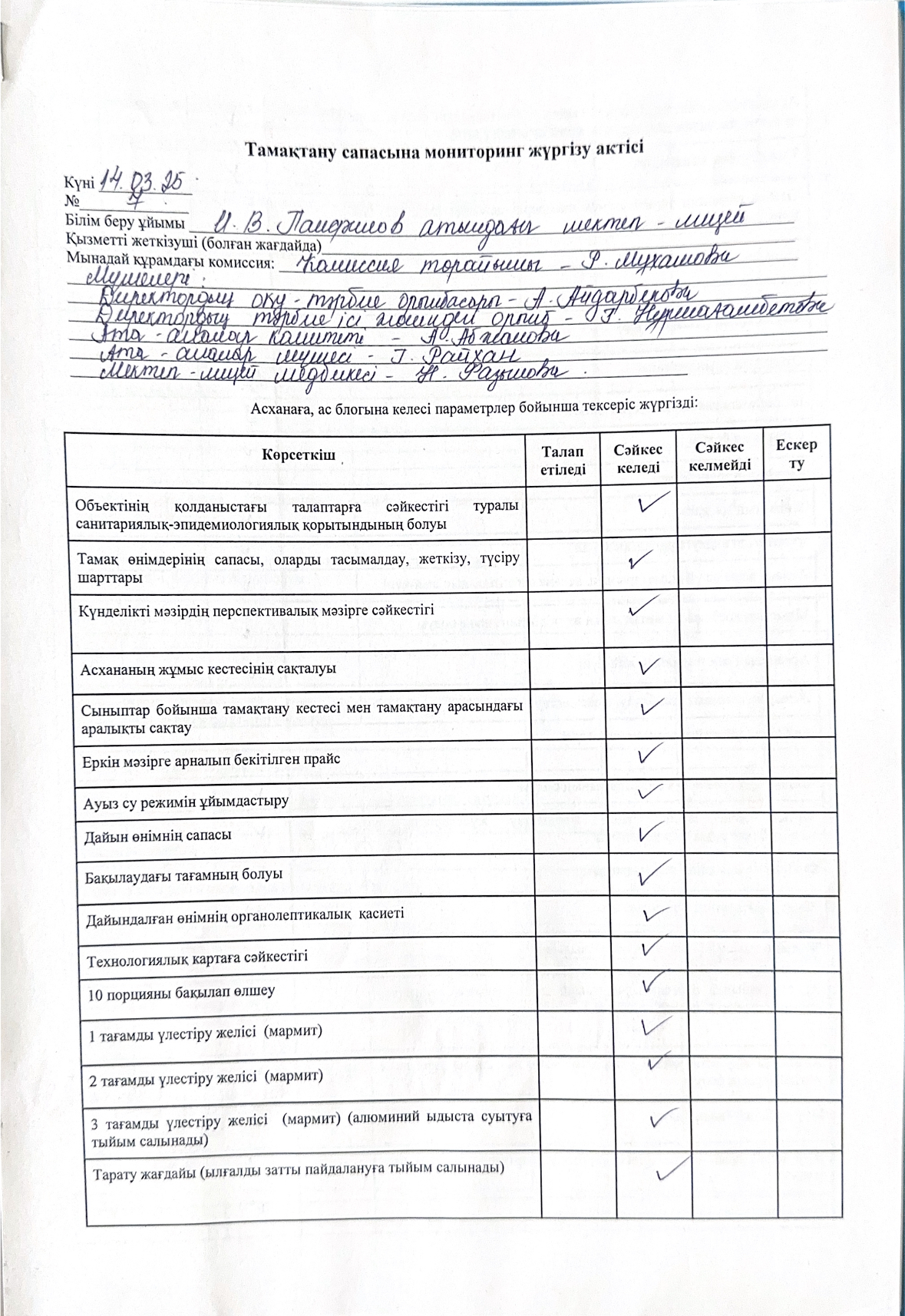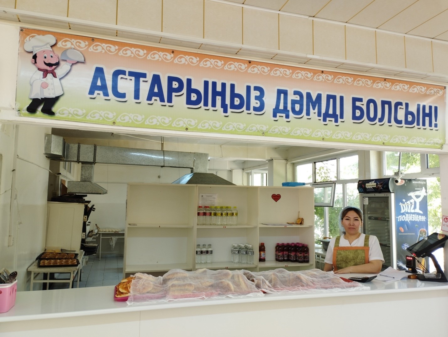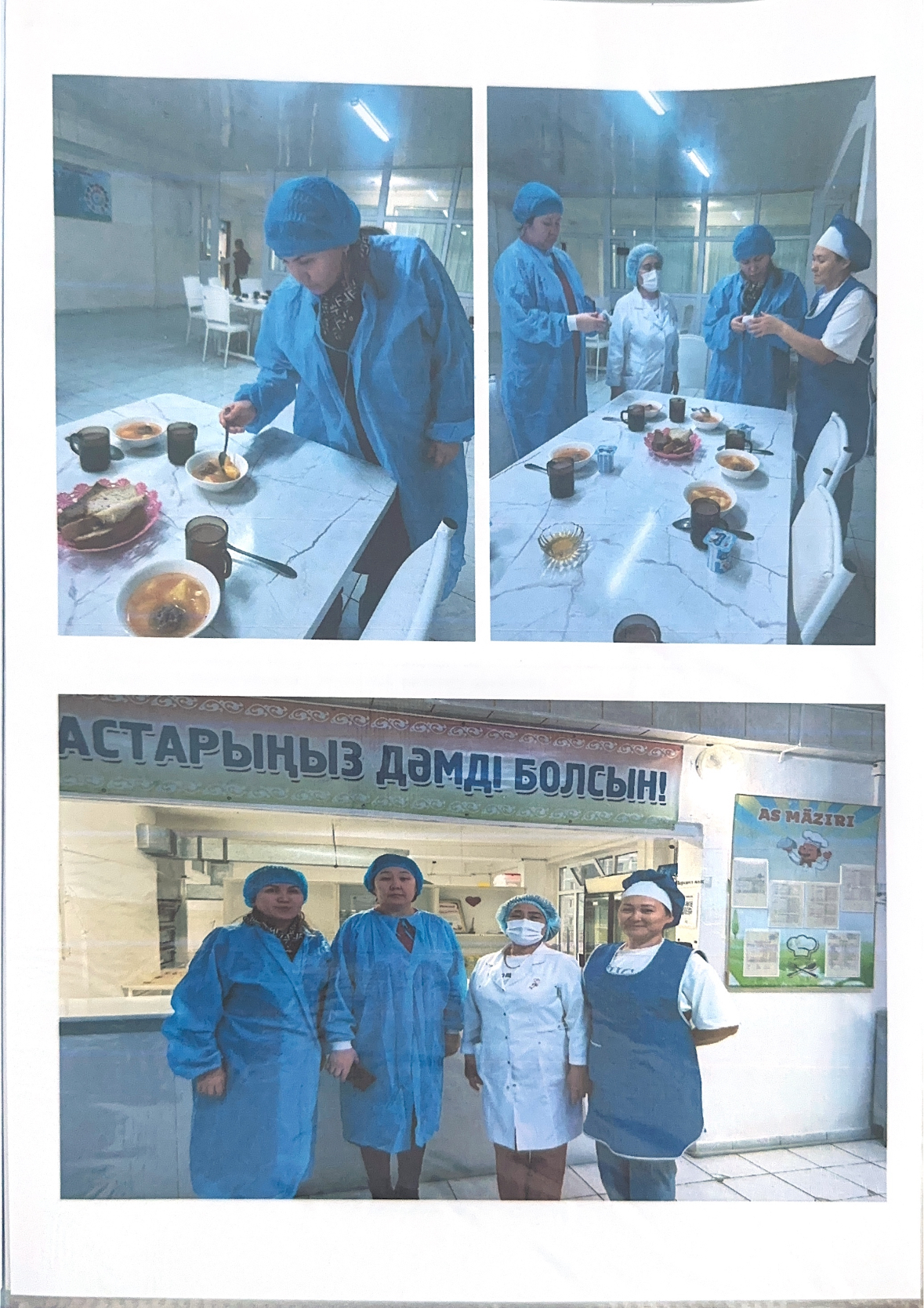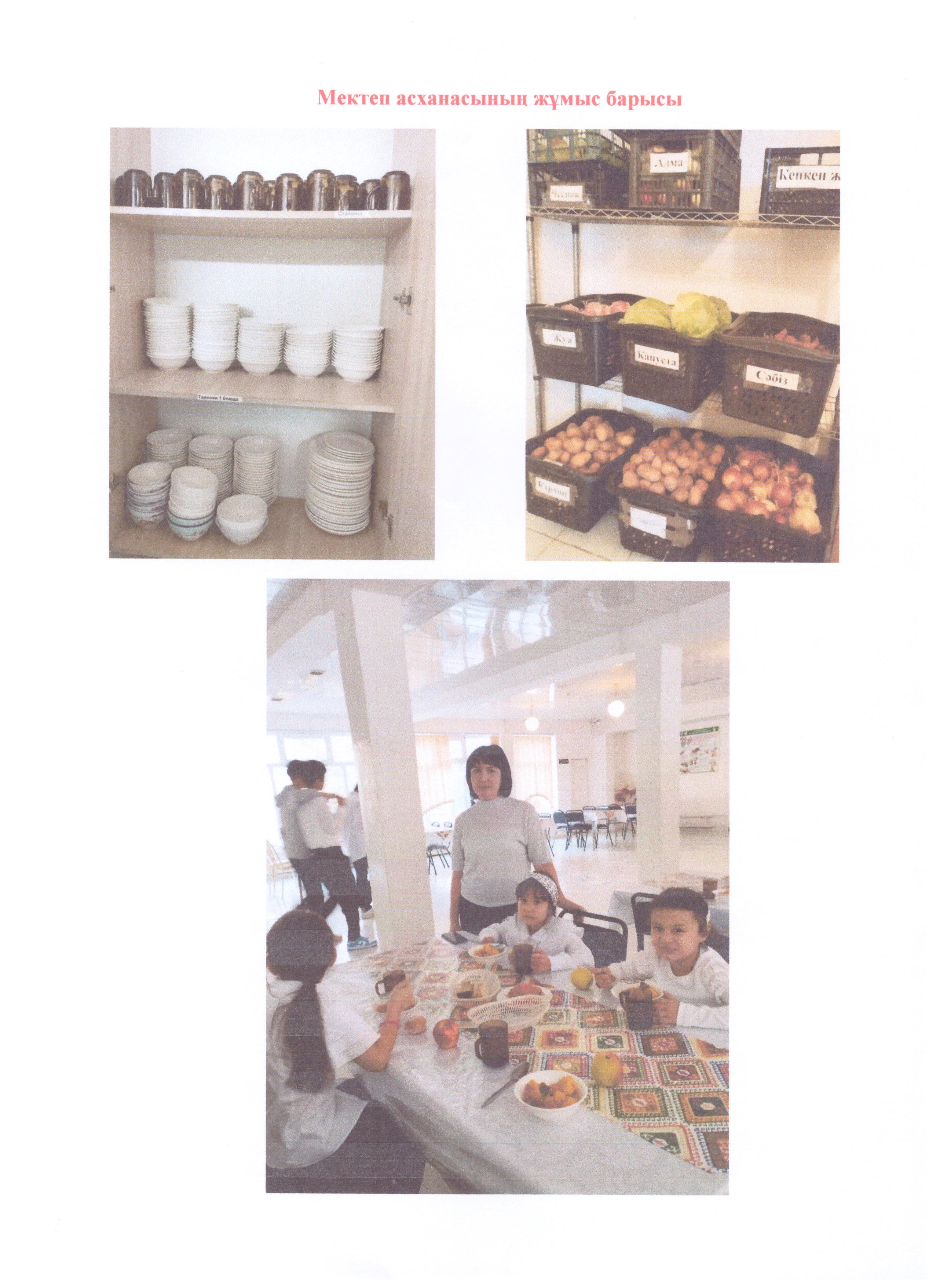 Мектептің асханасы 132 орындық.Тамақ пісіру, азық түлік сақтау бөлмелері бар. Асхананы жалға алушы кәсіпкер Махамбетова Гулшат. Асхана аптасына 5 күн: бірінші және екінші ауысымда жұмыс істейді. Күнделікті тамақ пен ас мәзірін және оның берілуін мектеп медбикесі Н. Фазылова және әлеуметтік педагог А. Нұртанова қадағалайды.Тамақтану бірінші ауысымда сағат 10.25-10.35 аралығында, екінші ауысымда сағат 16.20-16.30 аралығында кезекші мұғалімдер мен сынып жетекшілерінің көмегімен жүзеге асырылады.Бір балаға арналған тамақтың құны 557 теңге. Мектепте жұмыс жасап отырған асхана санитарлық ереже талабына сай.Технологиялық құралдармен, тамақ пісіретін қажетті электр плиталары, ыдыс аяқтар және тоңазытқыштармен қамтылған. Асхананың материалдық - техникалық базасы жақсы деңгейде.Қойма бөлмесі, мұздатқыш жұмыс жасап тұр. Тамақ асханада дайындалады. Асханада 2 аспазшы, 1 буфетші, 2 наубайшы,1 ыдыс жуушы, 1 еден жуушы және 2 зал қызметкері 1 диетолог қызмет етеді.Аспаздардың кәсіптік білімі бар. Жасөспірімдердің тамағының нәрлілігі мен құрамы талапқа сай болуы үнемі басты назарда. Асханада ас мәзірінің орны белгіленіп, күнделікті берілетін дәруменді тамақтар мен жеміс жидектердің ауысып келіп отырылуын мектеп әкімшілігі басшылықта ұстайды.Тамақ пісіруде йодталған тұз пайдаланылады. Сүт өнімдері де белгіленген нормаға сәйкес берілуде. Экологиялық таза сумен қамтылған.Асхананың жұмыс істеуіне қажетті бұйрықтар шығарылып,ыстық тамақпен қамтылған оқушылар тізімі мен тамақтану кестесі жасақталды.