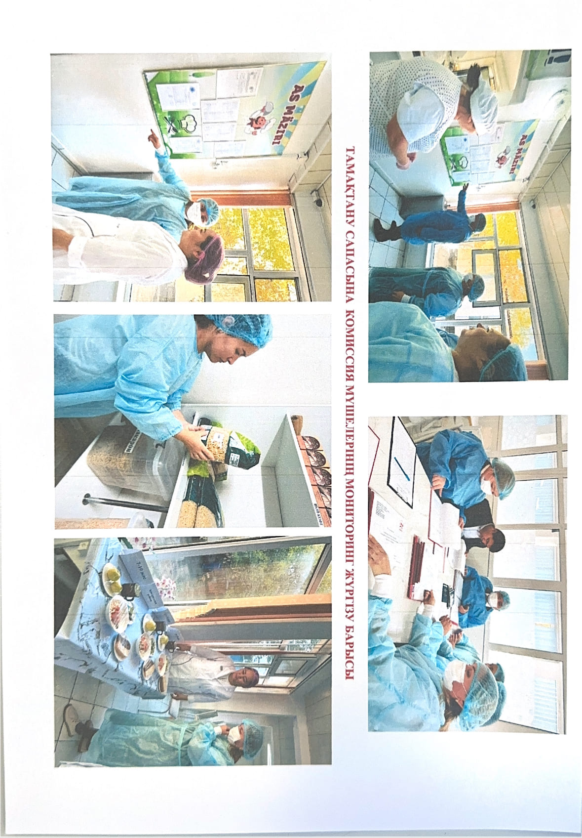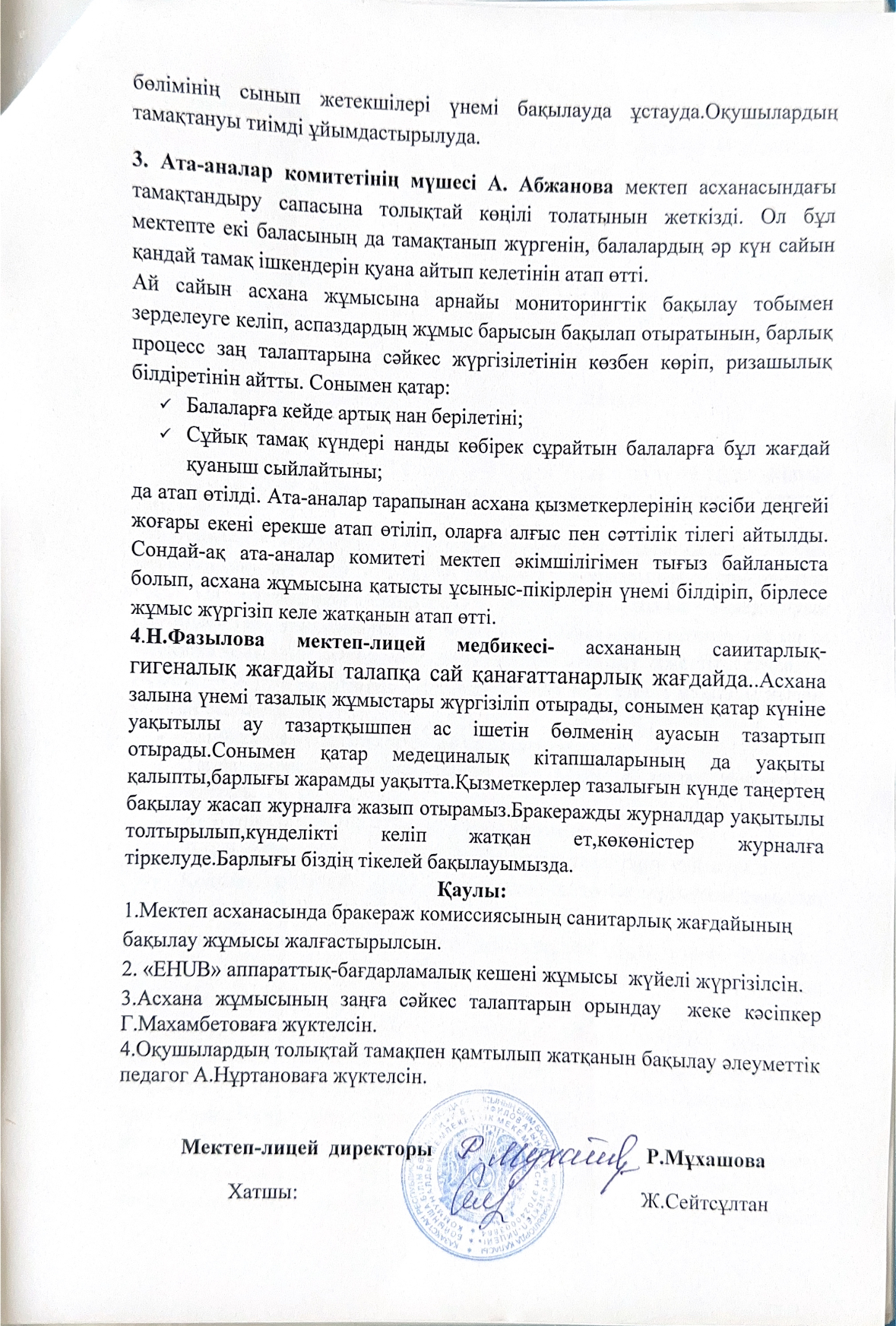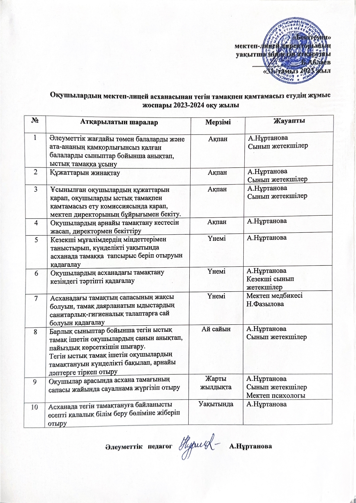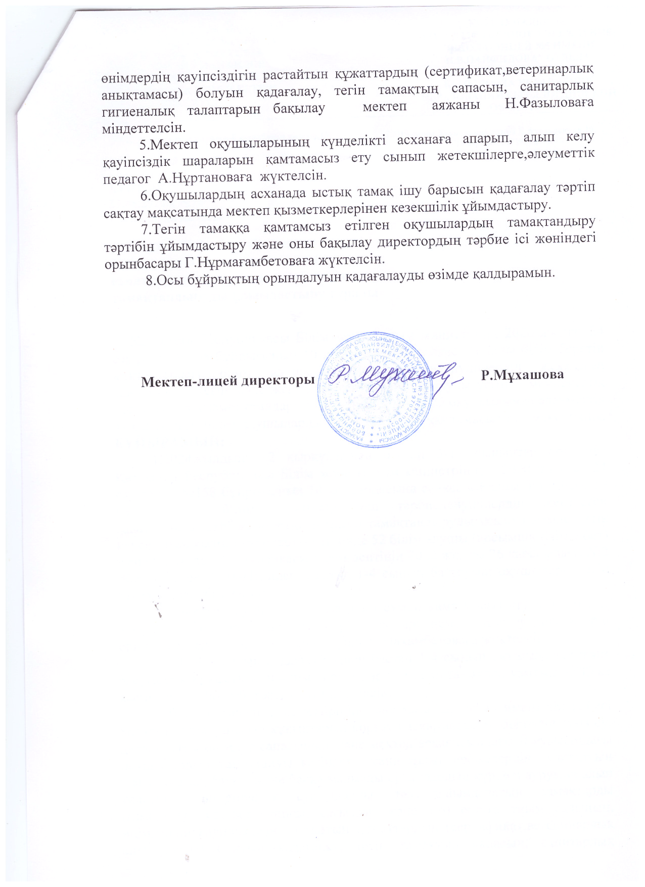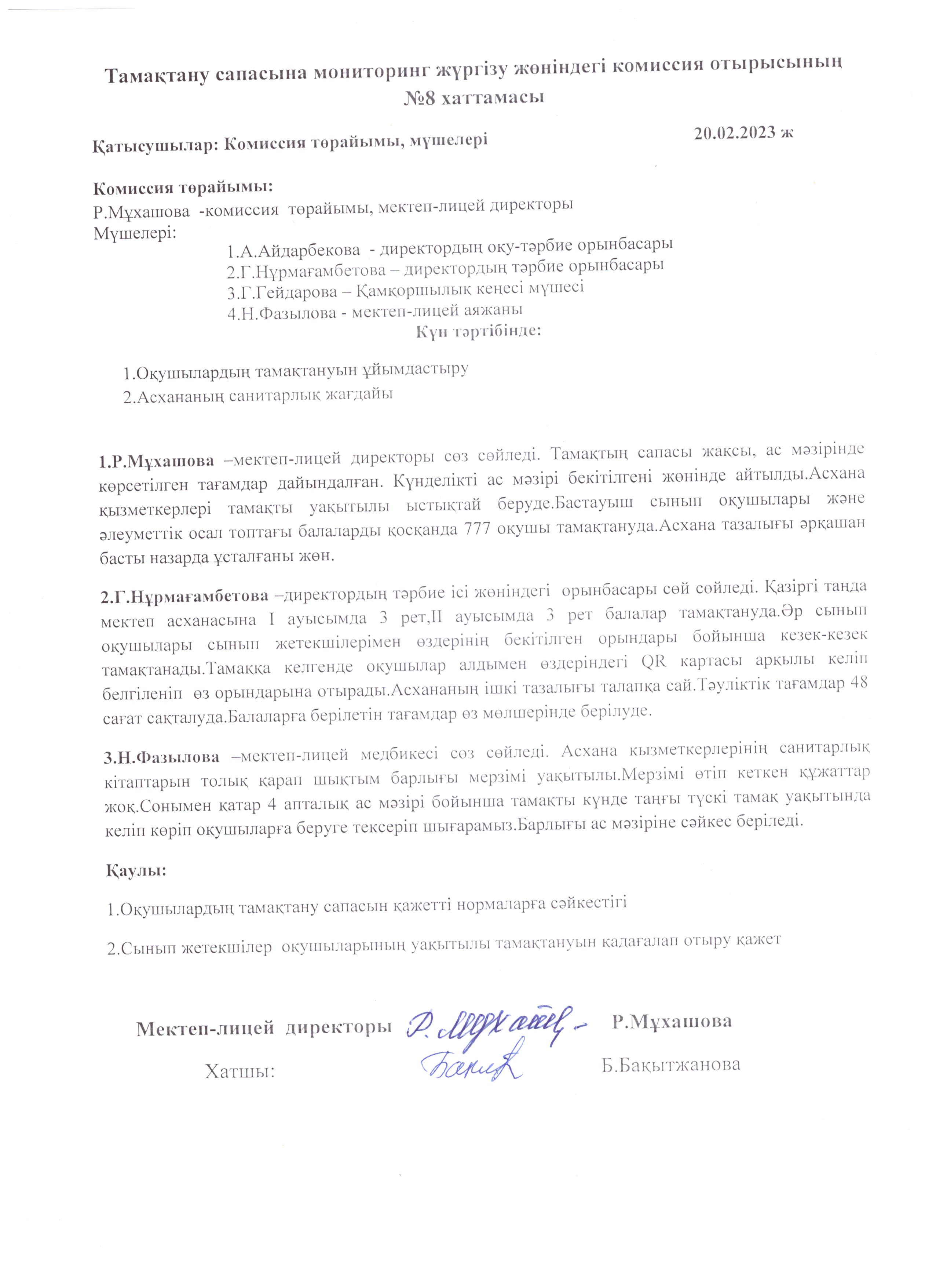 Мектептің асханасы 132 орындық.Тамақ пісіру, азық түлік сақтау бөлмелері бар. Асхананы жалға алушы кәсіпкер Махамбетова Гулшат. Асхана аптасына 5 күн: бірінші және екінші ауысымда жұмыс істейді. Күнделікті тамақ пен ас мәзірін және оның берілуін мектеп медбикесі Н. Фазылова және әлеуметтік педагог А. Нұртанова қадағалайды.Тамақтану бірінші ауысымда сағат 10.25-10.35 аралығында, екінші ауысымда сағат 16.20-16.30 аралығында кезекші мұғалімдер мен сынып жетекшілерінің көмегімен жүзеге асырылады.Бір балаға арналған тамақтың құны 557 теңге. Мектепте жұмыс жасап отырған асхана санитарлық ереже талабына сай.Технологиялық құралдармен, тамақ пісіретін қажетті электр плиталары, ыдыс аяқтар және тоңазытқыштармен қамтылған. Асхананың материалдық - техникалық базасы жақсы деңгейде.Қойма бөлмесі, мұздатқыш жұмыс жасап тұр. Тамақ асханада дайындалады. Асханада 2 аспазшы, 1 буфетші, 2 наубайшы,1 ыдыс жуушы, 1 еден жуушы және 2 зал қызметкері 1 диетолог қызмет етеді.Аспаздардың кәсіптік білімі бар. Жасөспірімдердің тамағының нәрлілігі мен құрамы талапқа сай болуы үнемі басты назарда. Асханада ас мәзірінің орны белгіленіп, күнделікті берілетін дәруменді тамақтар мен жеміс жидектердің ауысып келіп отырылуын мектеп әкімшілігі басшылықта ұстайды.Тамақ пісіруде йодталған тұз пайдаланылады. Сүт өнімдері де белгіленген нормаға сәйкес берілуде. Экологиялық таза сумен қамтылған.Асхананың жұмыс істеуіне қажетті бұйрықтар шығарылып,ыстық тамақпен қамтылған оқушылар тізімі мен тамақтану кестесі жасақталды.