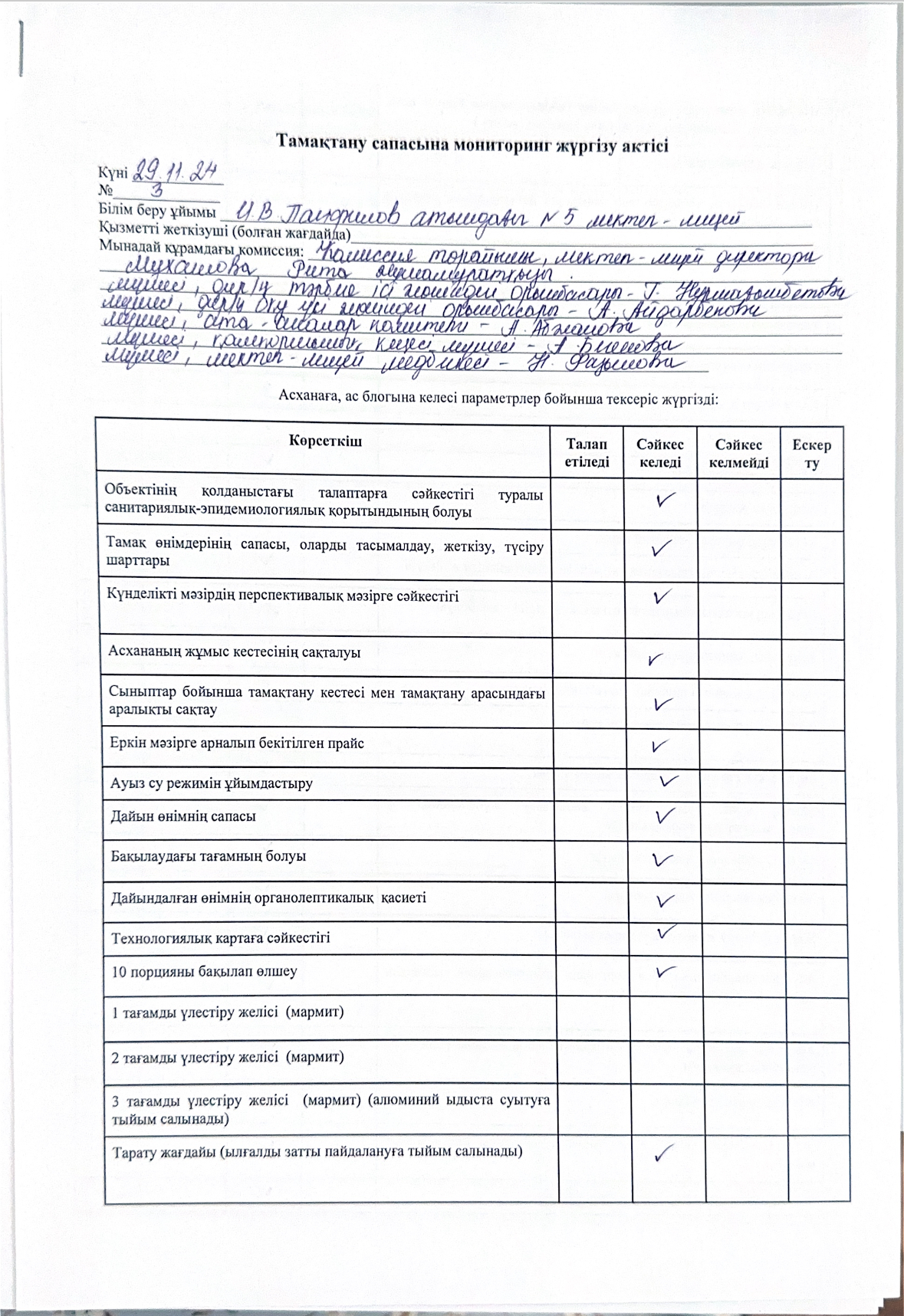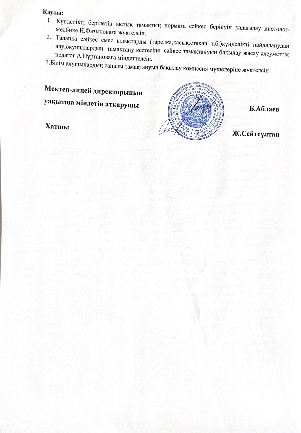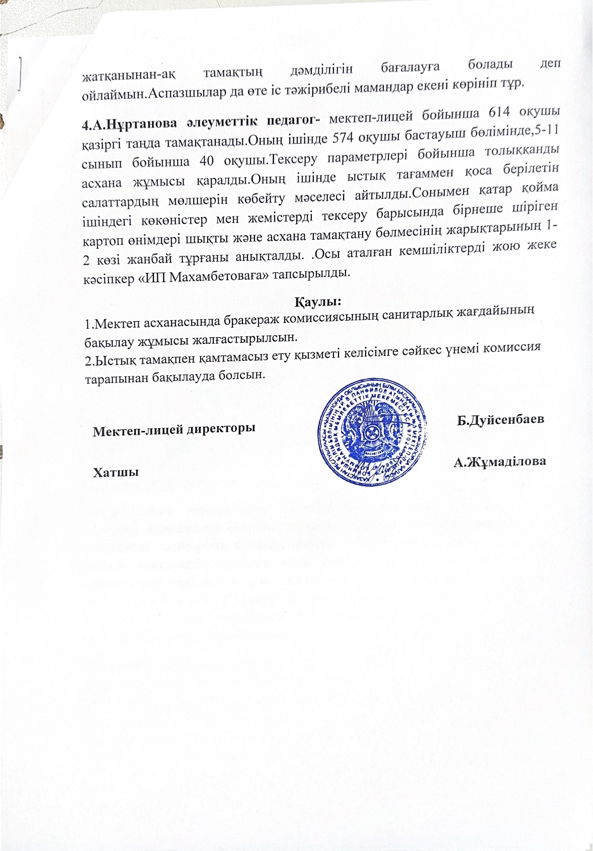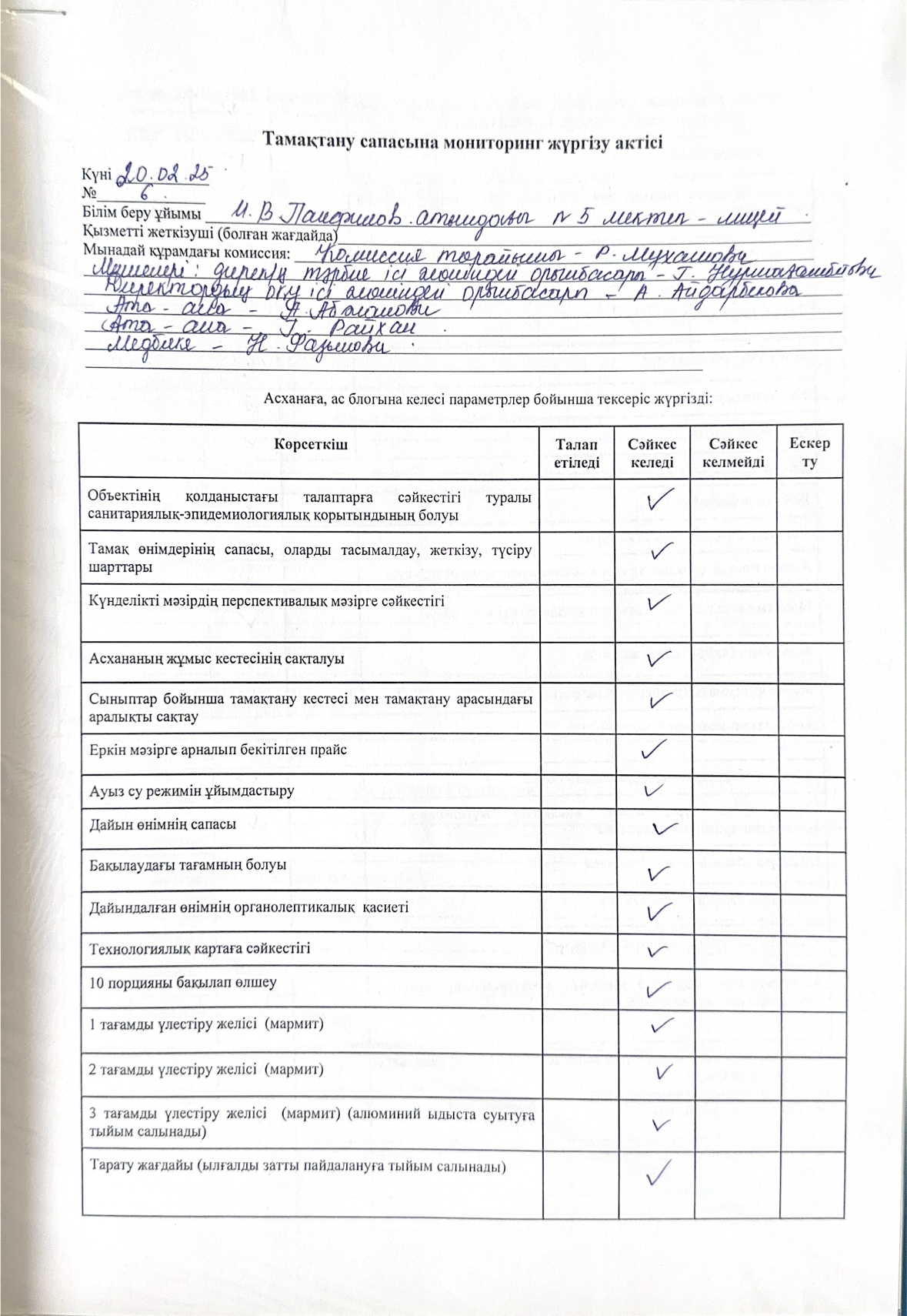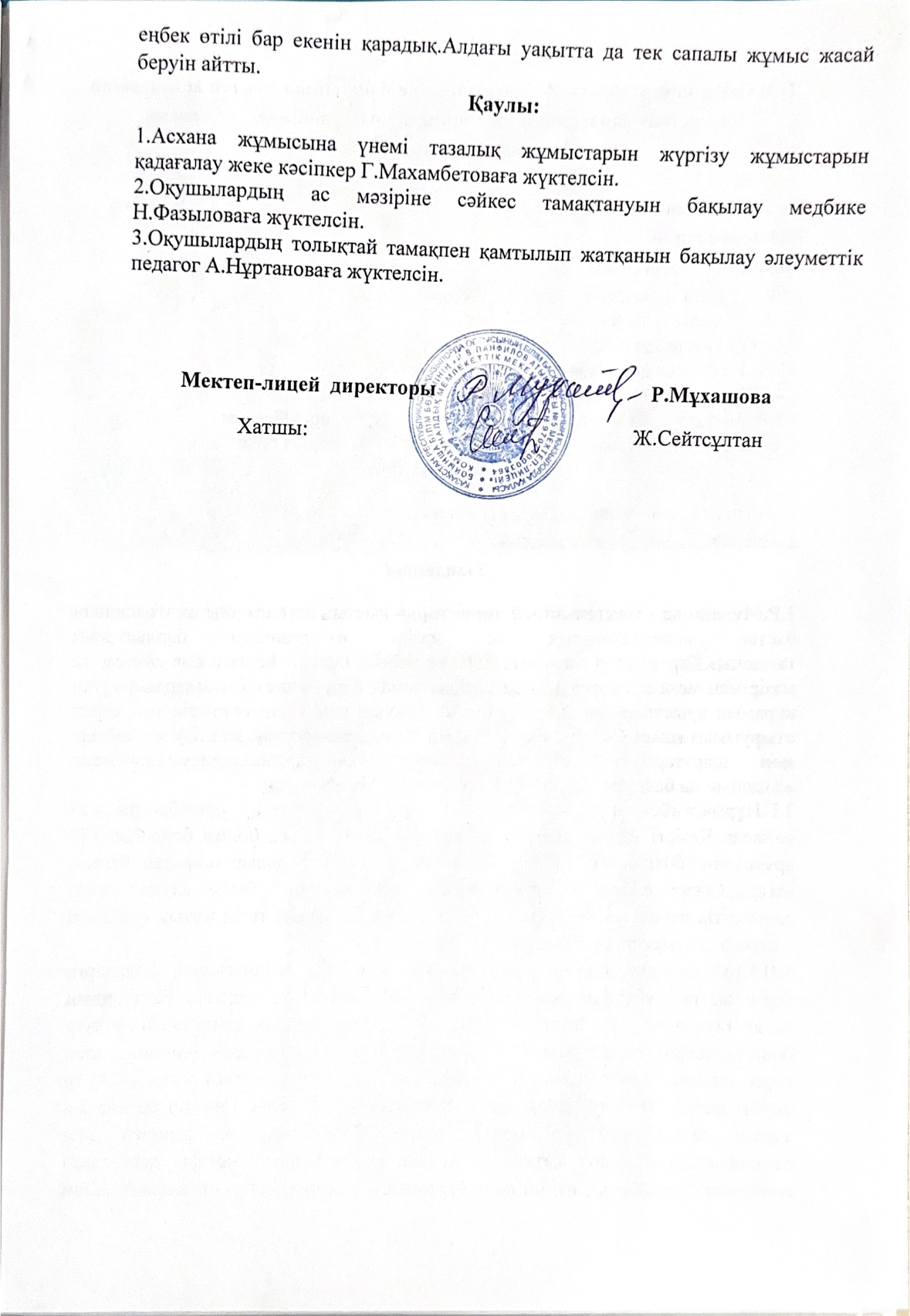 Мектептің асханасы 132 орындық.Тамақ пісіру, азық түлік сақтау бөлмелері бар. Асхананы жалға алушы кәсіпкер Махамбетова Гулшат. Асхана аптасына 5 күн: бірінші және екінші ауысымда жұмыс істейді. Күнделікті тамақ пен ас мәзірін және оның берілуін мектеп медбикесі Н. Фазылова және әлеуметтік педагог А. Нұртанова қадағалайды.Тамақтану бірінші ауысымда сағат 10.25-10.35 аралығында, екінші ауысымда сағат 16.20-16.30 аралығында кезекші мұғалімдер мен сынып жетекшілерінің көмегімен жүзеге асырылады.Бір балаға арналған тамақтың құны 557 теңге. Мектепте жұмыс жасап отырған асхана санитарлық ереже талабына сай.Технологиялық құралдармен, тамақ пісіретін қажетті электр плиталары, ыдыс аяқтар және тоңазытқыштармен қамтылған. Асхананың материалдық - техникалық базасы жақсы деңгейде.Қойма бөлмесі, мұздатқыш жұмыс жасап тұр. Тамақ асханада дайындалады. Асханада 2 аспазшы, 1 буфетші, 2 наубайшы,1 ыдыс жуушы, 1 еден жуушы және 2 зал қызметкері 1 диетолог қызмет етеді.Аспаздардың кәсіптік білімі бар. Жасөспірімдердің тамағының нәрлілігі мен құрамы талапқа сай болуы үнемі басты назарда. Асханада ас мәзірінің орны белгіленіп, күнделікті берілетін дәруменді тамақтар мен жеміс жидектердің ауысып келіп отырылуын мектеп әкімшілігі басшылықта ұстайды.Тамақ пісіруде йодталған тұз пайдаланылады. Сүт өнімдері де белгіленген нормаға сәйкес берілуде. Экологиялық таза сумен қамтылған.Асхананың жұмыс істеуіне қажетті бұйрықтар шығарылып,ыстық тамақпен қамтылған оқушылар тізімі мен тамақтану кестесі жасақталды.