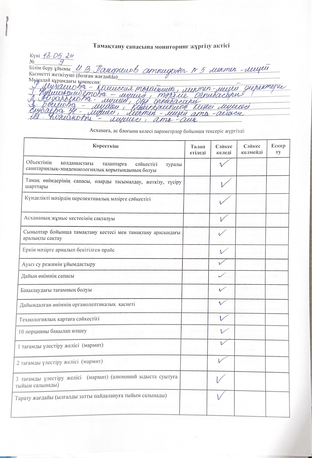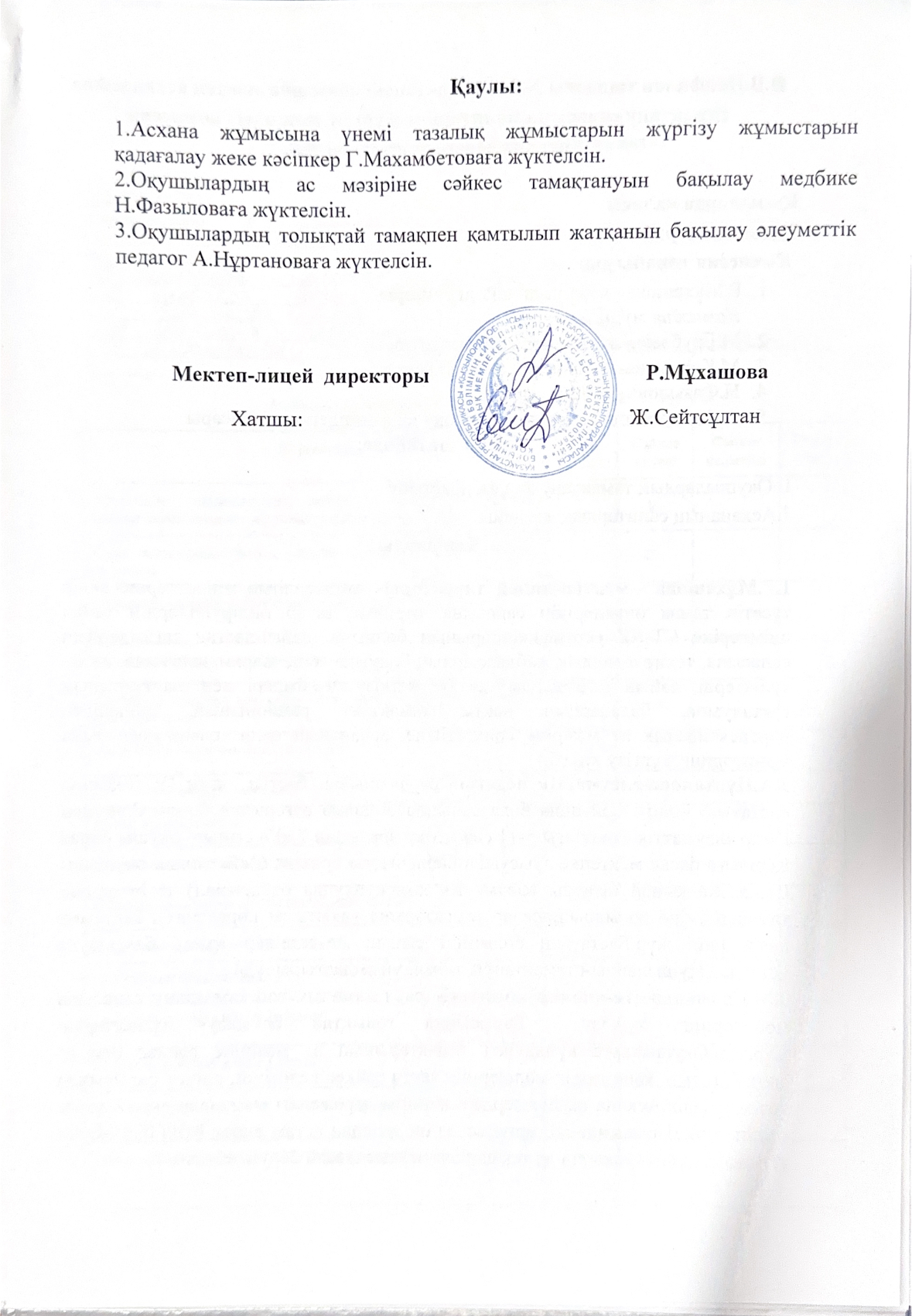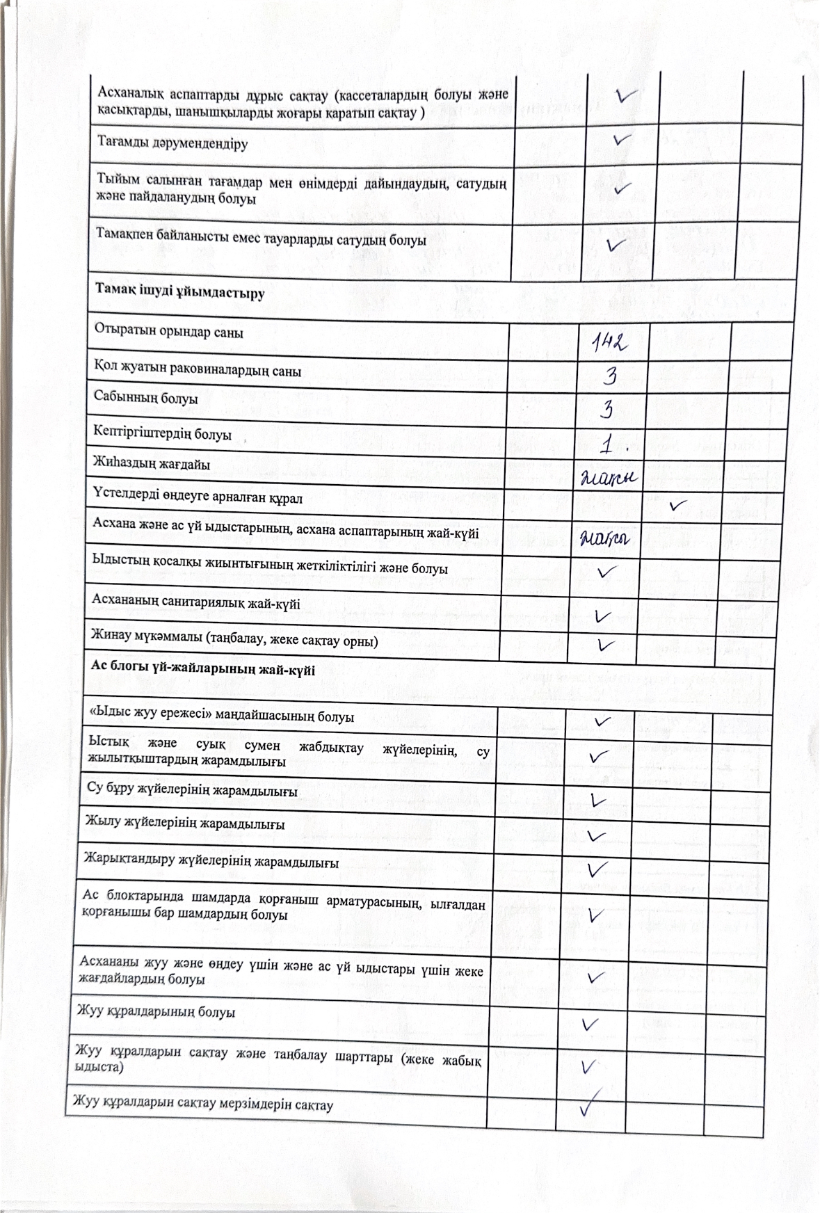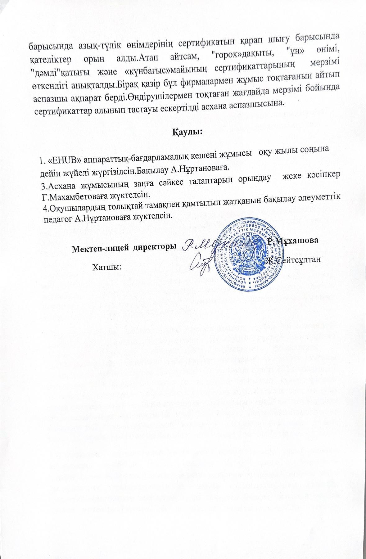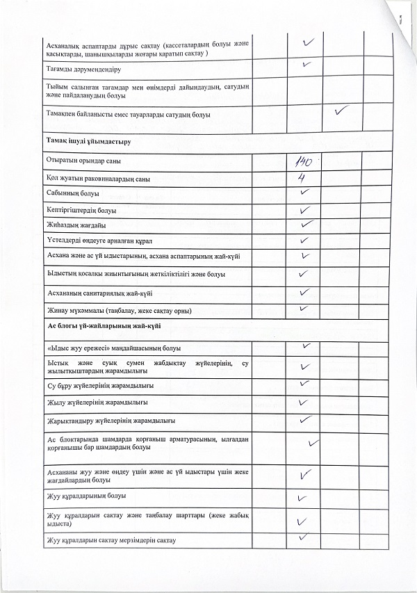 Мектептің асханасы 132 орындық.Тамақ пісіру, азық түлік сақтау бөлмелері бар. Асхананы жалға алушы кәсіпкер Махамбетова Гулшат. Асхана аптасына 5 күн: бірінші және екінші ауысымда жұмыс істейді. Күнделікті тамақ пен ас мәзірін және оның берілуін мектеп медбикесі Н. Фазылова және әлеуметтік педагог А. Нұртанова қадағалайды.Тамақтану бірінші ауысымда сағат 10.25-10.35 аралығында, екінші ауысымда сағат 16.20-16.30 аралығында кезекші мұғалімдер мен сынып жетекшілерінің көмегімен жүзеге асырылады.Бір балаға арналған тамақтың құны 557 теңге. Мектепте жұмыс жасап отырған асхана санитарлық ереже талабына сай.Технологиялық құралдармен, тамақ пісіретін қажетті электр плиталары, ыдыс аяқтар және тоңазытқыштармен қамтылған. Асхананың материалдық - техникалық базасы жақсы деңгейде.Қойма бөлмесі, мұздатқыш жұмыс жасап тұр. Тамақ асханада дайындалады. Асханада 2 аспазшы, 1 буфетші, 2 наубайшы,1 ыдыс жуушы, 1 еден жуушы және 2 зал қызметкері 1 диетолог қызмет етеді.Аспаздардың кәсіптік білімі бар. Жасөспірімдердің тамағының нәрлілігі мен құрамы талапқа сай болуы үнемі басты назарда. Асханада ас мәзірінің орны белгіленіп, күнделікті берілетін дәруменді тамақтар мен жеміс жидектердің ауысып келіп отырылуын мектеп әкімшілігі басшылықта ұстайды.Тамақ пісіруде йодталған тұз пайдаланылады. Сүт өнімдері де белгіленген нормаға сәйкес берілуде. Экологиялық таза сумен қамтылған.Асхананың жұмыс істеуіне қажетті бұйрықтар шығарылып,ыстық тамақпен қамтылған оқушылар тізімі мен тамақтану кестесі жасақталды.