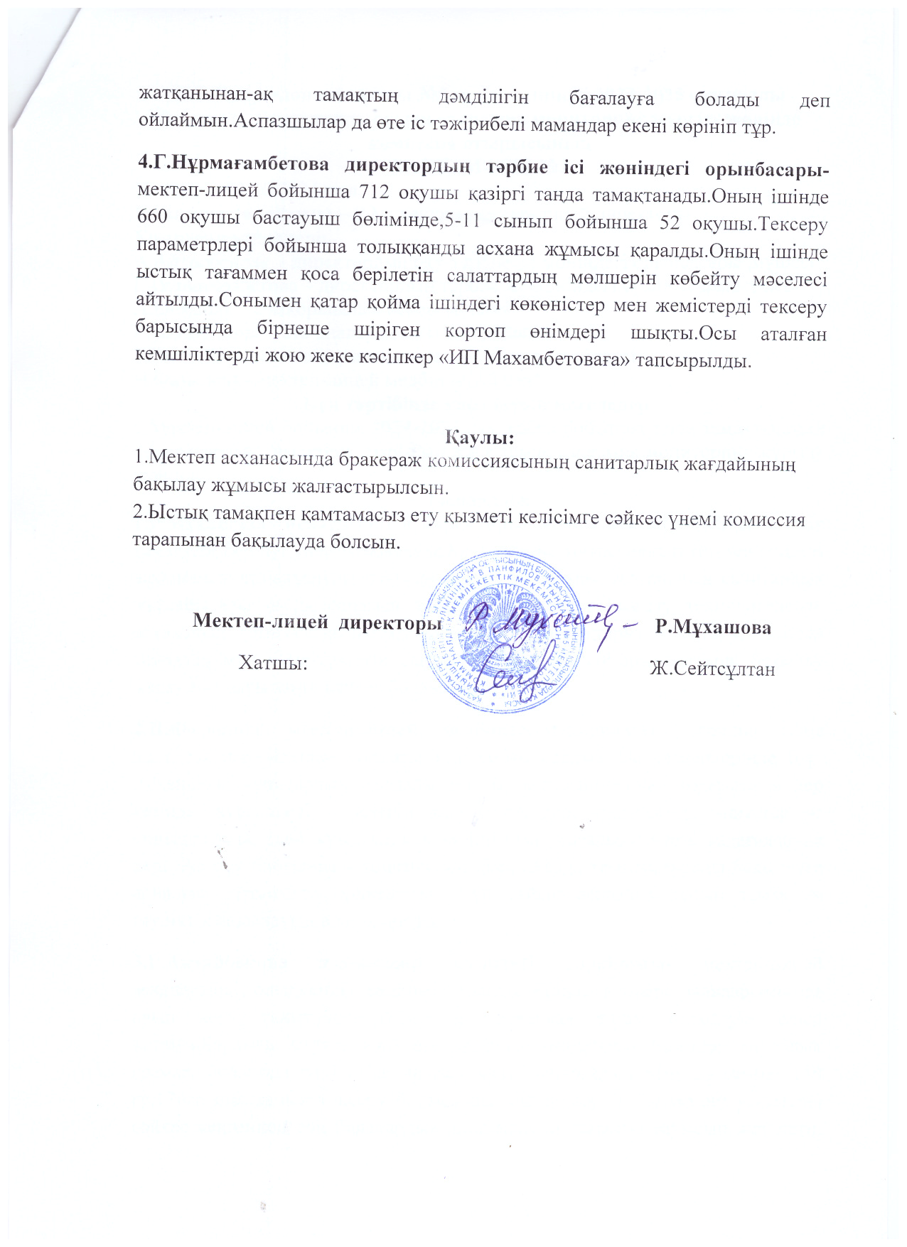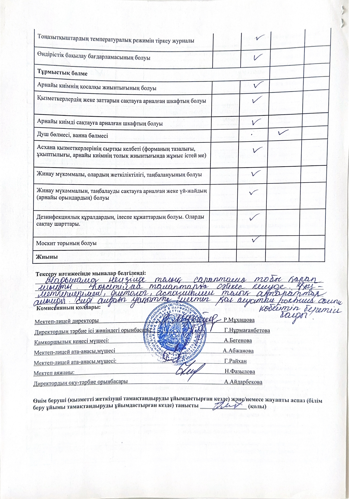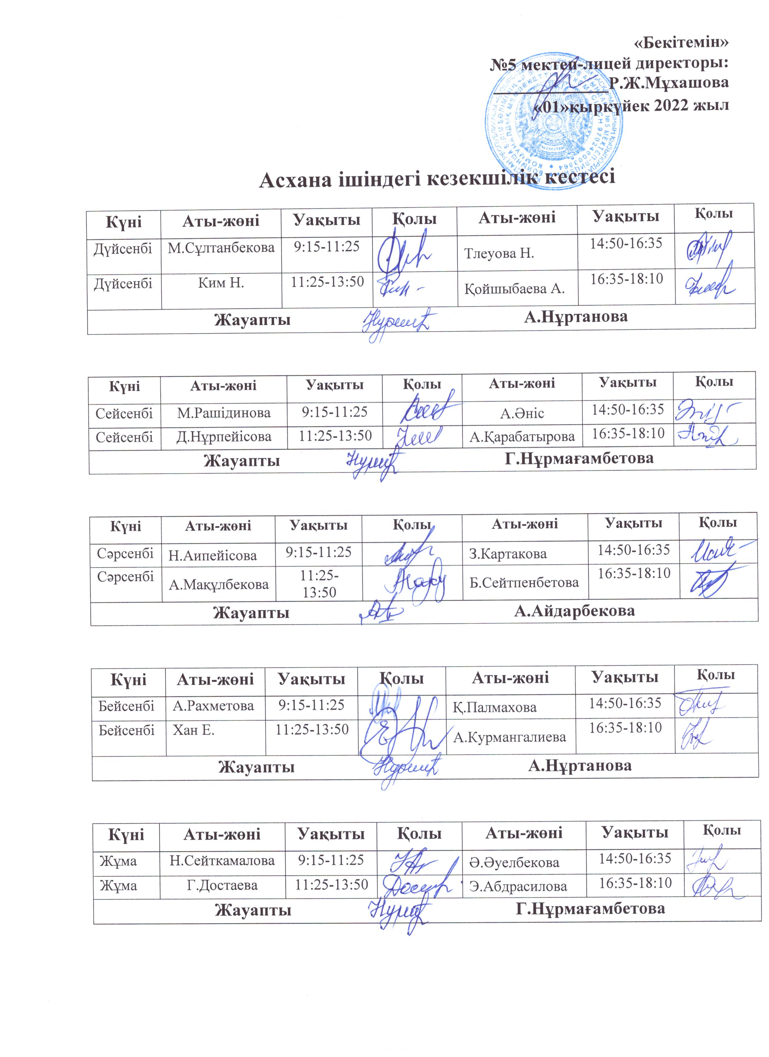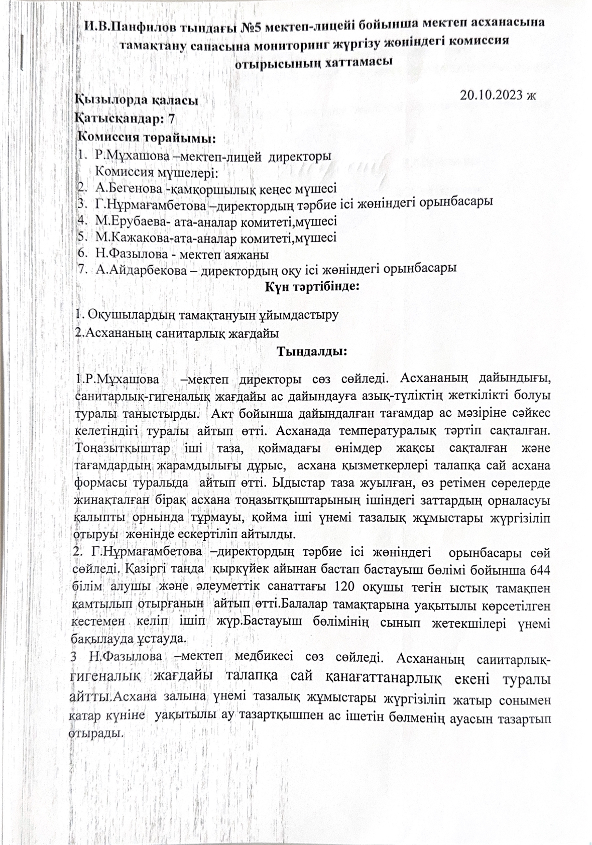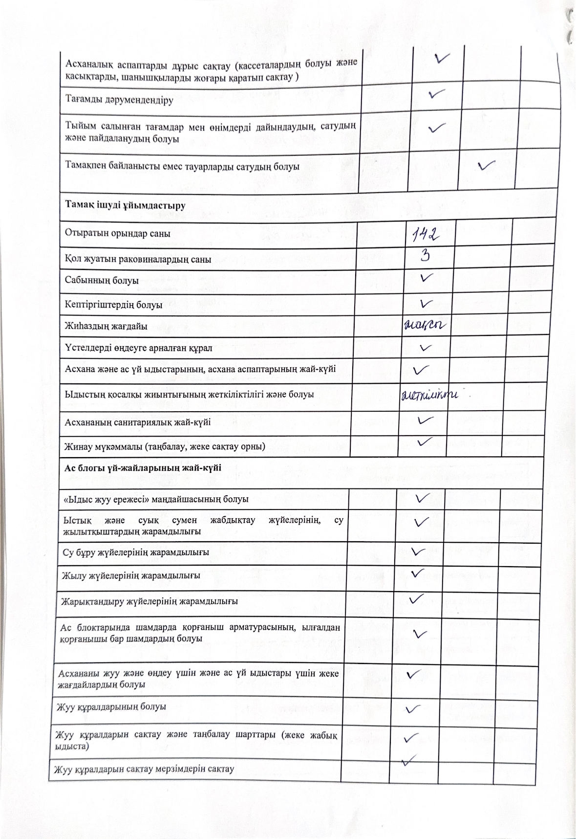 Мектептің асханасы 132 орындық.Тамақ пісіру, азық түлік сақтау бөлмелері бар. Асхананы жалға алушы кәсіпкер Махамбетова Гулшат. Асхана аптасына 5 күн: бірінші және екінші ауысымда жұмыс істейді. Күнделікті тамақ пен ас мәзірін және оның берілуін мектеп медбикесі Н. Фазылова және әлеуметтік педагог А. Нұртанова қадағалайды.Тамақтану бірінші ауысымда сағат 10.25-10.35 аралығында, екінші ауысымда сағат 16.20-16.30 аралығында кезекші мұғалімдер мен сынып жетекшілерінің көмегімен жүзеге асырылады.Бір балаға арналған тамақтың құны 557 теңге. Мектепте жұмыс жасап отырған асхана санитарлық ереже талабына сай.Технологиялық құралдармен, тамақ пісіретін қажетті электр плиталары, ыдыс аяқтар және тоңазытқыштармен қамтылған. Асхананың материалдық - техникалық базасы жақсы деңгейде.Қойма бөлмесі, мұздатқыш жұмыс жасап тұр. Тамақ асханада дайындалады. Асханада 2 аспазшы, 1 буфетші, 2 наубайшы,1 ыдыс жуушы, 1 еден жуушы және 2 зал қызметкері 1 диетолог қызмет етеді.Аспаздардың кәсіптік білімі бар. Жасөспірімдердің тамағының нәрлілігі мен құрамы талапқа сай болуы үнемі басты назарда. Асханада ас мәзірінің орны белгіленіп, күнделікті берілетін дәруменді тамақтар мен жеміс жидектердің ауысып келіп отырылуын мектеп әкімшілігі басшылықта ұстайды.Тамақ пісіруде йодталған тұз пайдаланылады. Сүт өнімдері де белгіленген нормаға сәйкес берілуде. Экологиялық таза сумен қамтылған.Асхананың жұмыс істеуіне қажетті бұйрықтар шығарылып,ыстық тамақпен қамтылған оқушылар тізімі мен тамақтану кестесі жасақталды.