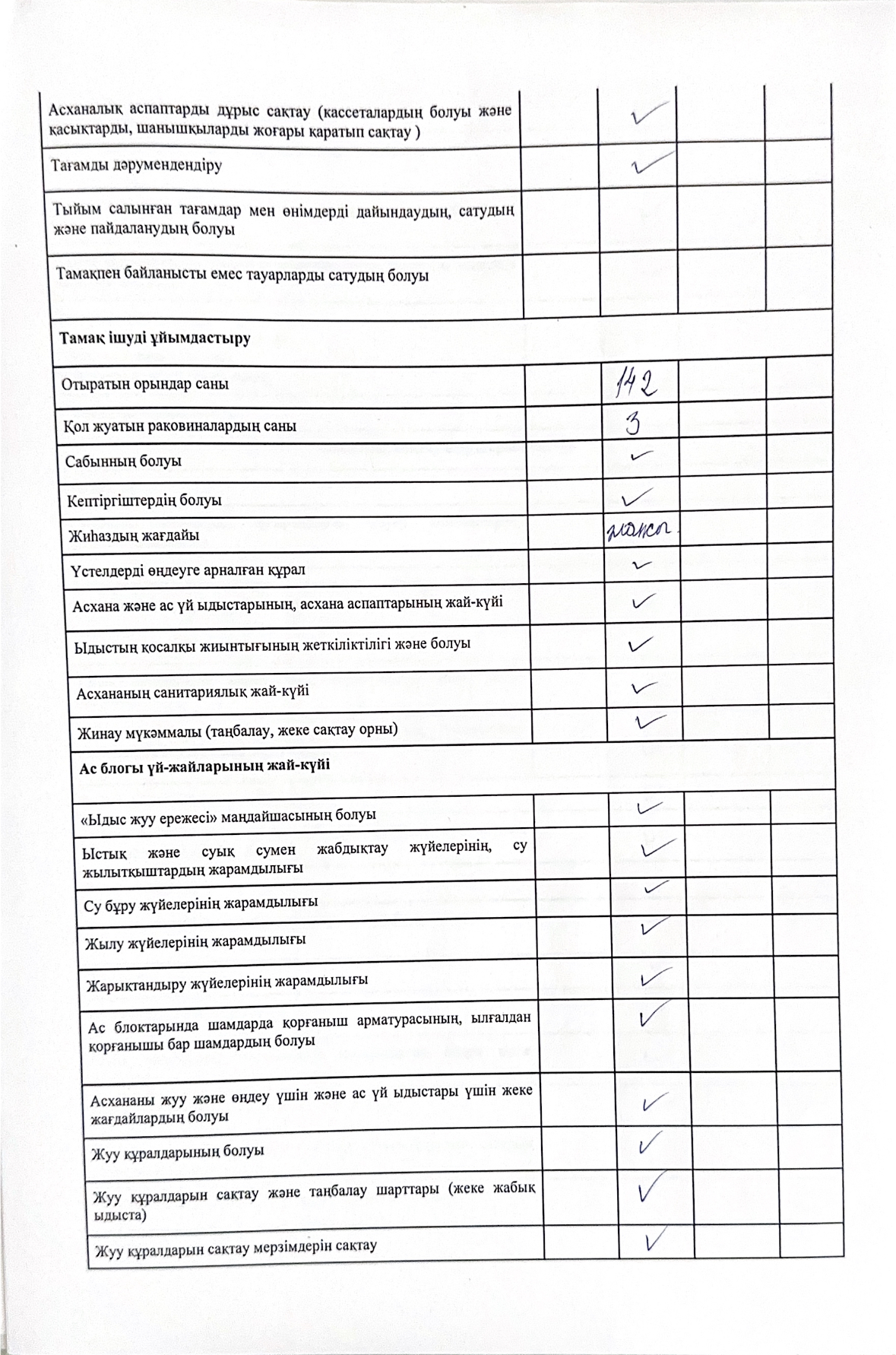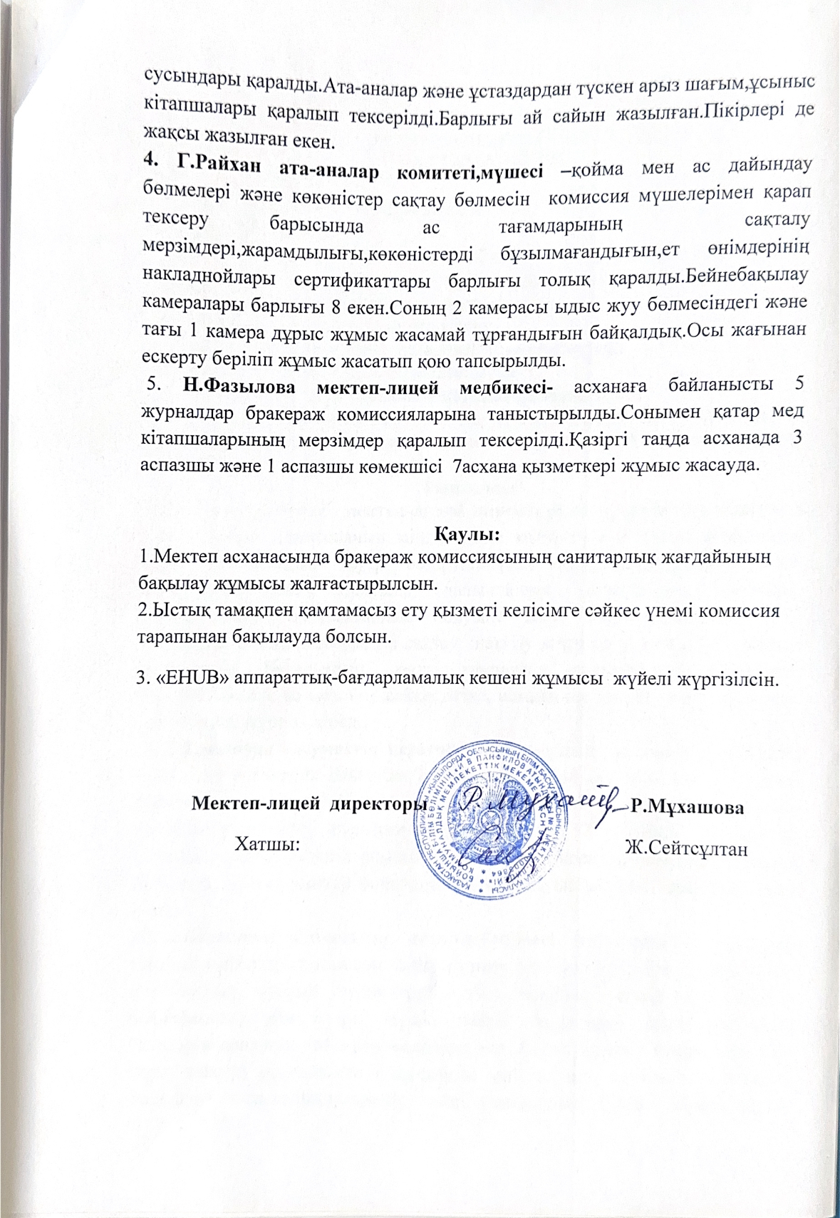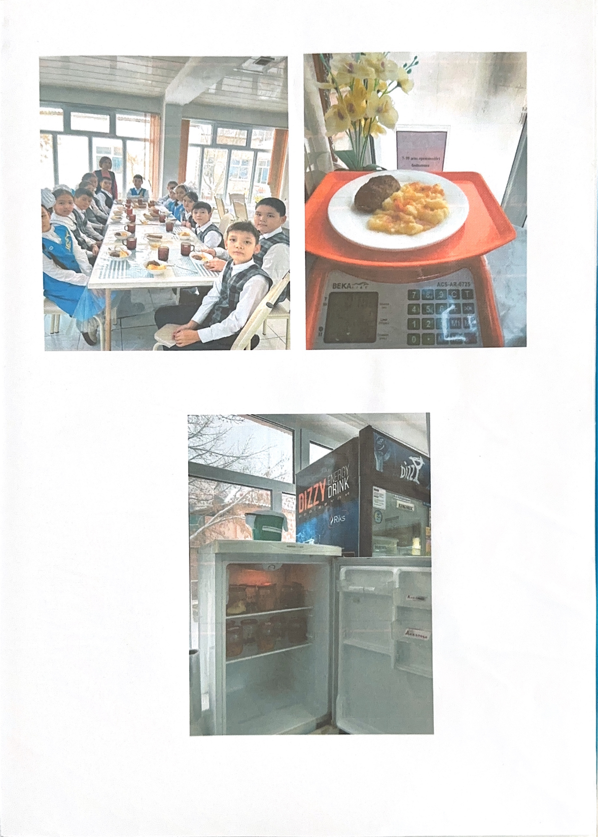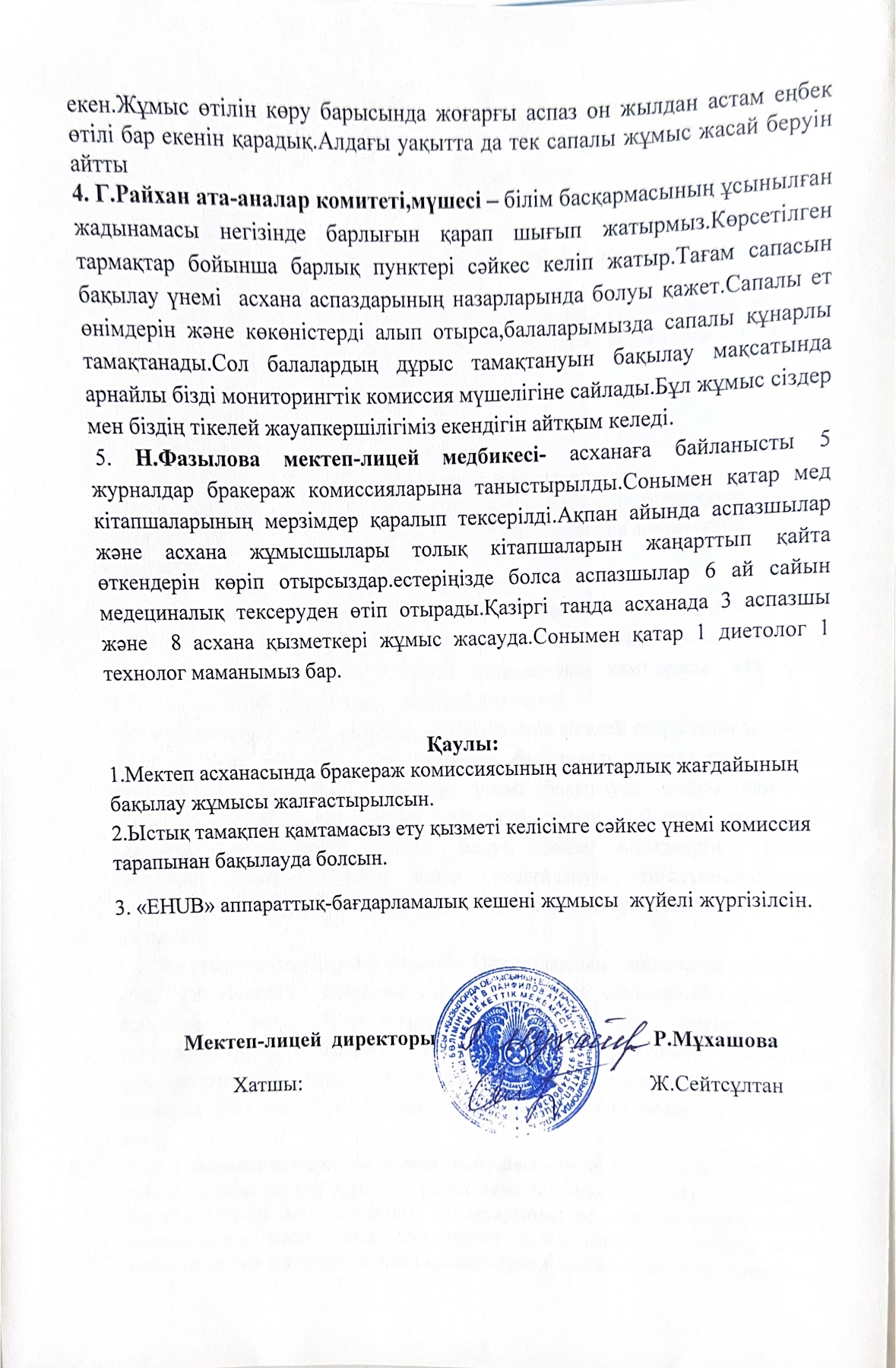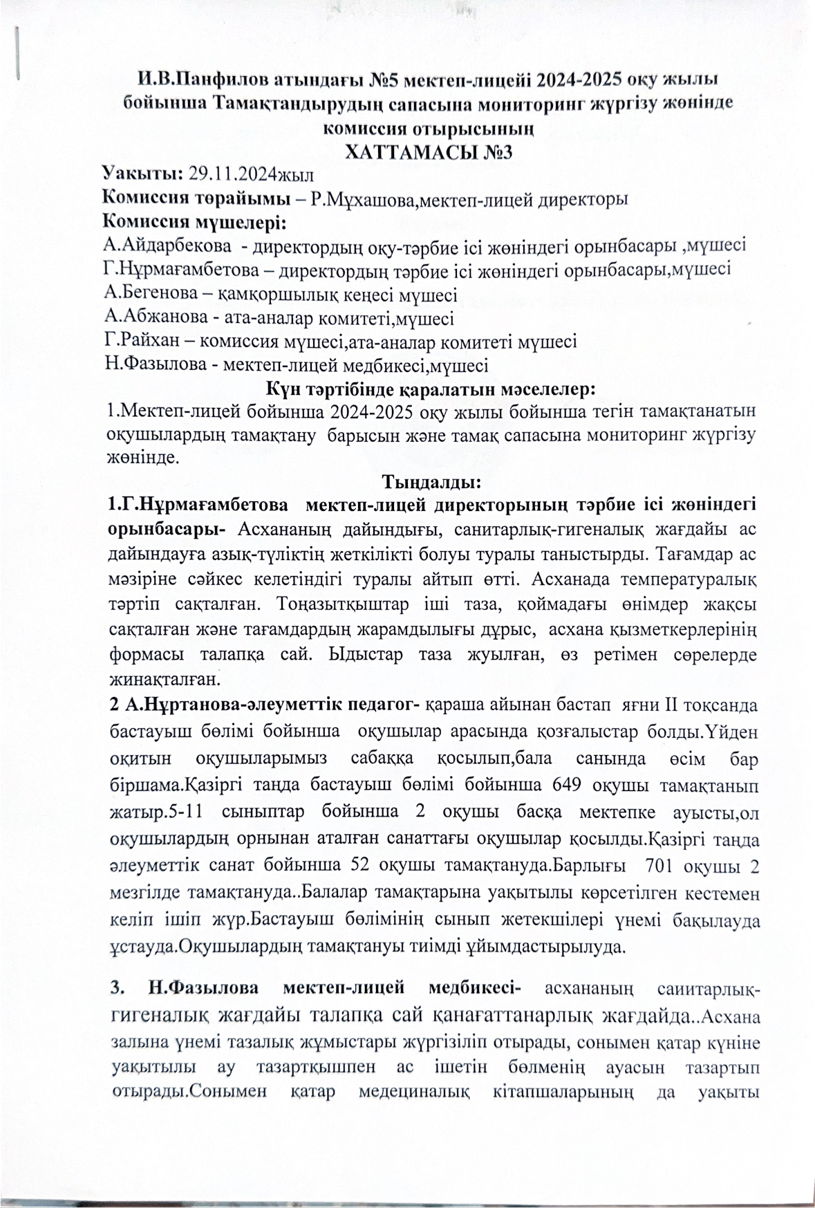Мектептің асханасы 132 орындық.Тамақ пісіру, азық түлік сақтау бөлмелері бар. Асхананы жалға алушы кәсіпкер Махамбетова Гулшат. Асхана аптасына 5 күн: бірінші және екінші ауысымда жұмыс істейді. Күнделікті тамақ пен ас мәзірін және оның берілуін мектеп медбикесі Н. Фазылова және әлеуметтік педагог А. Нұртанова қадағалайды.Тамақтану бірінші ауысымда сағат 10.25-10.35 аралығында, екінші ауысымда сағат 16.20-16.30 аралығында кезекші мұғалімдер мен сынып жетекшілерінің көмегімен жүзеге асырылады.Бір балаға арналған тамақтың құны 557 теңге. Мектепте жұмыс жасап отырған асхана санитарлық ереже талабына сай.Технологиялық құралдармен, тамақ пісіретін қажетті электр плиталары, ыдыс аяқтар және тоңазытқыштармен қамтылған. Асхананың материалдық - техникалық базасы жақсы деңгейде.Қойма бөлмесі, мұздатқыш жұмыс жасап тұр. Тамақ асханада дайындалады. Асханада 2 аспазшы, 1 буфетші, 2 наубайшы,1 ыдыс жуушы, 1 еден жуушы және 2 зал қызметкері 1 диетолог қызмет етеді.Аспаздардың кәсіптік білімі бар. Жасөспірімдердің тамағының нәрлілігі мен құрамы талапқа сай болуы үнемі басты назарда. Асханада ас мәзірінің орны белгіленіп, күнделікті берілетін дәруменді тамақтар мен жеміс жидектердің ауысып келіп отырылуын мектеп әкімшілігі басшылықта ұстайды.Тамақ пісіруде йодталған тұз пайдаланылады. Сүт өнімдері де белгіленген нормаға сәйкес берілуде. Экологиялық таза сумен қамтылған.Асхананың жұмыс істеуіне қажетті бұйрықтар шығарылып,ыстық тамақпен қамтылған оқушылар тізімі мен тамақтану кестесі жасақталды.