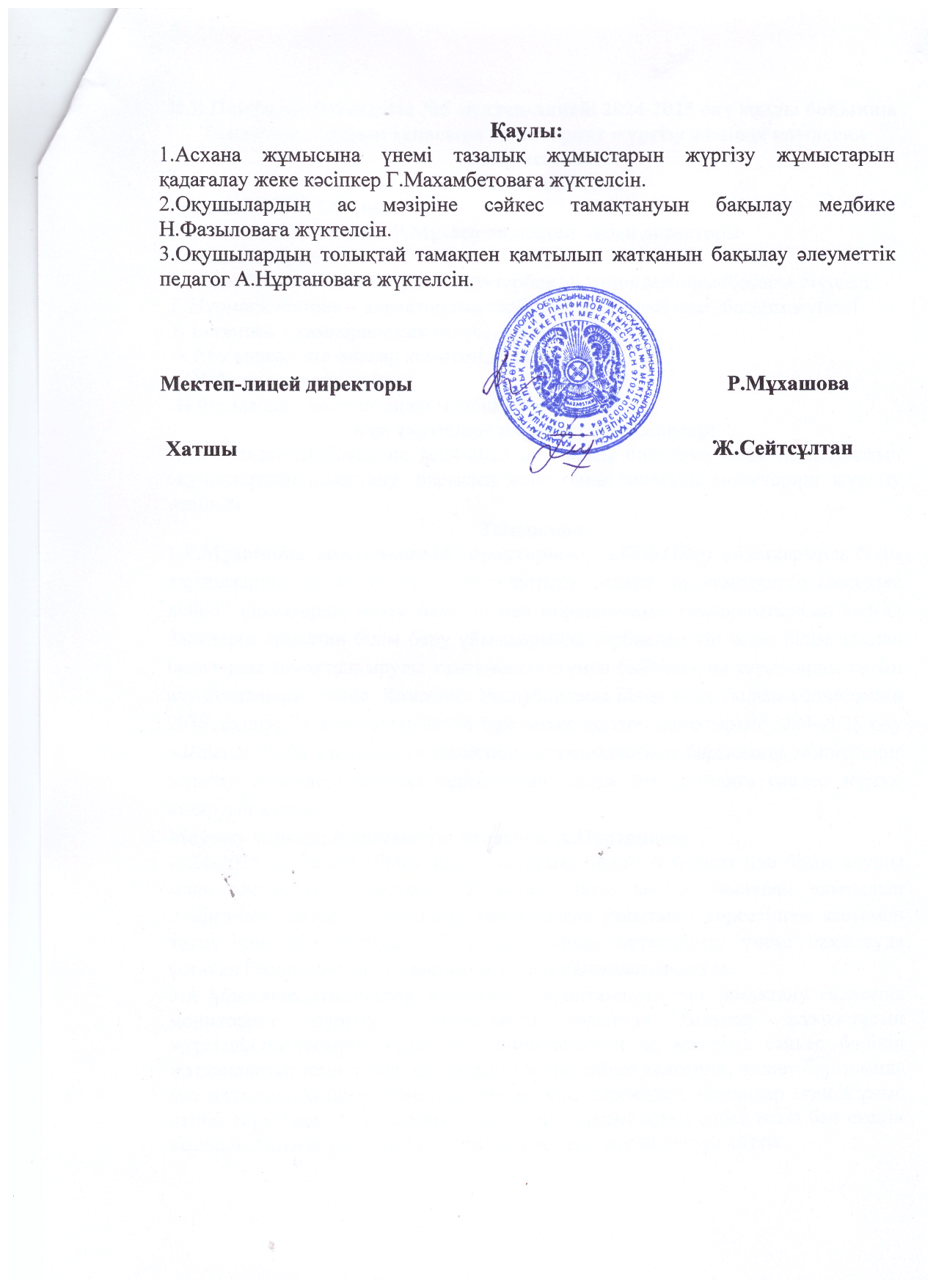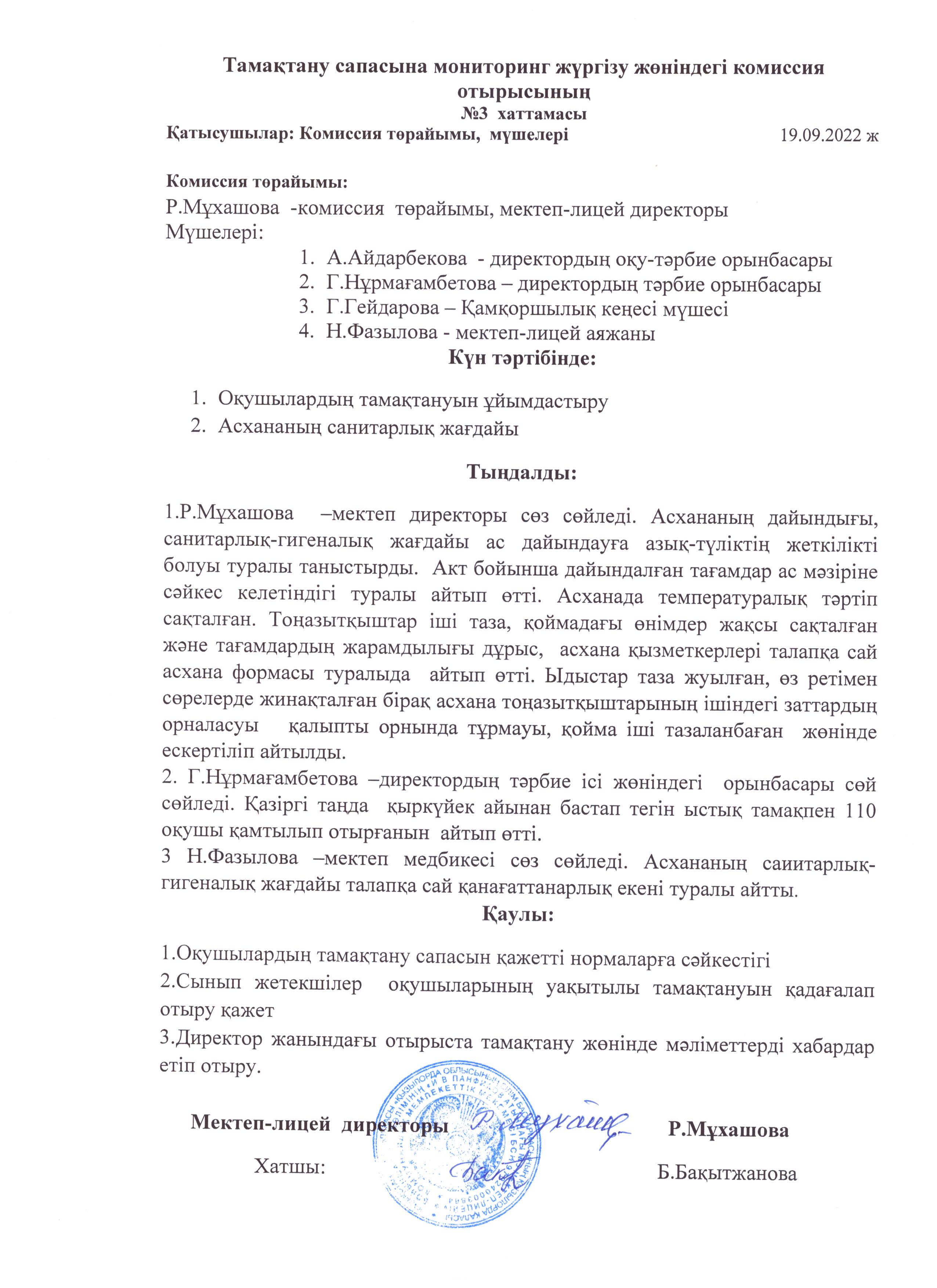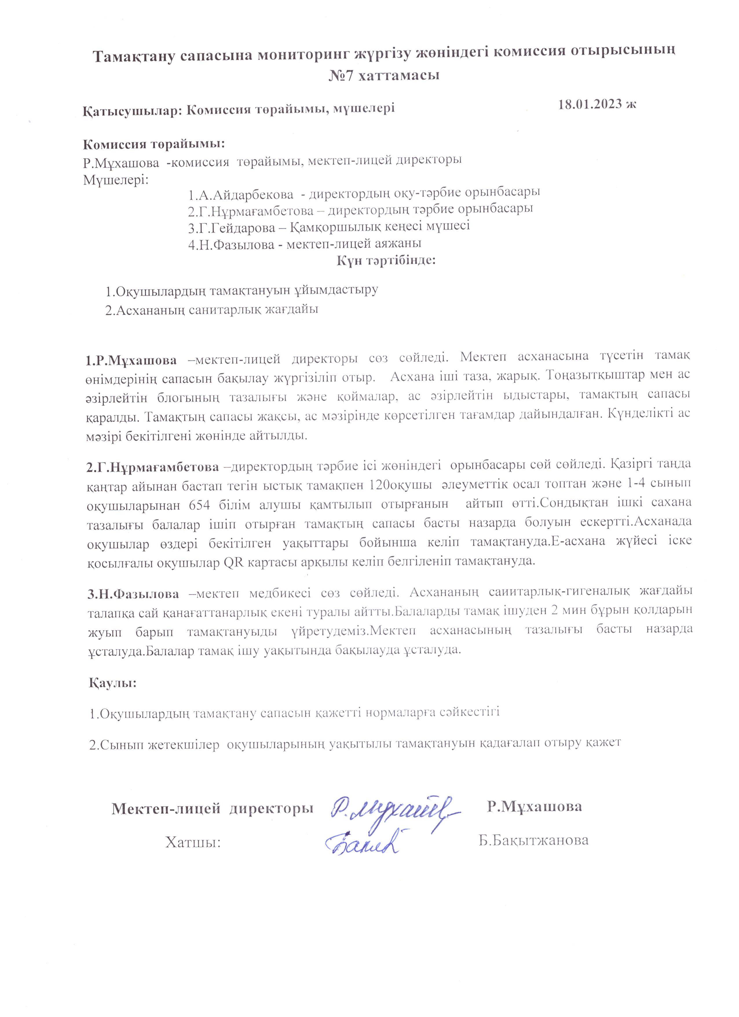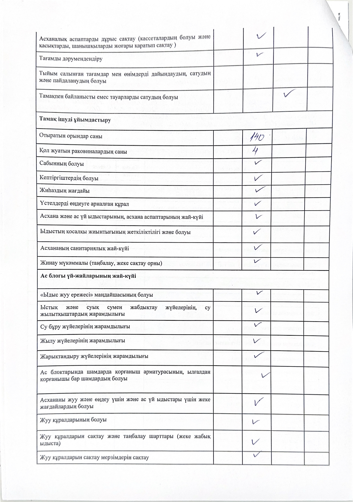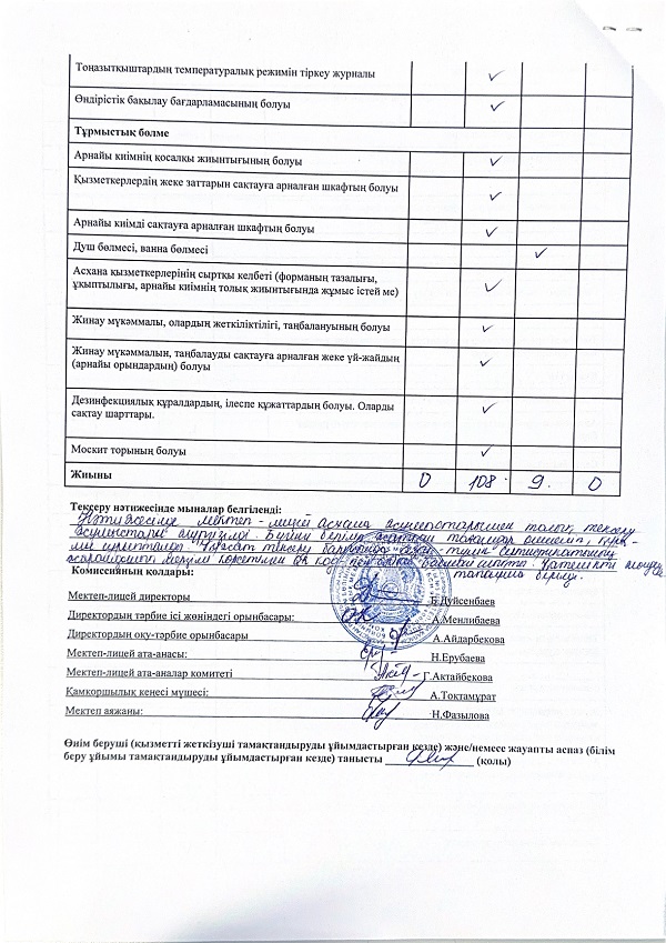 Мектептің асханасы 132 орындық.Тамақ пісіру, азық түлік сақтау бөлмелері бар. Асхананы жалға алушы кәсіпкер Махамбетова Гулшат. Асхана аптасына 5 күн: бірінші және екінші ауысымда жұмыс істейді. Күнделікті тамақ пен ас мәзірін және оның берілуін мектеп медбикесі Н. Фазылова және әлеуметтік педагог А. Нұртанова қадағалайды.Тамақтану бірінші ауысымда сағат 10.25-10.35 аралығында, екінші ауысымда сағат 16.20-16.30 аралығында кезекші мұғалімдер мен сынып жетекшілерінің көмегімен жүзеге асырылады.Бір балаға арналған тамақтың құны 557 теңге. Мектепте жұмыс жасап отырған асхана санитарлық ереже талабына сай.Технологиялық құралдармен, тамақ пісіретін қажетті электр плиталары, ыдыс аяқтар және тоңазытқыштармен қамтылған. Асхананың материалдық - техникалық базасы жақсы деңгейде.Қойма бөлмесі, мұздатқыш жұмыс жасап тұр. Тамақ асханада дайындалады. Асханада 2 аспазшы, 1 буфетші, 2 наубайшы,1 ыдыс жуушы, 1 еден жуушы және 2 зал қызметкері 1 диетолог қызмет етеді.Аспаздардың кәсіптік білімі бар. Жасөспірімдердің тамағының нәрлілігі мен құрамы талапқа сай болуы үнемі басты назарда. Асханада ас мәзірінің орны белгіленіп, күнделікті берілетін дәруменді тамақтар мен жеміс жидектердің ауысып келіп отырылуын мектеп әкімшілігі басшылықта ұстайды.Тамақ пісіруде йодталған тұз пайдаланылады. Сүт өнімдері де белгіленген нормаға сәйкес берілуде. Экологиялық таза сумен қамтылған.Асхананың жұмыс істеуіне қажетті бұйрықтар шығарылып,ыстық тамақпен қамтылған оқушылар тізімі мен тамақтану кестесі жасақталды.