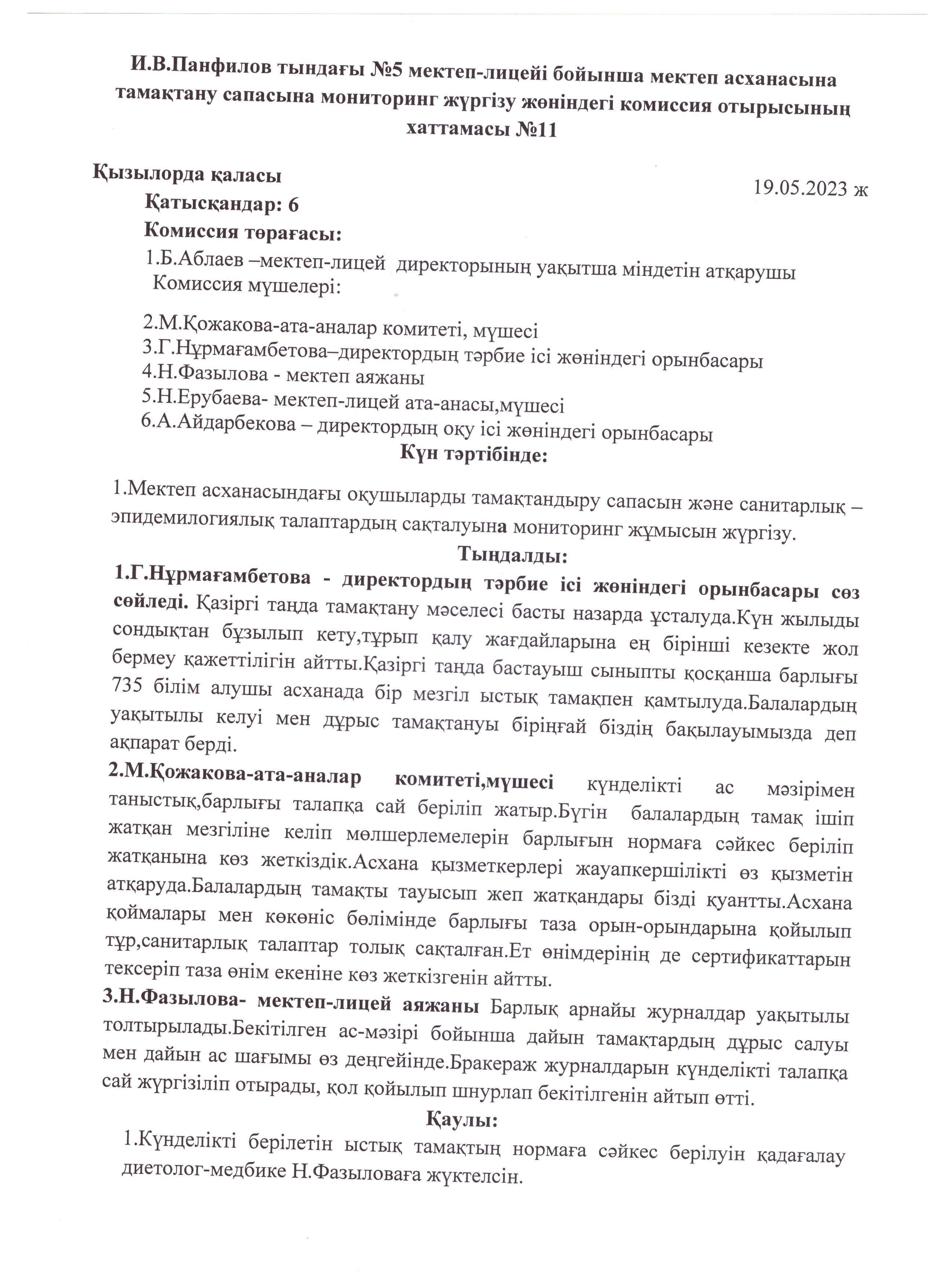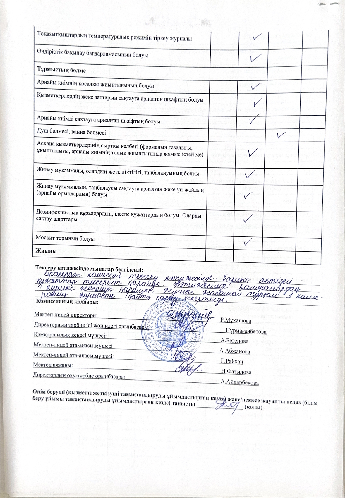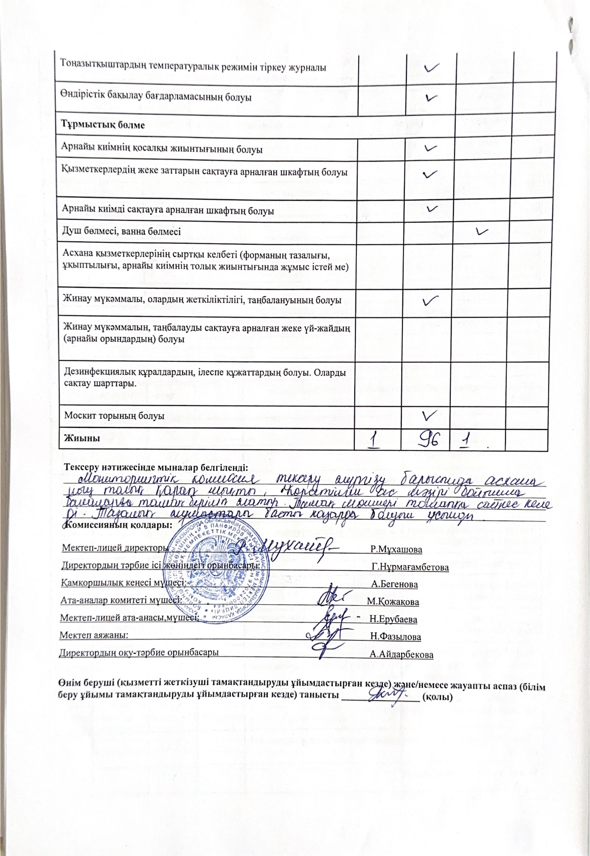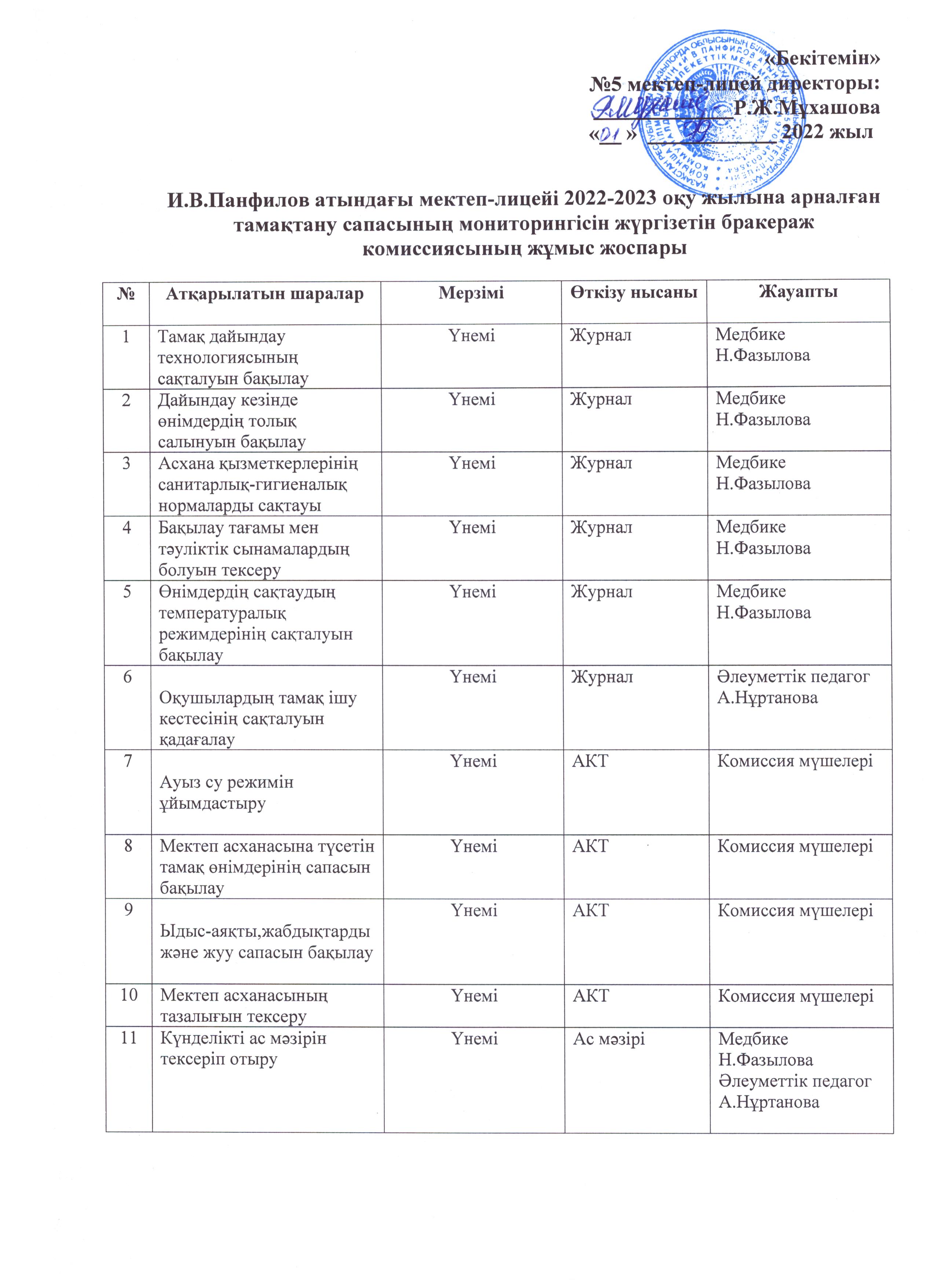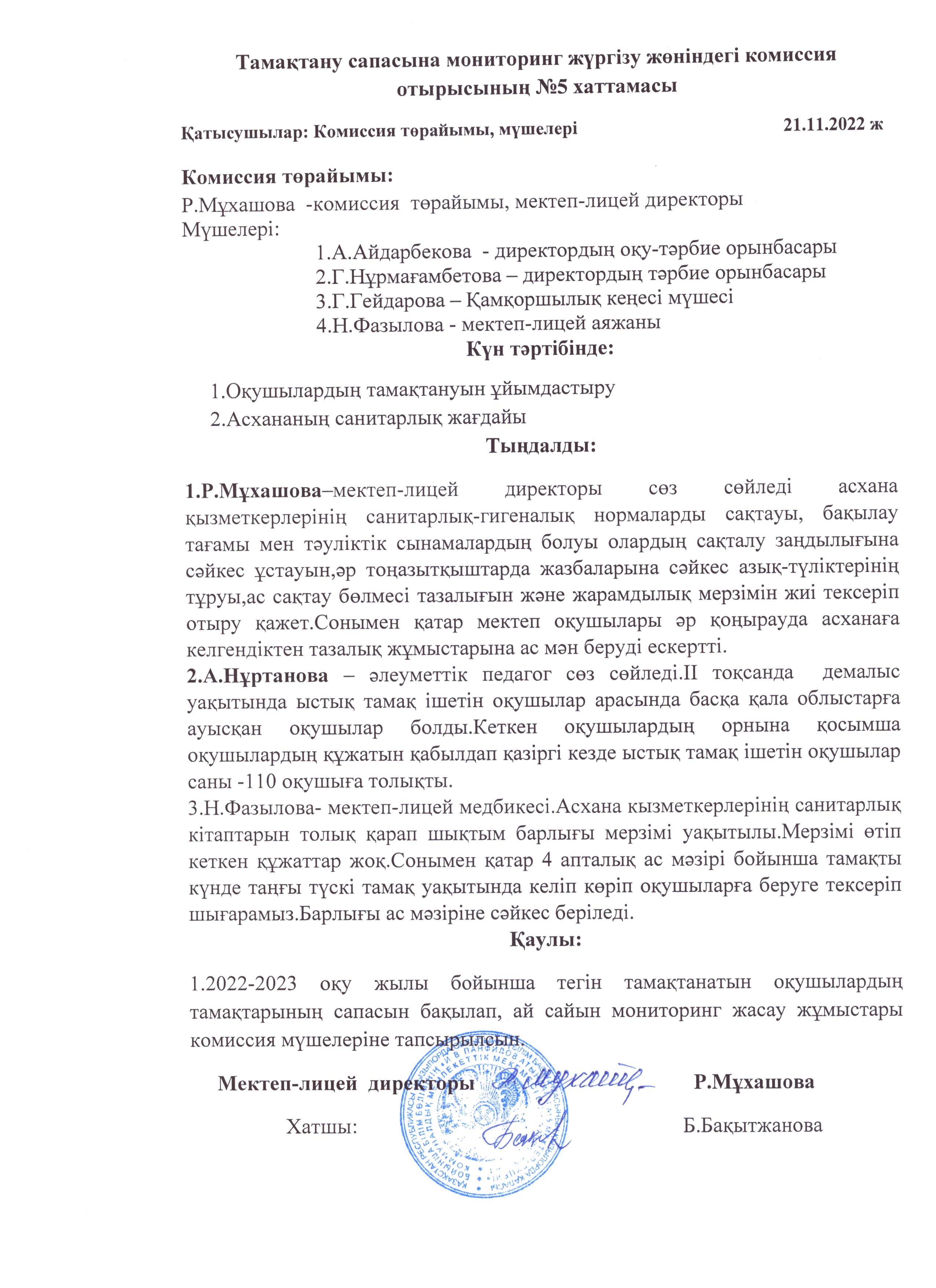 Мектептің асханасы 132 орындық.Тамақ пісіру, азық түлік сақтау бөлмелері бар. Асхананы жалға алушы кәсіпкер Махамбетова Гулшат. Асхана аптасына 5 күн: бірінші және екінші ауысымда жұмыс істейді. Күнделікті тамақ пен ас мәзірін және оның берілуін мектеп медбикесі Н. Фазылова және әлеуметтік педагог А. Нұртанова қадағалайды.Тамақтану бірінші ауысымда сағат 10.25-10.35 аралығында, екінші ауысымда сағат 16.20-16.30 аралығында кезекші мұғалімдер мен сынып жетекшілерінің көмегімен жүзеге асырылады.Бір балаға арналған тамақтың құны 557 теңге. Мектепте жұмыс жасап отырған асхана санитарлық ереже талабына сай.Технологиялық құралдармен, тамақ пісіретін қажетті электр плиталары, ыдыс аяқтар және тоңазытқыштармен қамтылған. Асхананың материалдық - техникалық базасы жақсы деңгейде.Қойма бөлмесі, мұздатқыш жұмыс жасап тұр. Тамақ асханада дайындалады. Асханада 2 аспазшы, 1 буфетші, 2 наубайшы,1 ыдыс жуушы, 1 еден жуушы және 2 зал қызметкері 1 диетолог қызмет етеді.Аспаздардың кәсіптік білімі бар. Жасөспірімдердің тамағының нәрлілігі мен құрамы талапқа сай болуы үнемі басты назарда. Асханада ас мәзірінің орны белгіленіп, күнделікті берілетін дәруменді тамақтар мен жеміс жидектердің ауысып келіп отырылуын мектеп әкімшілігі басшылықта ұстайды.Тамақ пісіруде йодталған тұз пайдаланылады. Сүт өнімдері де белгіленген нормаға сәйкес берілуде. Экологиялық таза сумен қамтылған.Асхананың жұмыс істеуіне қажетті бұйрықтар шығарылып,ыстық тамақпен қамтылған оқушылар тізімі мен тамақтану кестесі жасақталды.