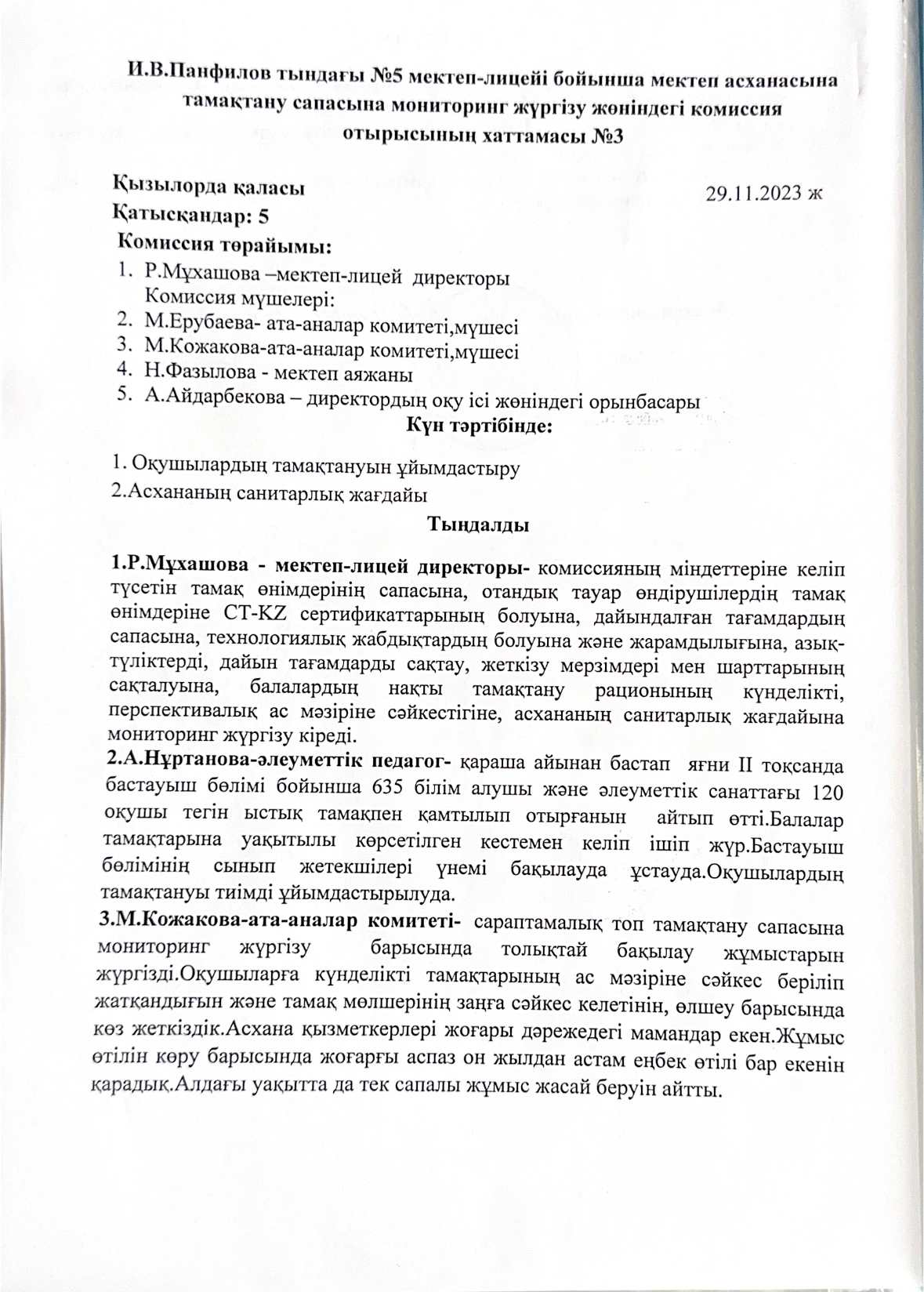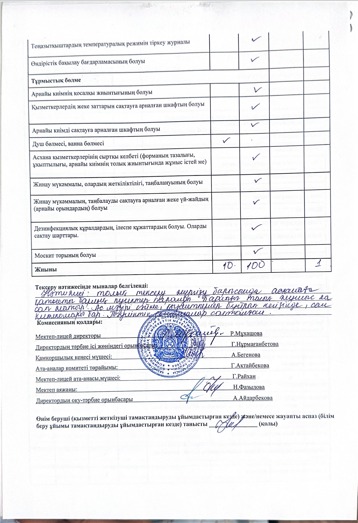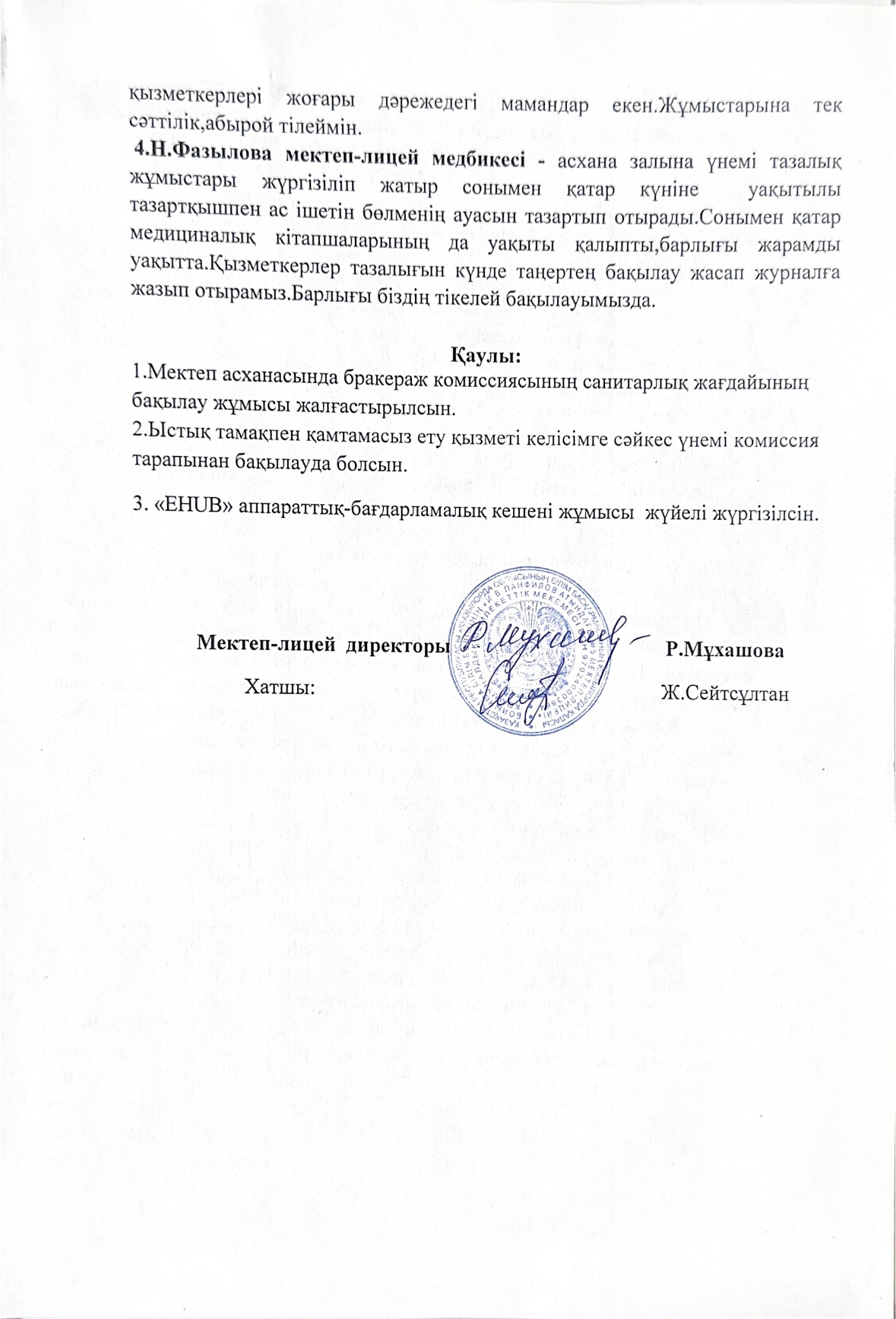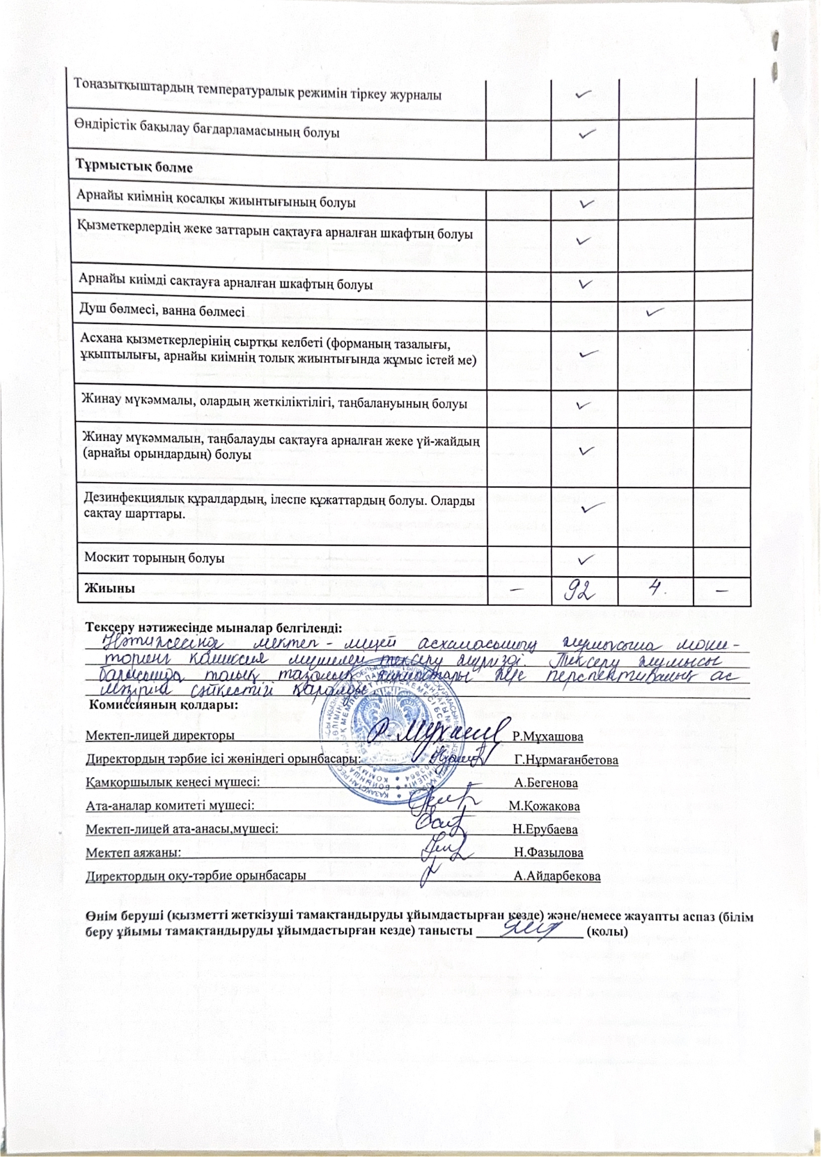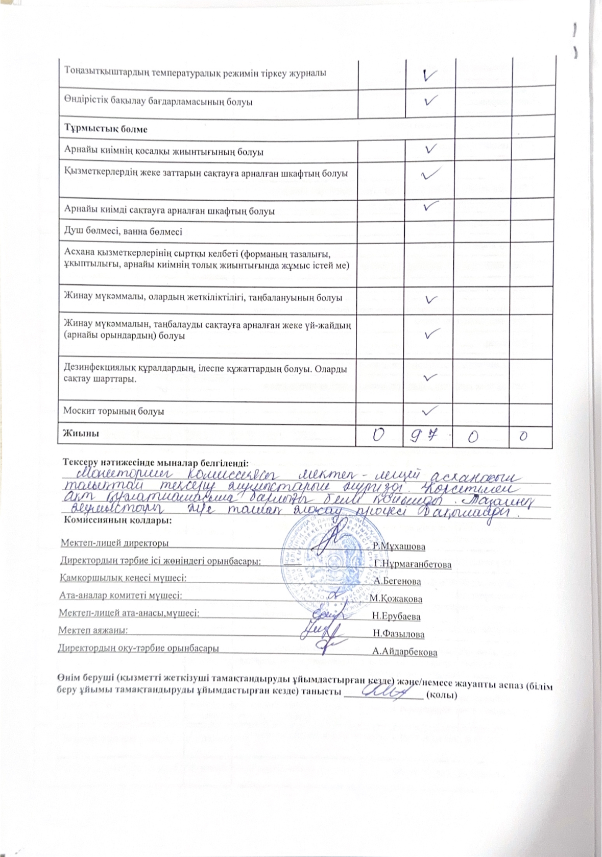 Мектептің асханасы 132 орындық.Тамақ пісіру, азық түлік сақтау бөлмелері бар. Асхананы жалға алушы кәсіпкер Махамбетова Гулшат. Асхана аптасына 5 күн: бірінші және екінші ауысымда жұмыс істейді. Күнделікті тамақ пен ас мәзірін және оның берілуін мектеп медбикесі Н. Фазылова және әлеуметтік педагог А. Нұртанова қадағалайды.Тамақтану бірінші ауысымда сағат 10.25-10.35 аралығында, екінші ауысымда сағат 16.20-16.30 аралығында кезекші мұғалімдер мен сынып жетекшілерінің көмегімен жүзеге асырылады.Бір балаға арналған тамақтың құны 557 теңге. Мектепте жұмыс жасап отырған асхана санитарлық ереже талабына сай.Технологиялық құралдармен, тамақ пісіретін қажетті электр плиталары, ыдыс аяқтар және тоңазытқыштармен қамтылған. Асхананың материалдық - техникалық базасы жақсы деңгейде.Қойма бөлмесі, мұздатқыш жұмыс жасап тұр. Тамақ асханада дайындалады. Асханада 2 аспазшы, 1 буфетші, 2 наубайшы,1 ыдыс жуушы, 1 еден жуушы және 2 зал қызметкері 1 диетолог қызмет етеді.Аспаздардың кәсіптік білімі бар. Жасөспірімдердің тамағының нәрлілігі мен құрамы талапқа сай болуы үнемі басты назарда. Асханада ас мәзірінің орны белгіленіп, күнделікті берілетін дәруменді тамақтар мен жеміс жидектердің ауысып келіп отырылуын мектеп әкімшілігі басшылықта ұстайды.Тамақ пісіруде йодталған тұз пайдаланылады. Сүт өнімдері де белгіленген нормаға сәйкес берілуде. Экологиялық таза сумен қамтылған.Асхананың жұмыс істеуіне қажетті бұйрықтар шығарылып,ыстық тамақпен қамтылған оқушылар тізімі мен тамақтану кестесі жасақталды.