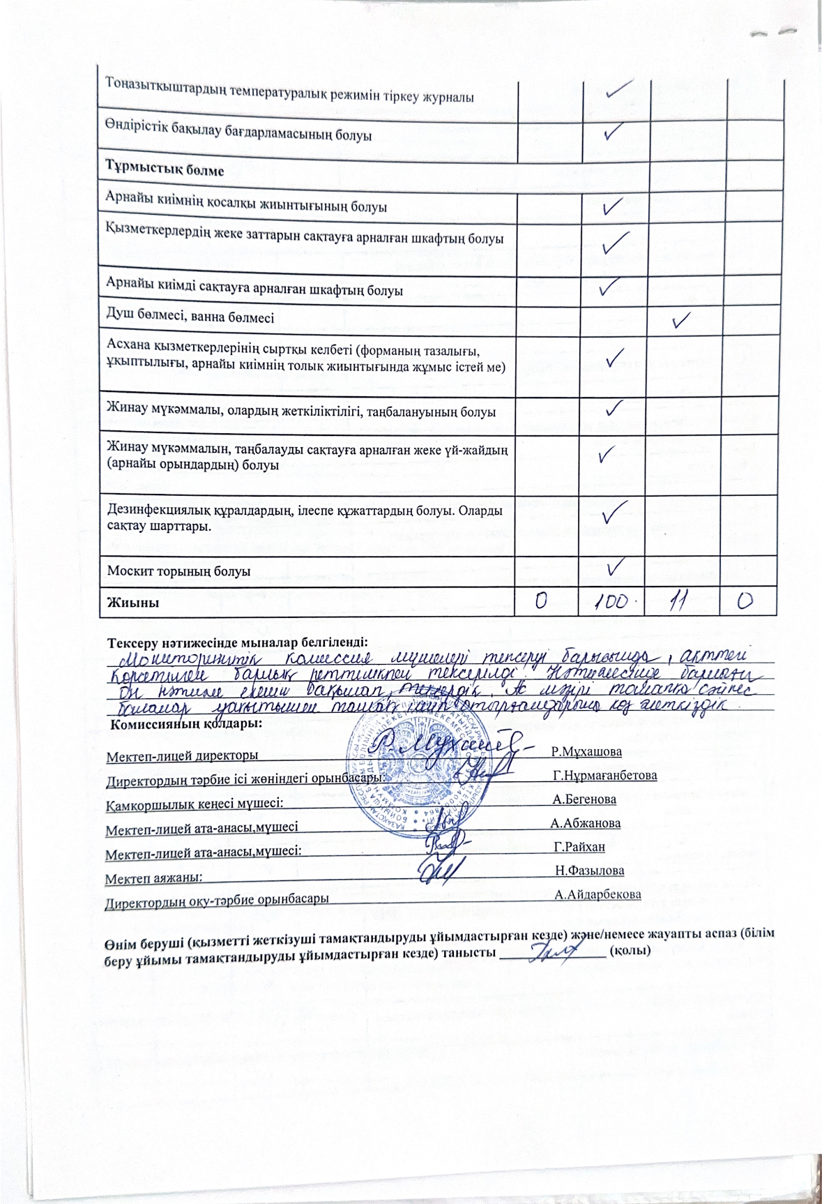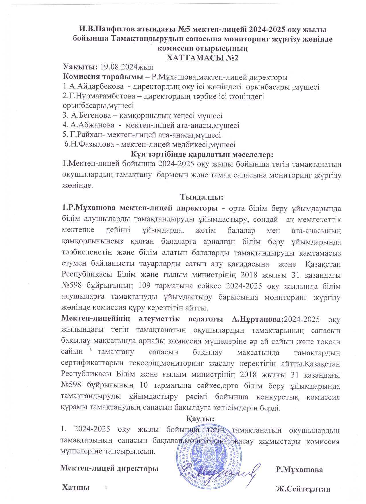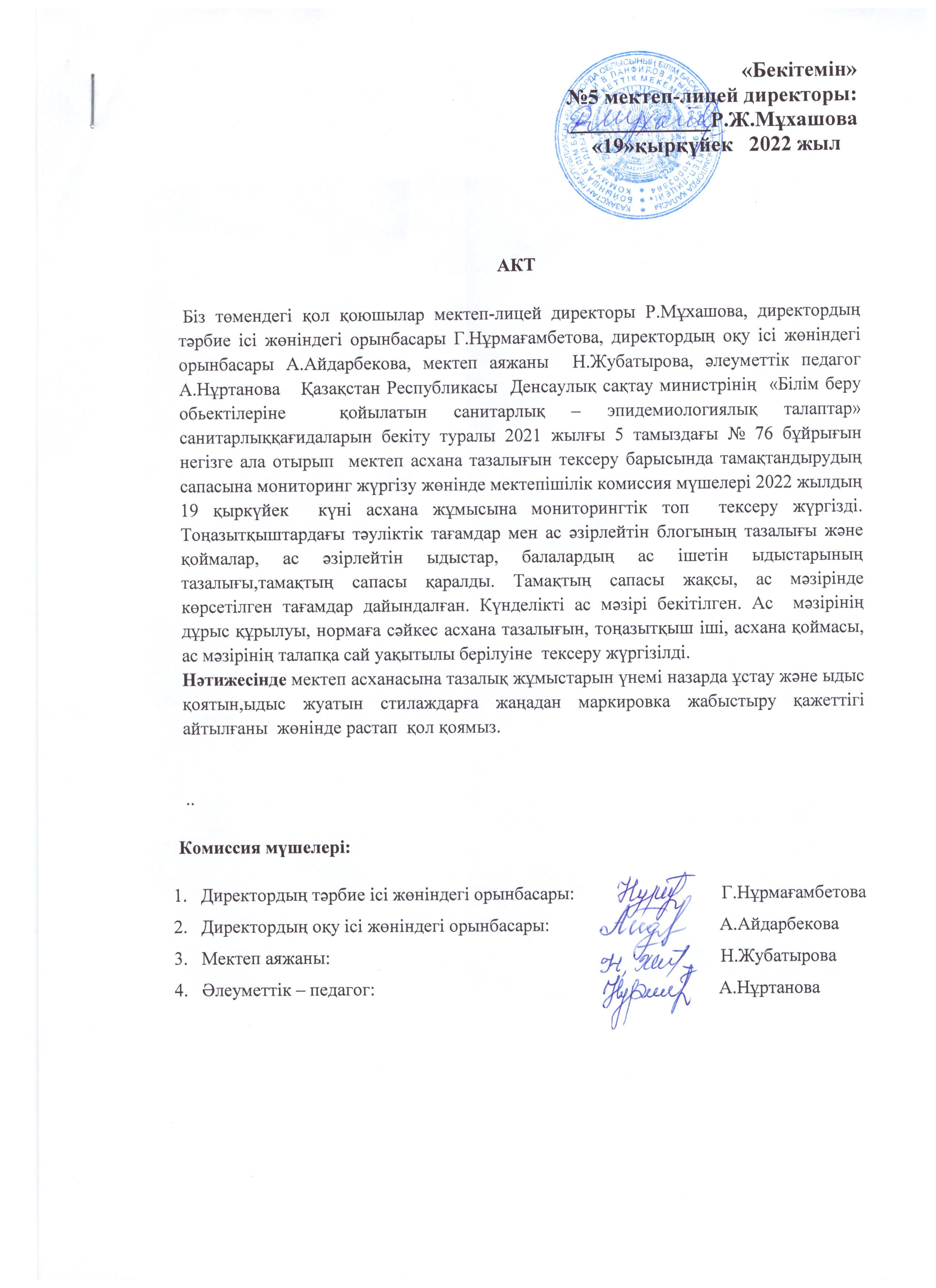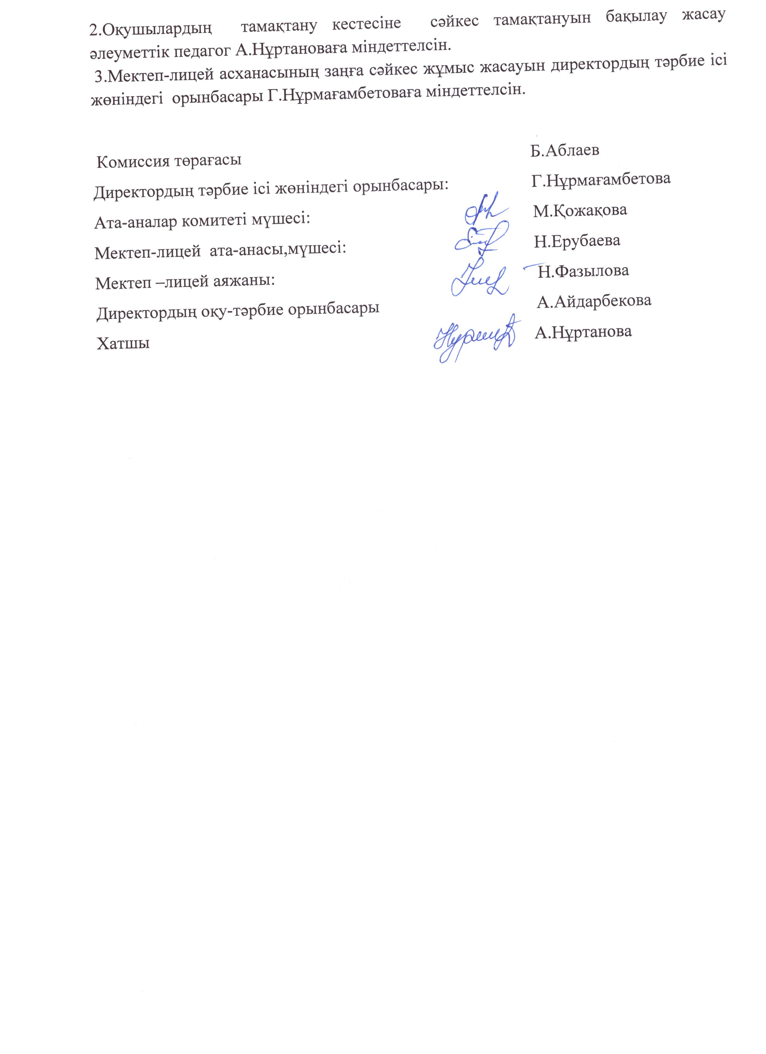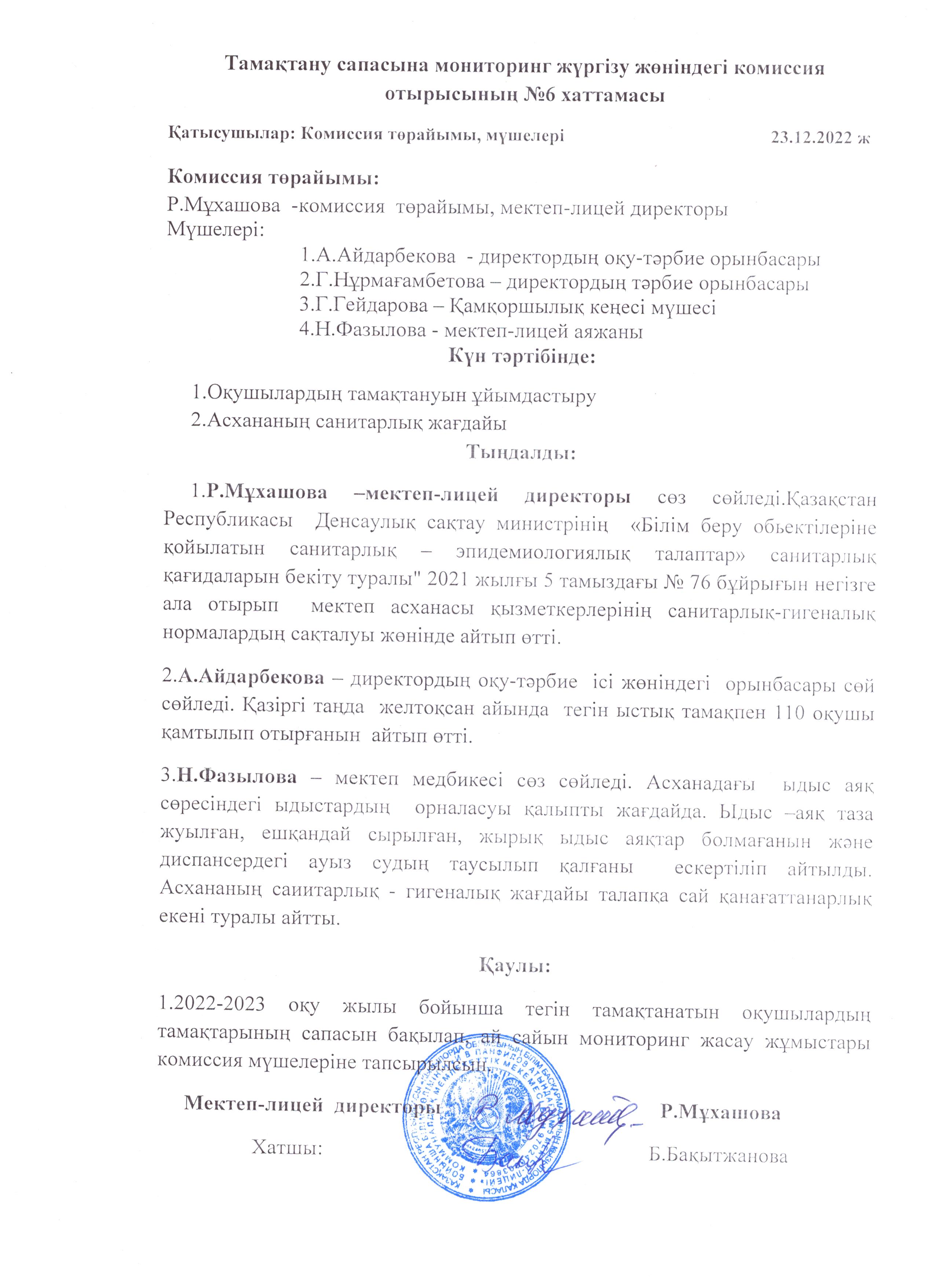 Мектептің асханасы 132 орындық.Тамақ пісіру, азық түлік сақтау бөлмелері бар. Асхананы жалға алушы кәсіпкер Махамбетова Гулшат. Асхана аптасына 5 күн: бірінші және екінші ауысымда жұмыс істейді. Күнделікті тамақ пен ас мәзірін және оның берілуін мектеп медбикесі Н. Фазылова және әлеуметтік педагог А. Нұртанова қадағалайды.Тамақтану бірінші ауысымда сағат 10.25-10.35 аралығында, екінші ауысымда сағат 16.20-16.30 аралығында кезекші мұғалімдер мен сынып жетекшілерінің көмегімен жүзеге асырылады.Бір балаға арналған тамақтың құны 557 теңге. Мектепте жұмыс жасап отырған асхана санитарлық ереже талабына сай.Технологиялық құралдармен, тамақ пісіретін қажетті электр плиталары, ыдыс аяқтар және тоңазытқыштармен қамтылған. Асхананың материалдық - техникалық базасы жақсы деңгейде.Қойма бөлмесі, мұздатқыш жұмыс жасап тұр. Тамақ асханада дайындалады. Асханада 2 аспазшы, 1 буфетші, 2 наубайшы,1 ыдыс жуушы, 1 еден жуушы және 2 зал қызметкері 1 диетолог қызмет етеді.Аспаздардың кәсіптік білімі бар. Жасөспірімдердің тамағының нәрлілігі мен құрамы талапқа сай болуы үнемі басты назарда. Асханада ас мәзірінің орны белгіленіп, күнделікті берілетін дәруменді тамақтар мен жеміс жидектердің ауысып келіп отырылуын мектеп әкімшілігі басшылықта ұстайды.Тамақ пісіруде йодталған тұз пайдаланылады. Сүт өнімдері де белгіленген нормаға сәйкес берілуде. Экологиялық таза сумен қамтылған.Асхананың жұмыс істеуіне қажетті бұйрықтар шығарылып,ыстық тамақпен қамтылған оқушылар тізімі мен тамақтану кестесі жасақталды.