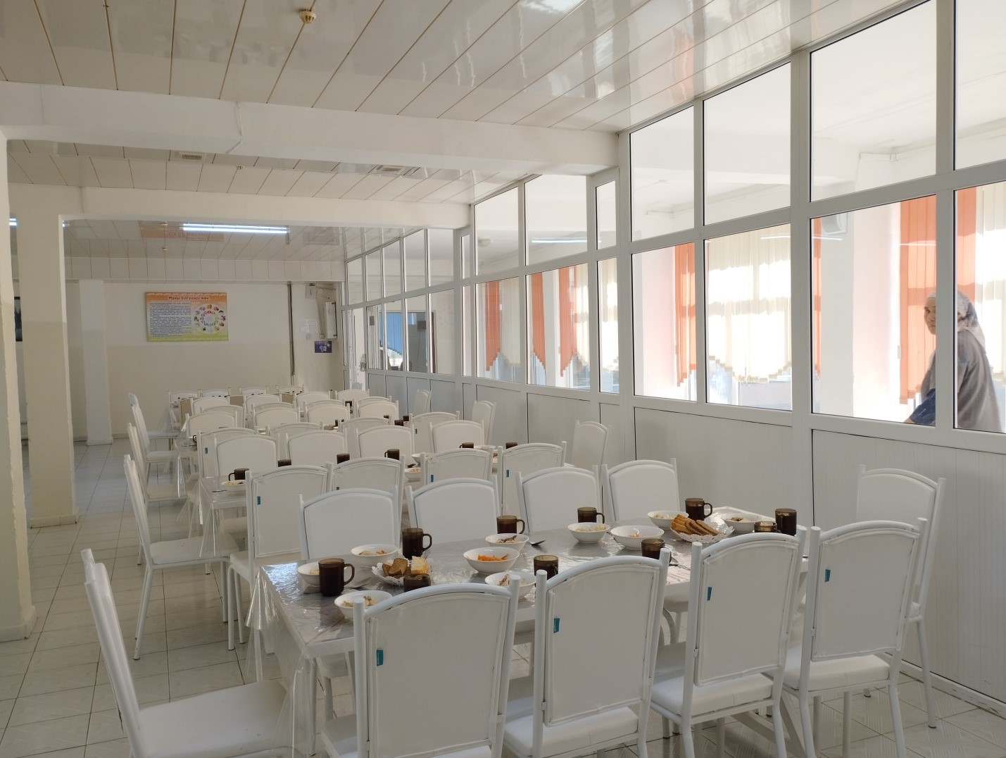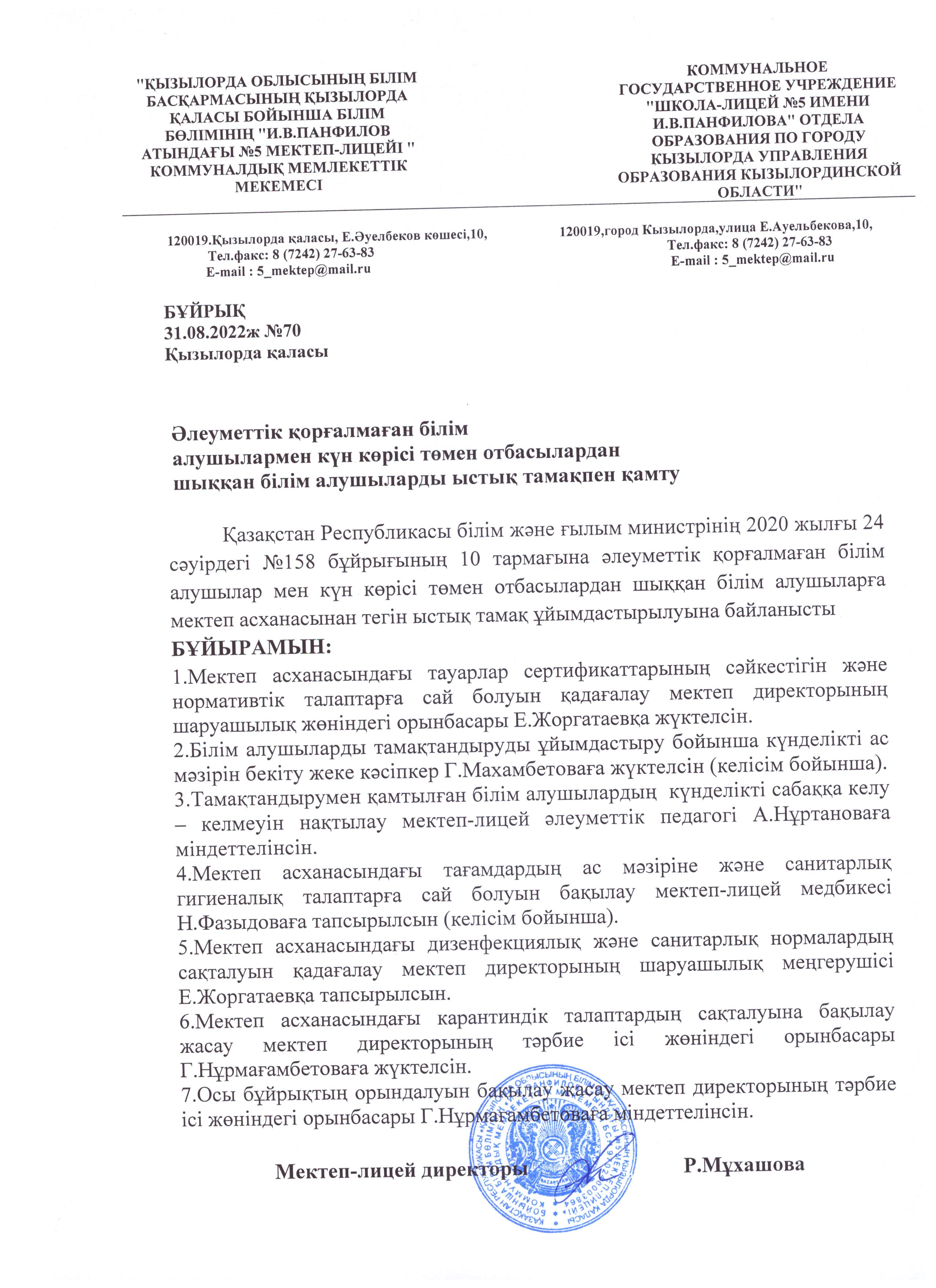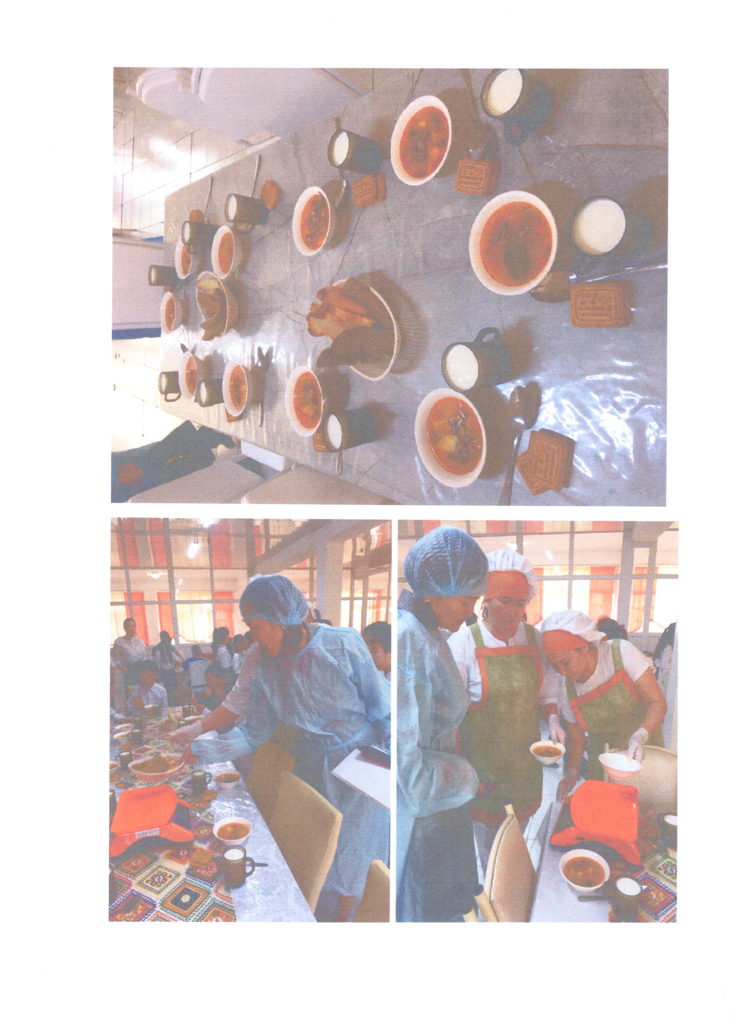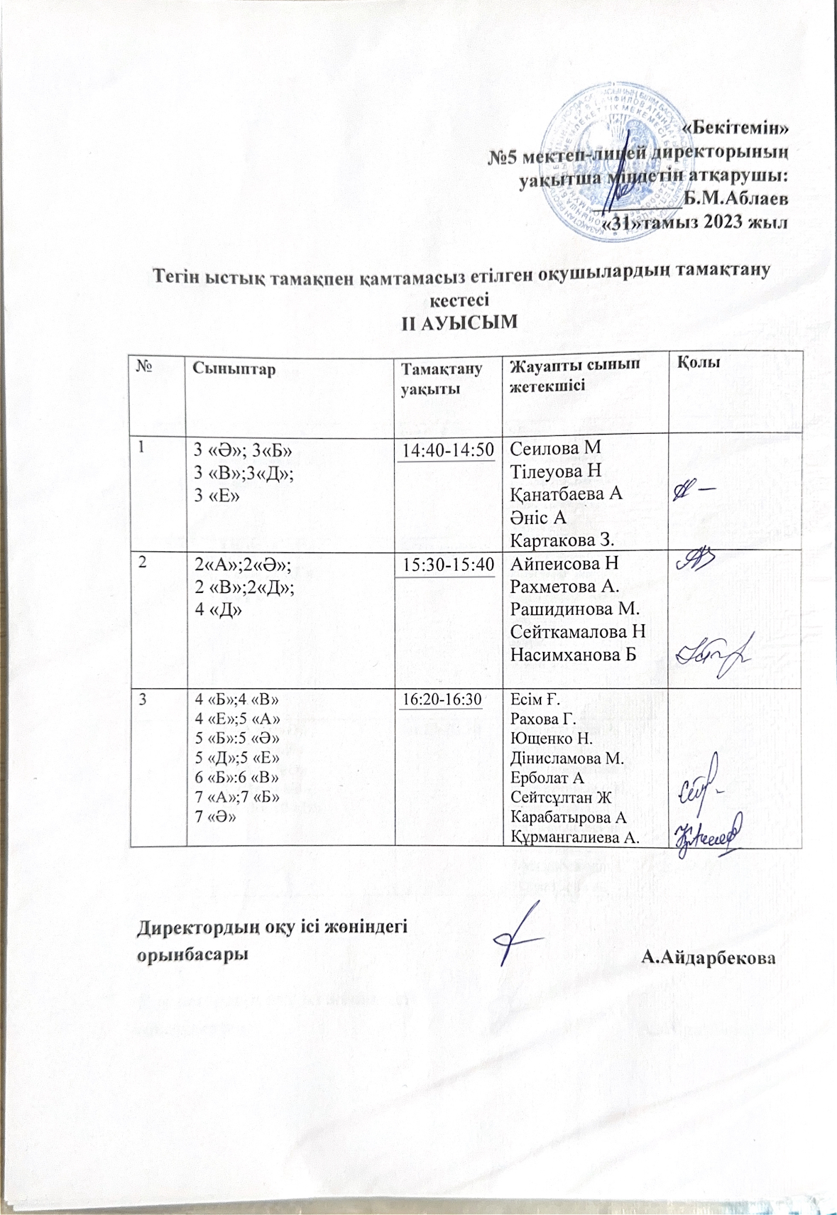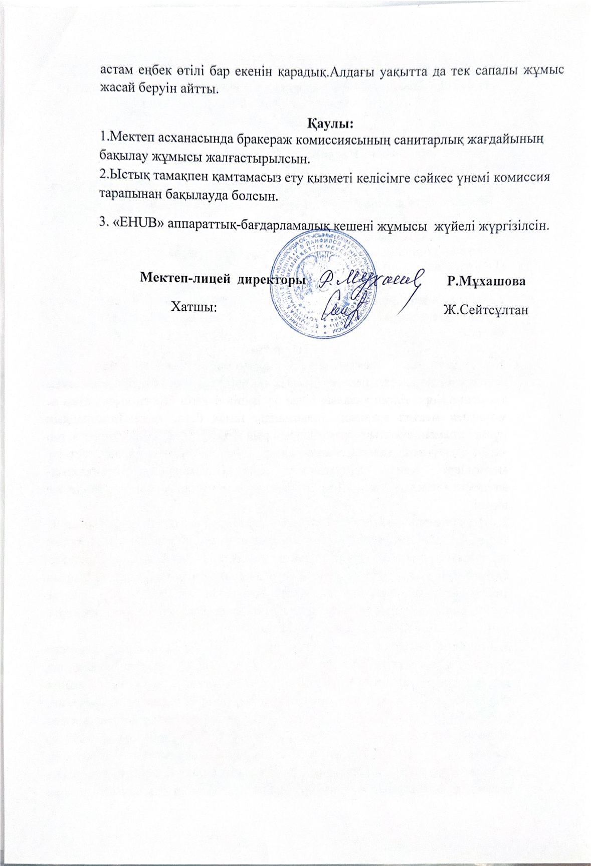 Мектептің асханасы 132 орындық.Тамақ пісіру, азық түлік сақтау бөлмелері бар. Асхананы жалға алушы кәсіпкер Махамбетова Гулшат. Асхана аптасына 5 күн: бірінші және екінші ауысымда жұмыс істейді. Күнделікті тамақ пен ас мәзірін және оның берілуін мектеп медбикесі Н. Фазылова және әлеуметтік педагог А. Нұртанова қадағалайды.Тамақтану бірінші ауысымда сағат 10.25-10.35 аралығында, екінші ауысымда сағат 16.20-16.30 аралығында кезекші мұғалімдер мен сынып жетекшілерінің көмегімен жүзеге асырылады.Бір балаға арналған тамақтың құны 557 теңге. Мектепте жұмыс жасап отырған асхана санитарлық ереже талабына сай.Технологиялық құралдармен, тамақ пісіретін қажетті электр плиталары, ыдыс аяқтар және тоңазытқыштармен қамтылған. Асхананың материалдық - техникалық базасы жақсы деңгейде.Қойма бөлмесі, мұздатқыш жұмыс жасап тұр. Тамақ асханада дайындалады. Асханада 2 аспазшы, 1 буфетші, 2 наубайшы,1 ыдыс жуушы, 1 еден жуушы және 2 зал қызметкері 1 диетолог қызмет етеді.Аспаздардың кәсіптік білімі бар. Жасөспірімдердің тамағының нәрлілігі мен құрамы талапқа сай болуы үнемі басты назарда. Асханада ас мәзірінің орны белгіленіп, күнделікті берілетін дәруменді тамақтар мен жеміс жидектердің ауысып келіп отырылуын мектеп әкімшілігі басшылықта ұстайды.Тамақ пісіруде йодталған тұз пайдаланылады. Сүт өнімдері де белгіленген нормаға сәйкес берілуде. Экологиялық таза сумен қамтылған.Асхананың жұмыс істеуіне қажетті бұйрықтар шығарылып,ыстық тамақпен қамтылған оқушылар тізімі мен тамақтану кестесі жасақталды.