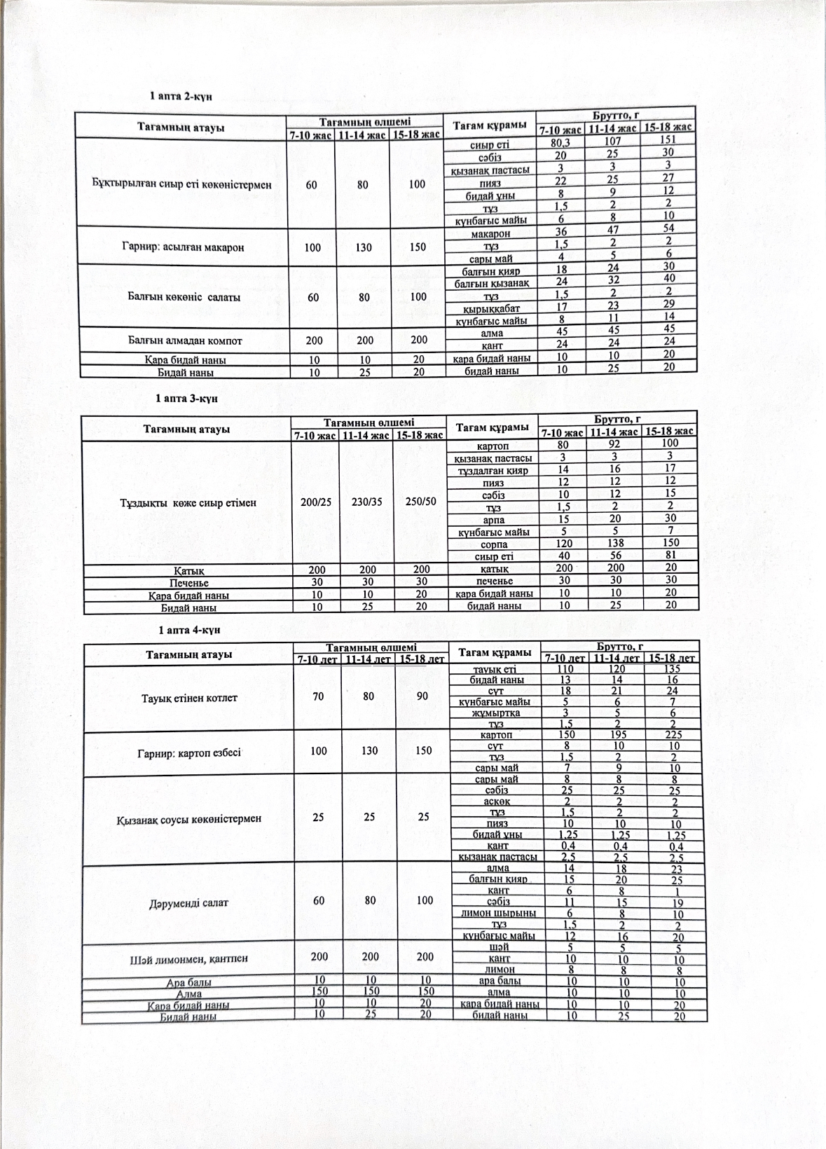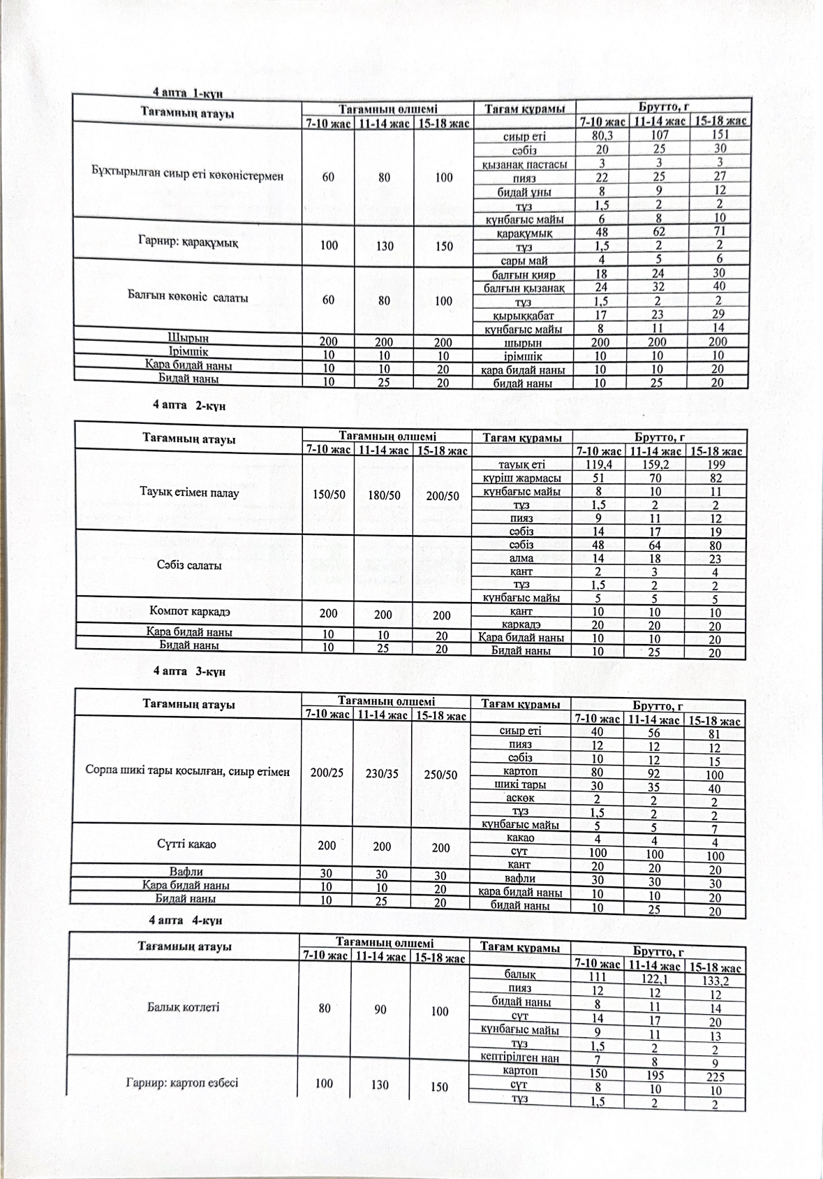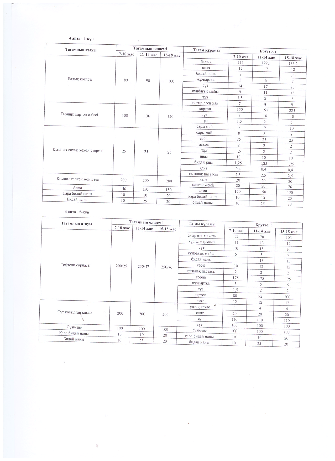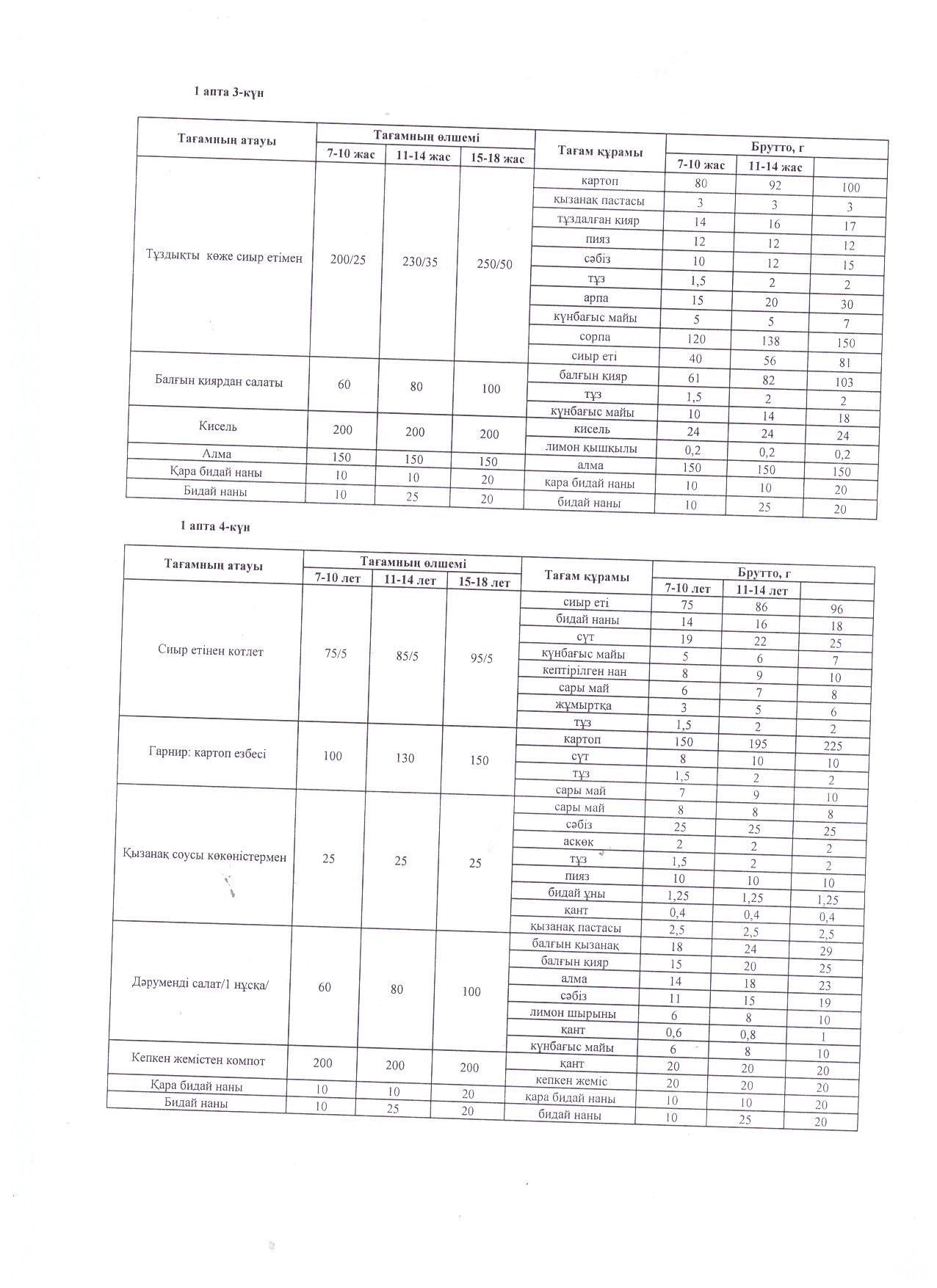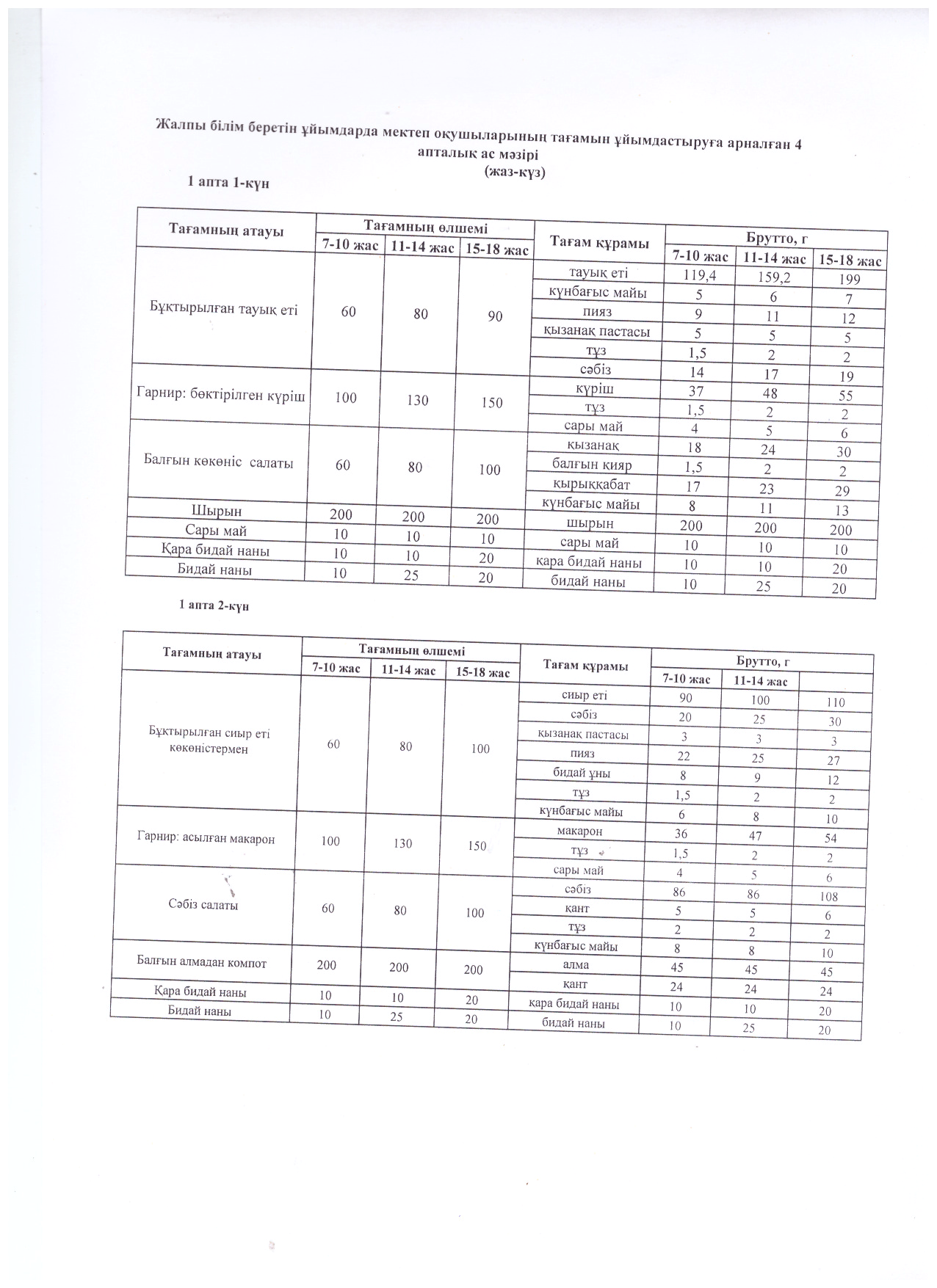 | 1 | Жалпы білім беретін ұйымдарда мектеп оқушыларының тағамын ұйымдастыруға арналған 4 апталық ас мəзірі (жаз-күз ) |