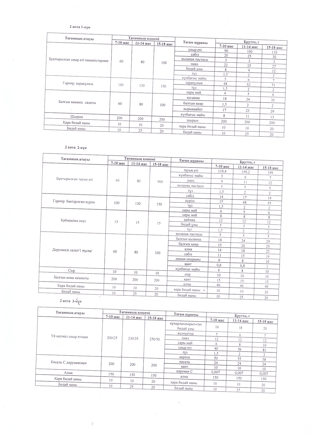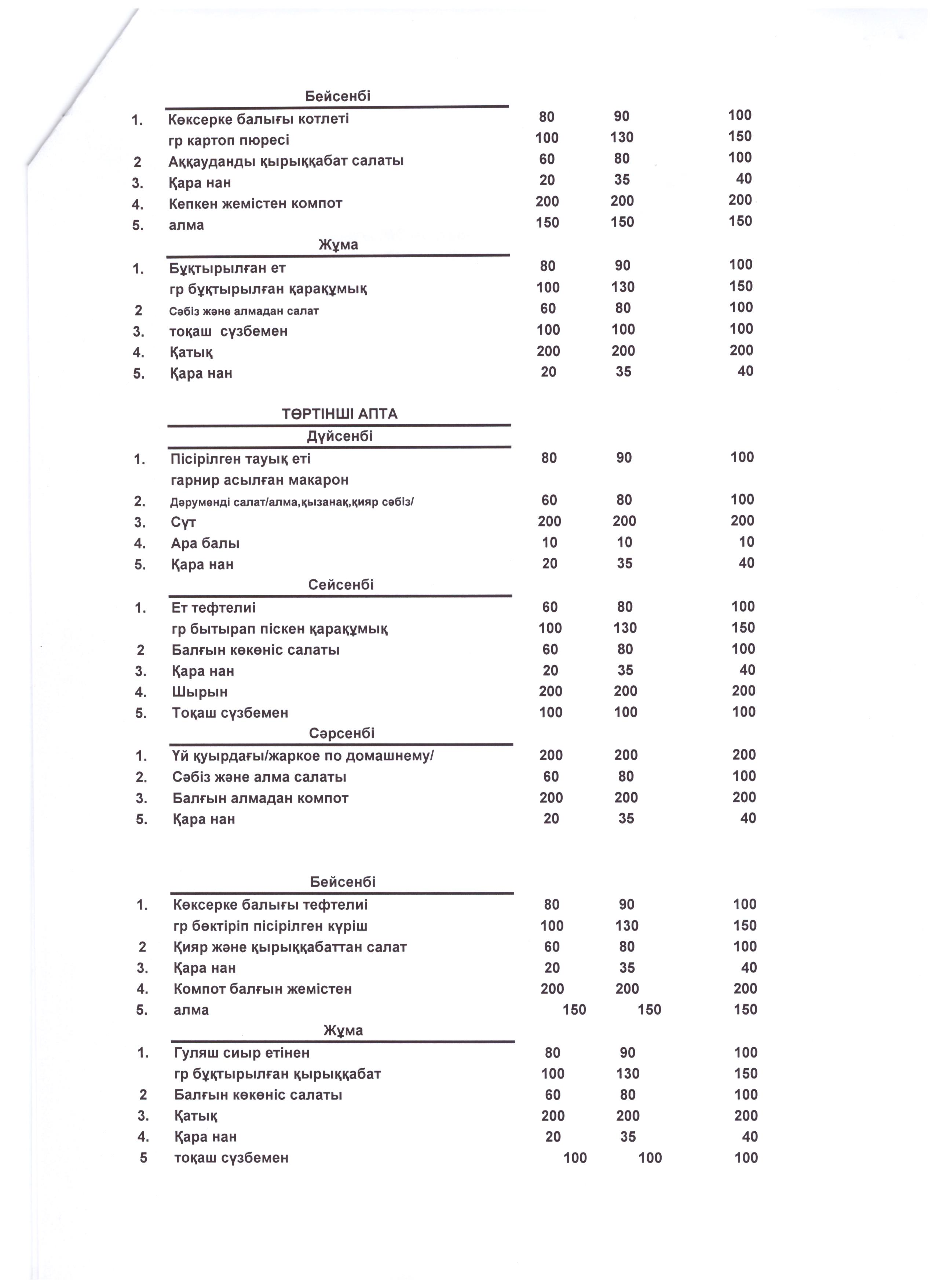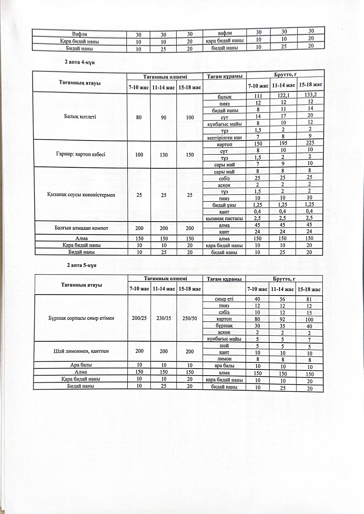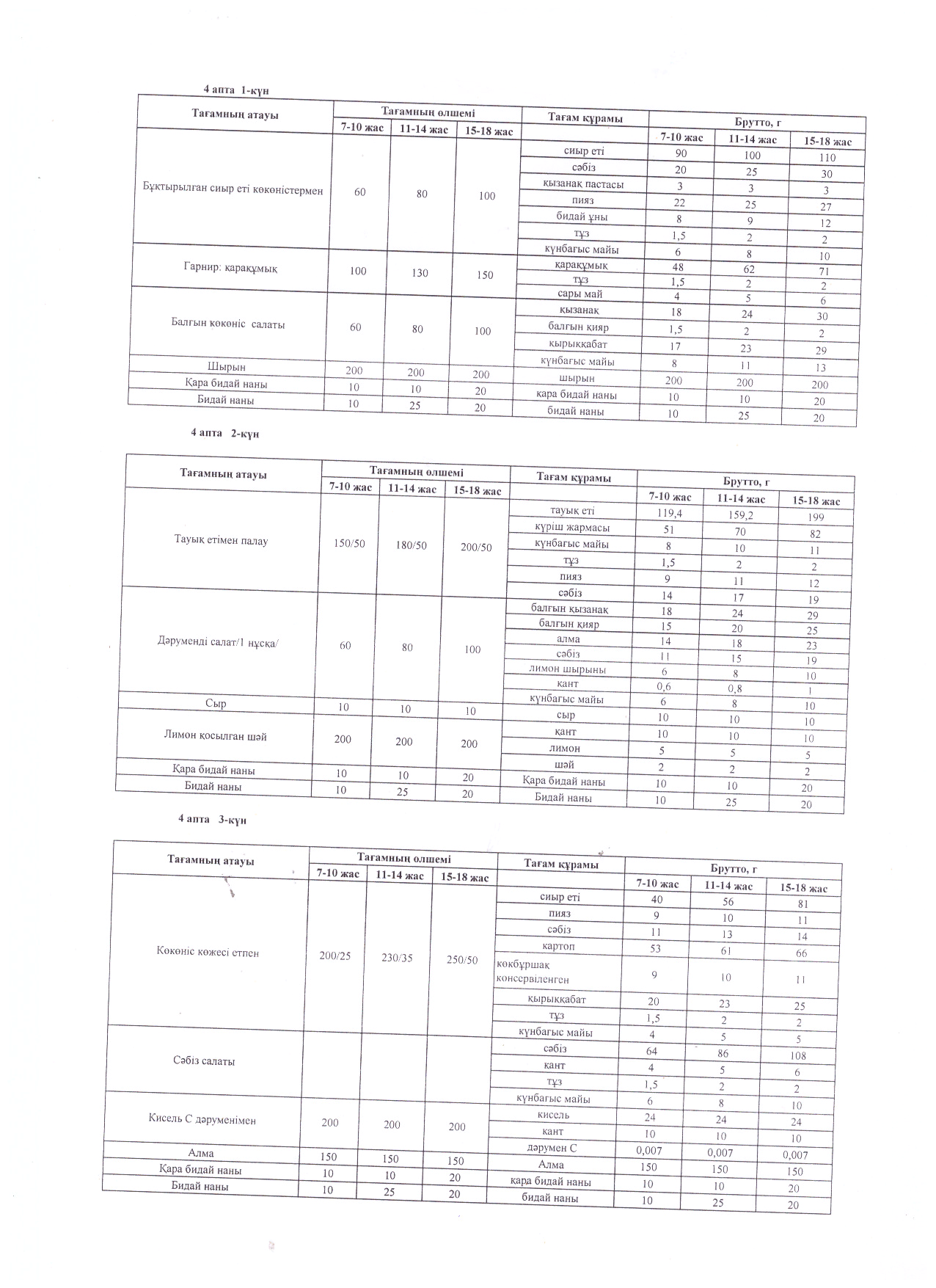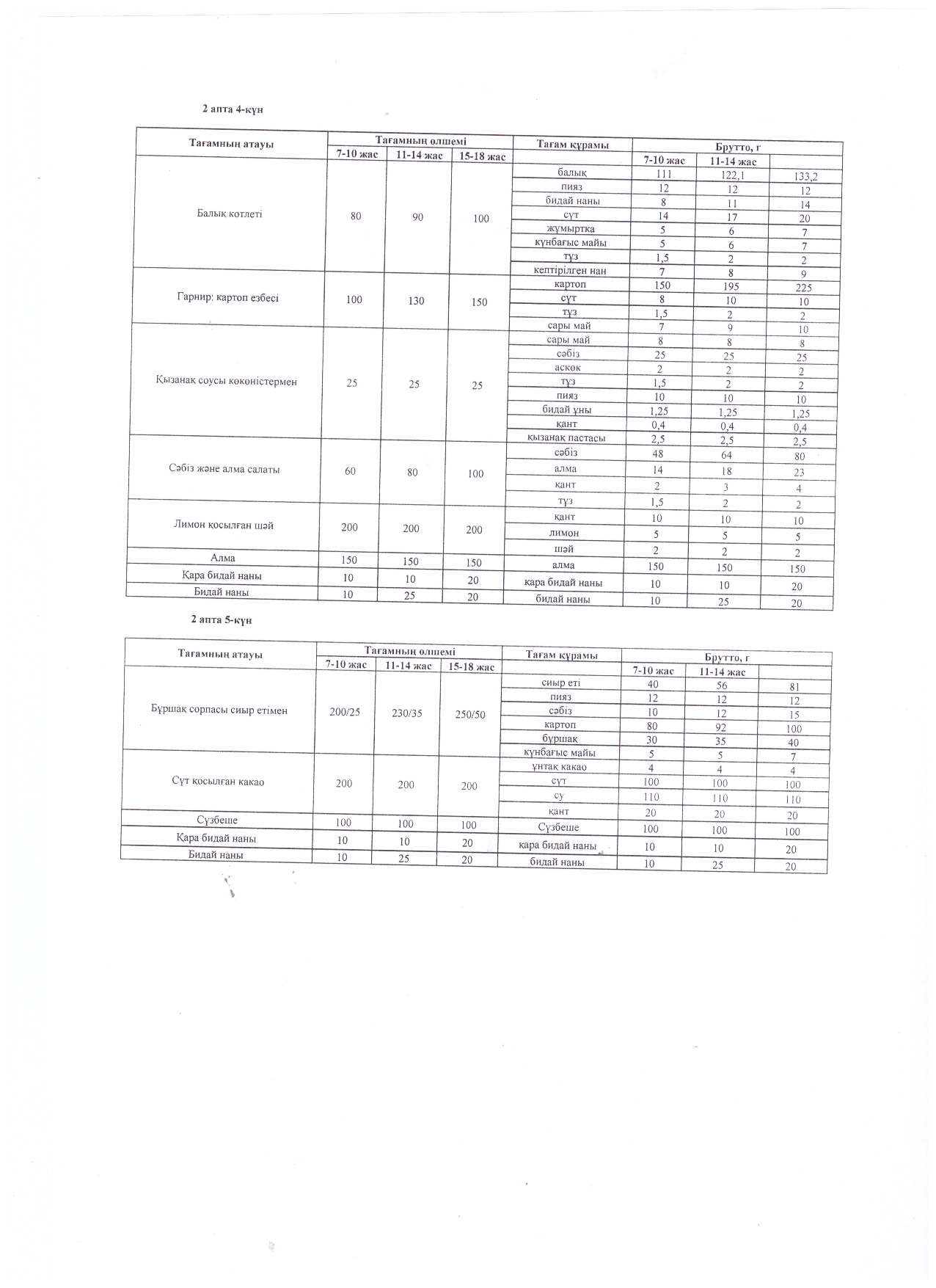 | 1 | Жалпы білім беретін ұйымдарда мектеп оқушыларының тағамын ұйымдастыруға арналған 4 апталық ас мəзірі (жаз-күз ) |