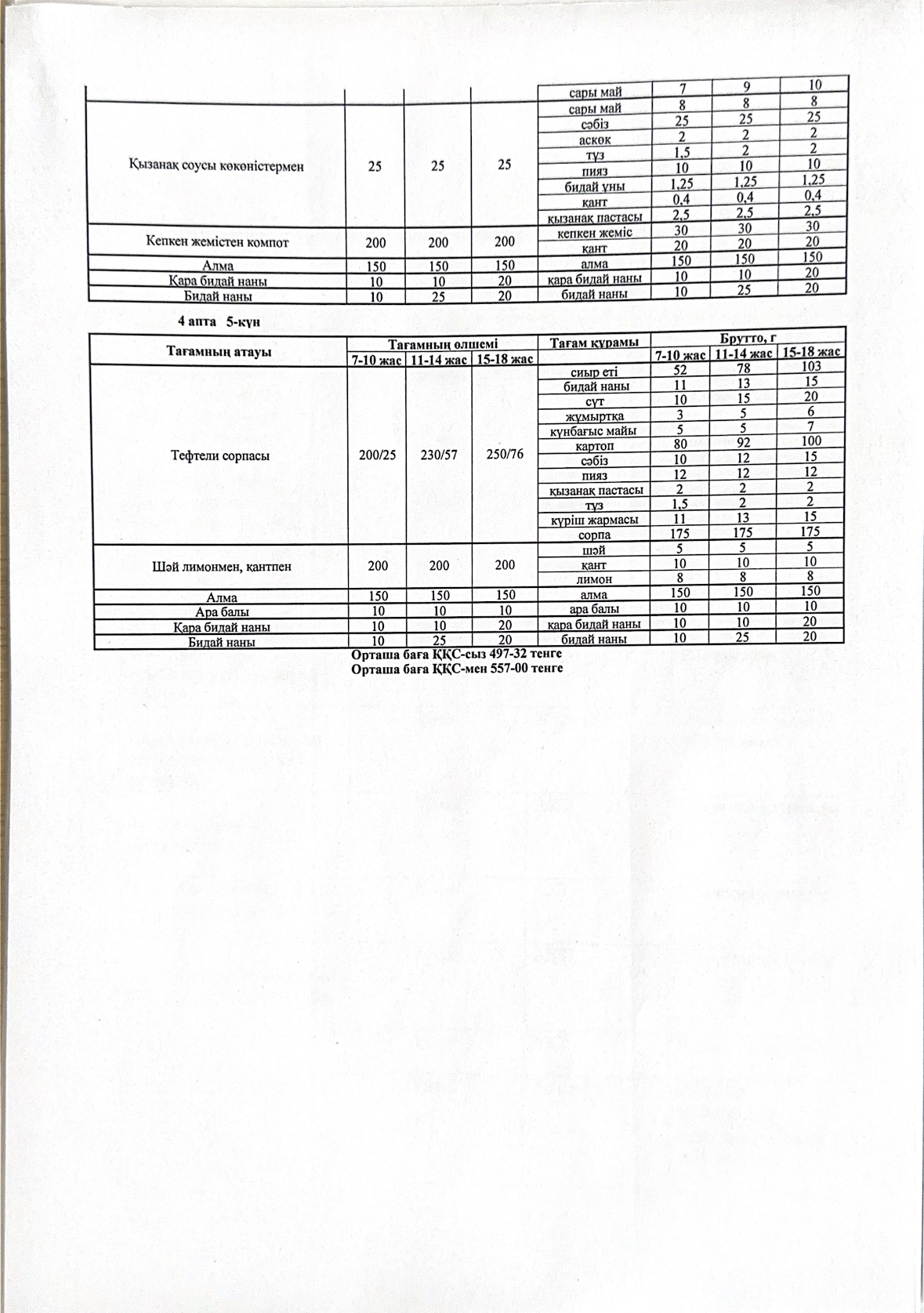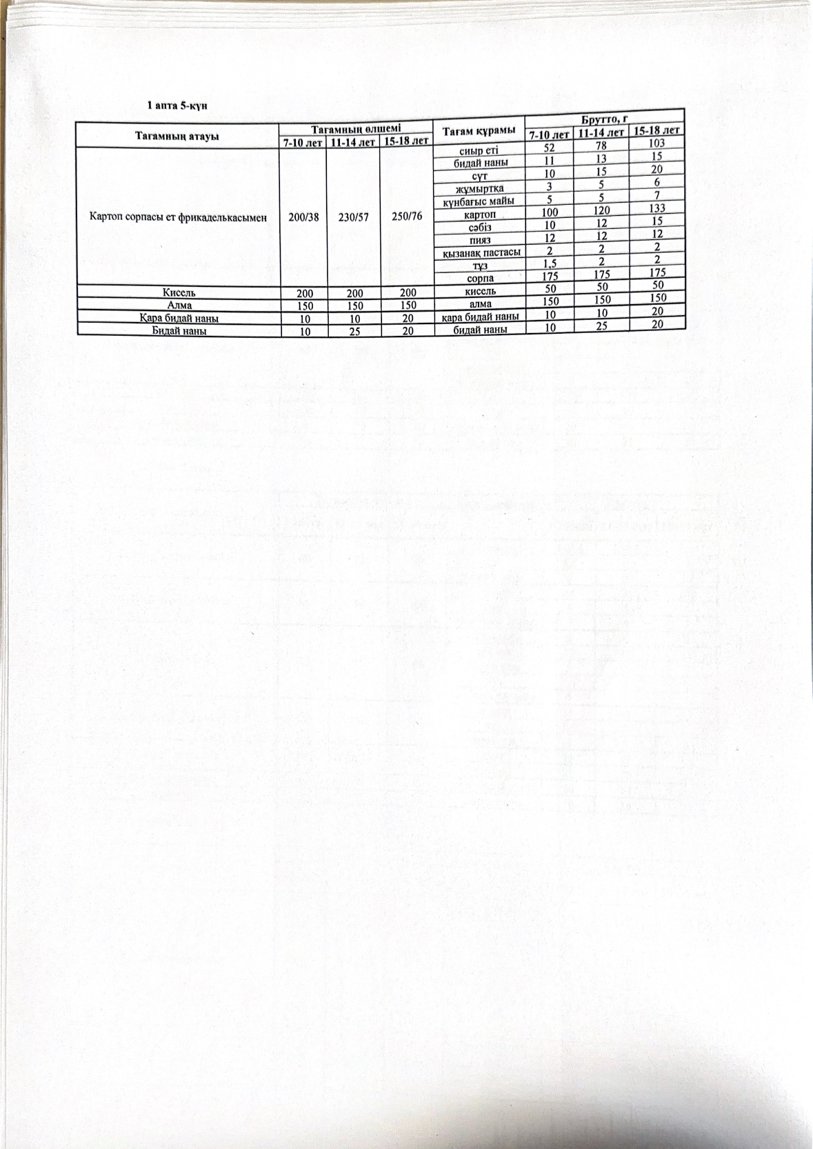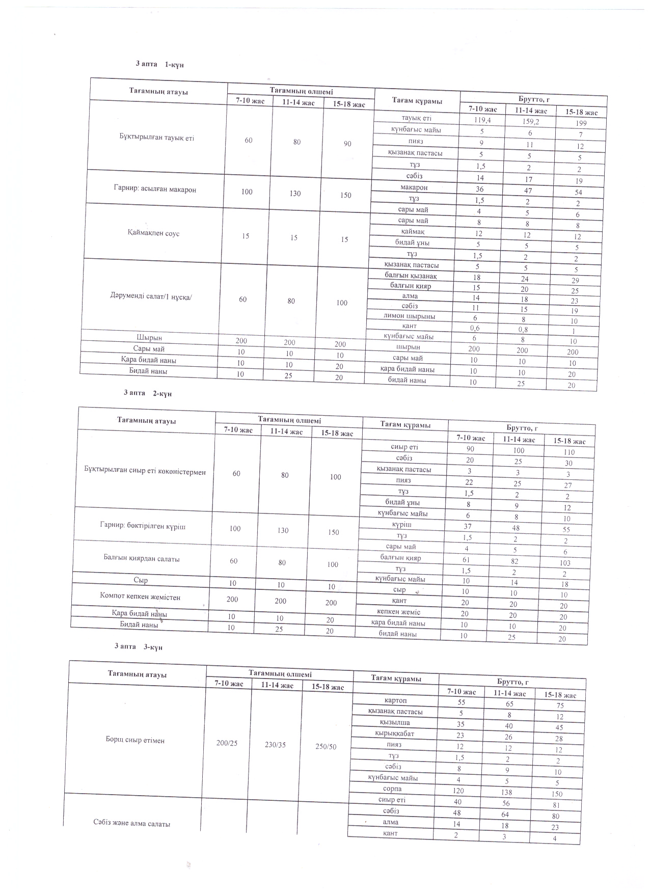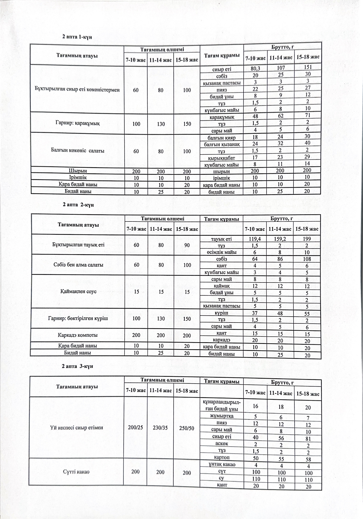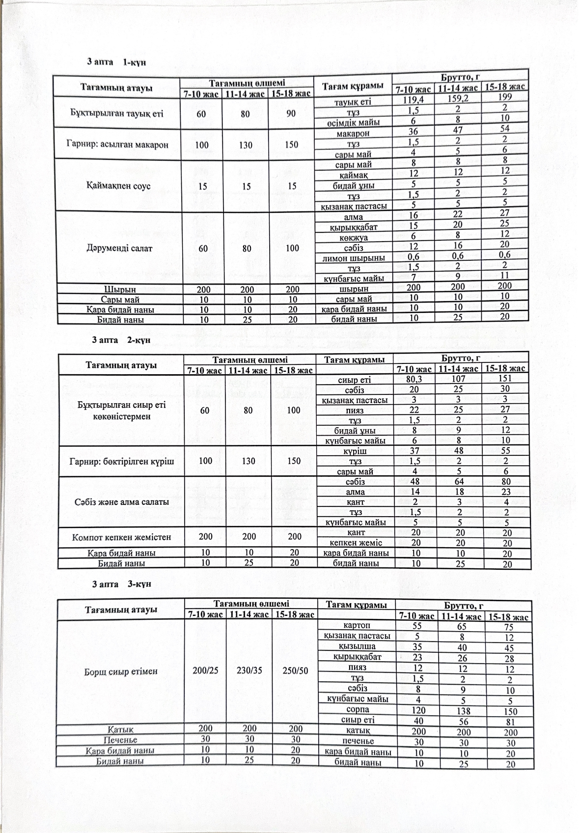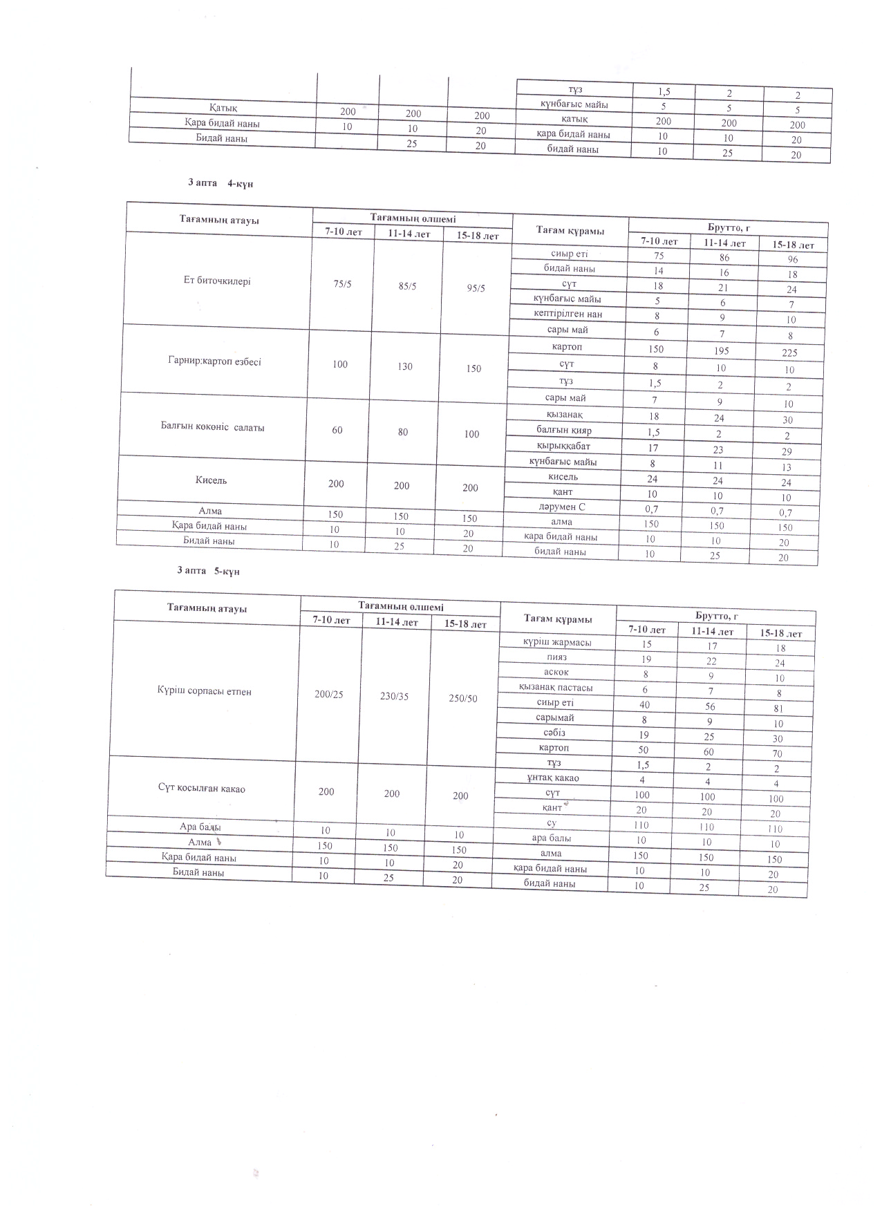 | 1 | Жалпы білім беретін ұйымдарда мектеп оқушыларының тағамын ұйымдастыруға арналған 4 апталық ас мəзірі (жаз-күз ) |