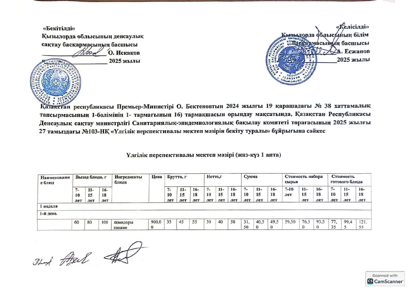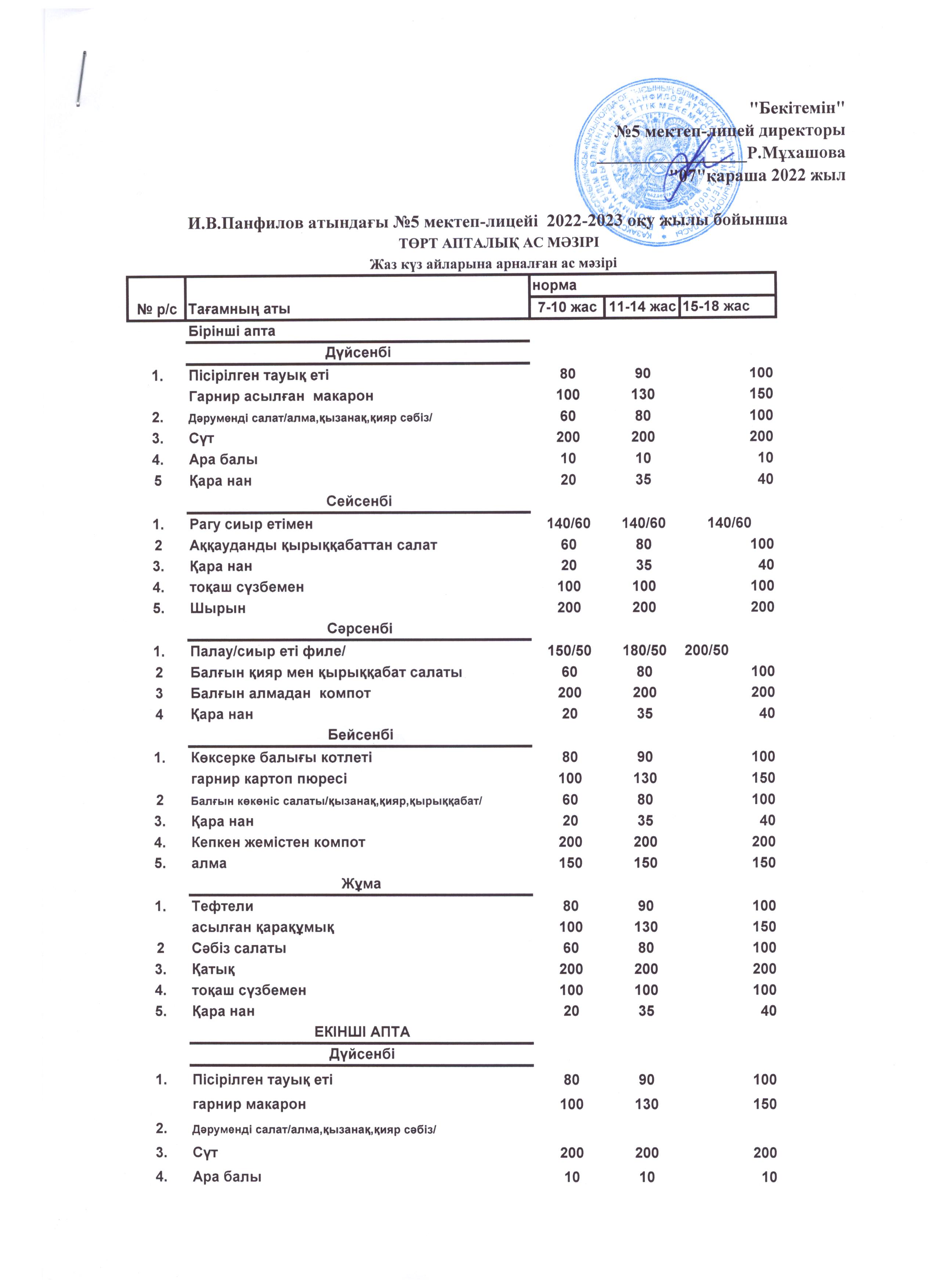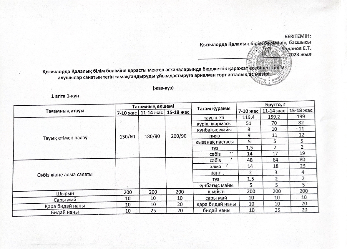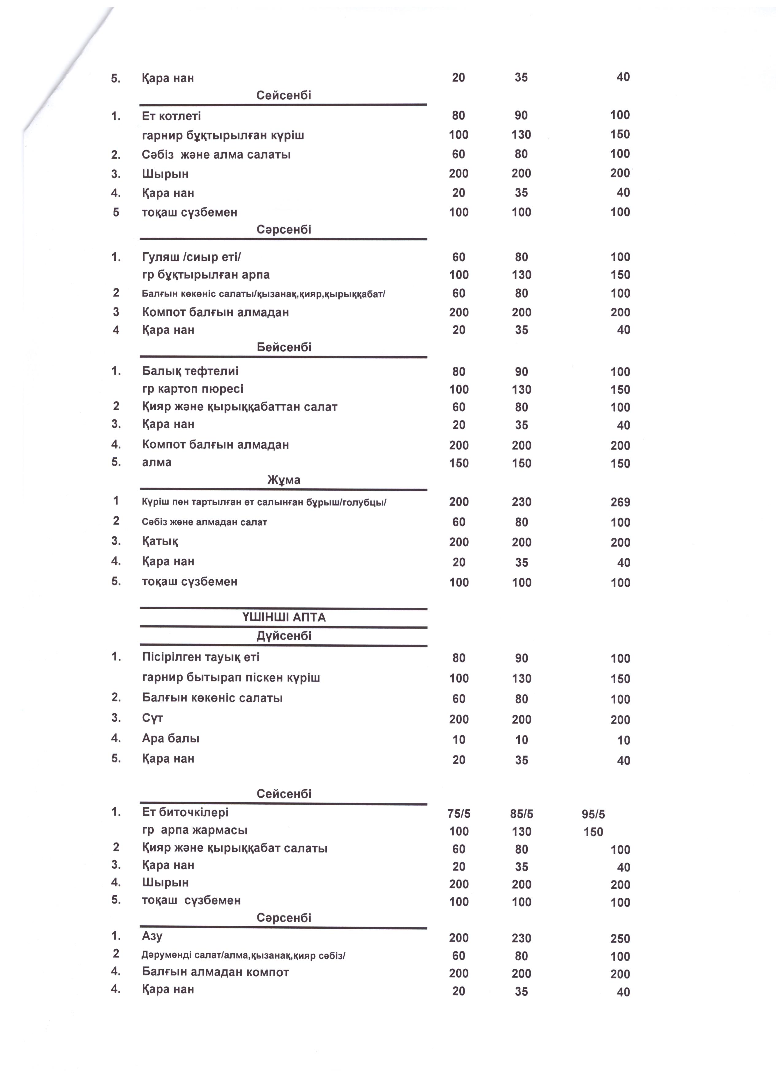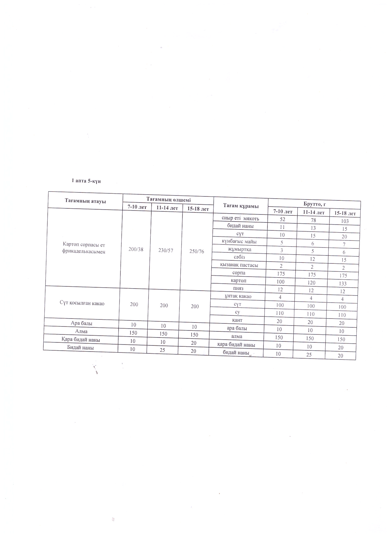 | 1 | Жалпы білім беретін ұйымдарда мектеп оқушыларының тағамын ұйымдастыруға арналған 4 апталық ас мəзірі (жаз-күз ) |