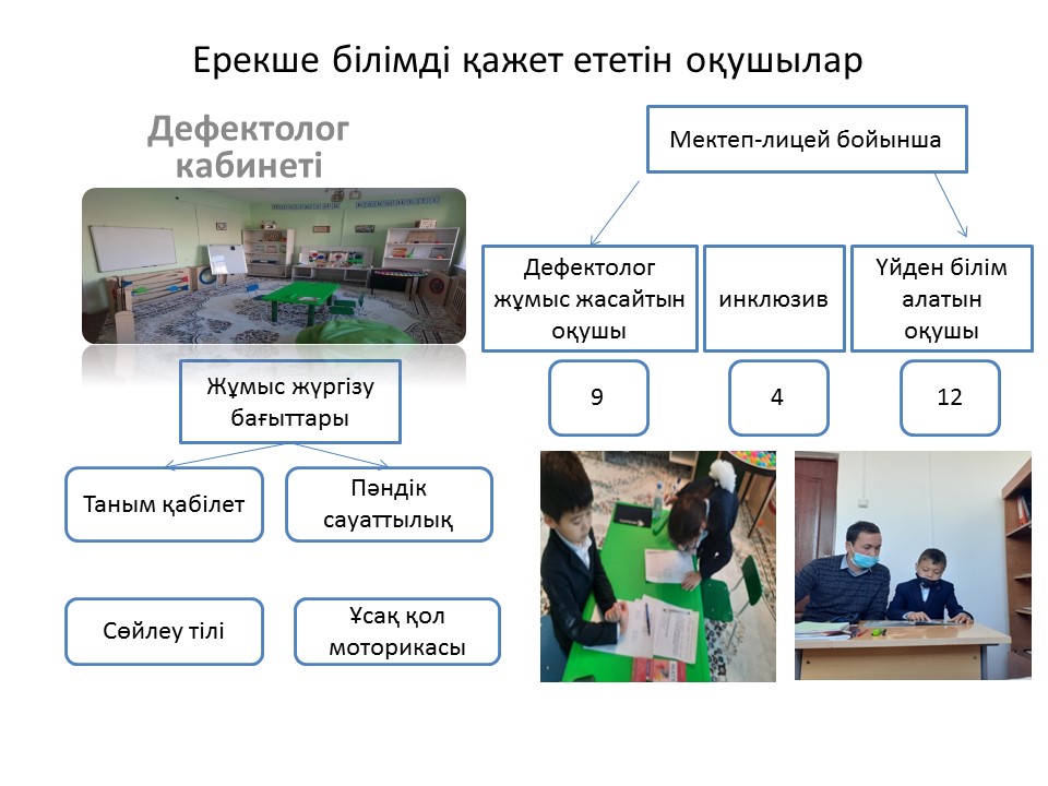 Осы оқу жылында яғни, 2021-2022 оқу жылы мектебімізде «Инклюзив кабинеті» ашылды. Ерекше білімді қажет ететін оқушылар осында топтық және жеке сабақ ала алады.